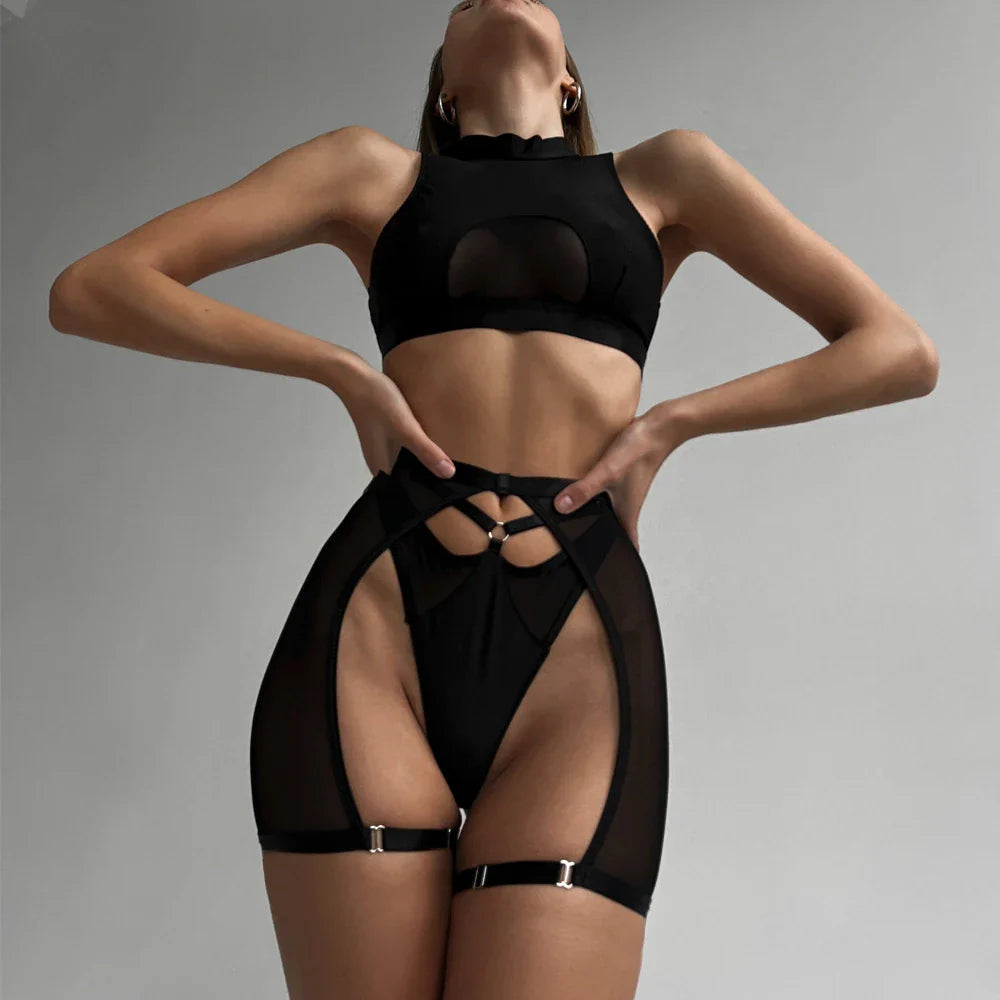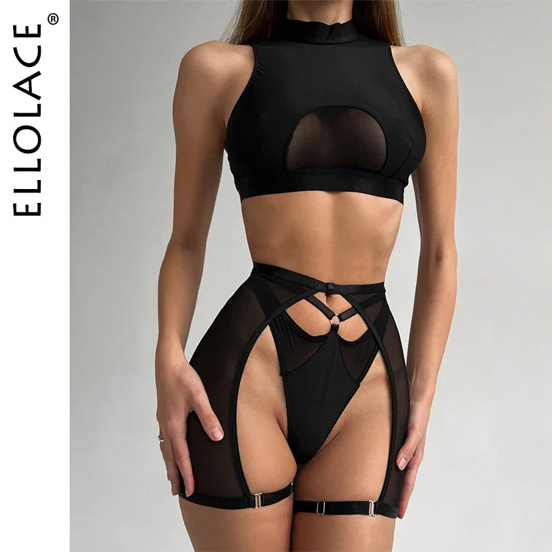 Ellolace Sexy Lingerie Set Woman 3 Pieces Vest Top Seamless Underwear Garter Belt Set Thong Black Intimate Exotic Sets