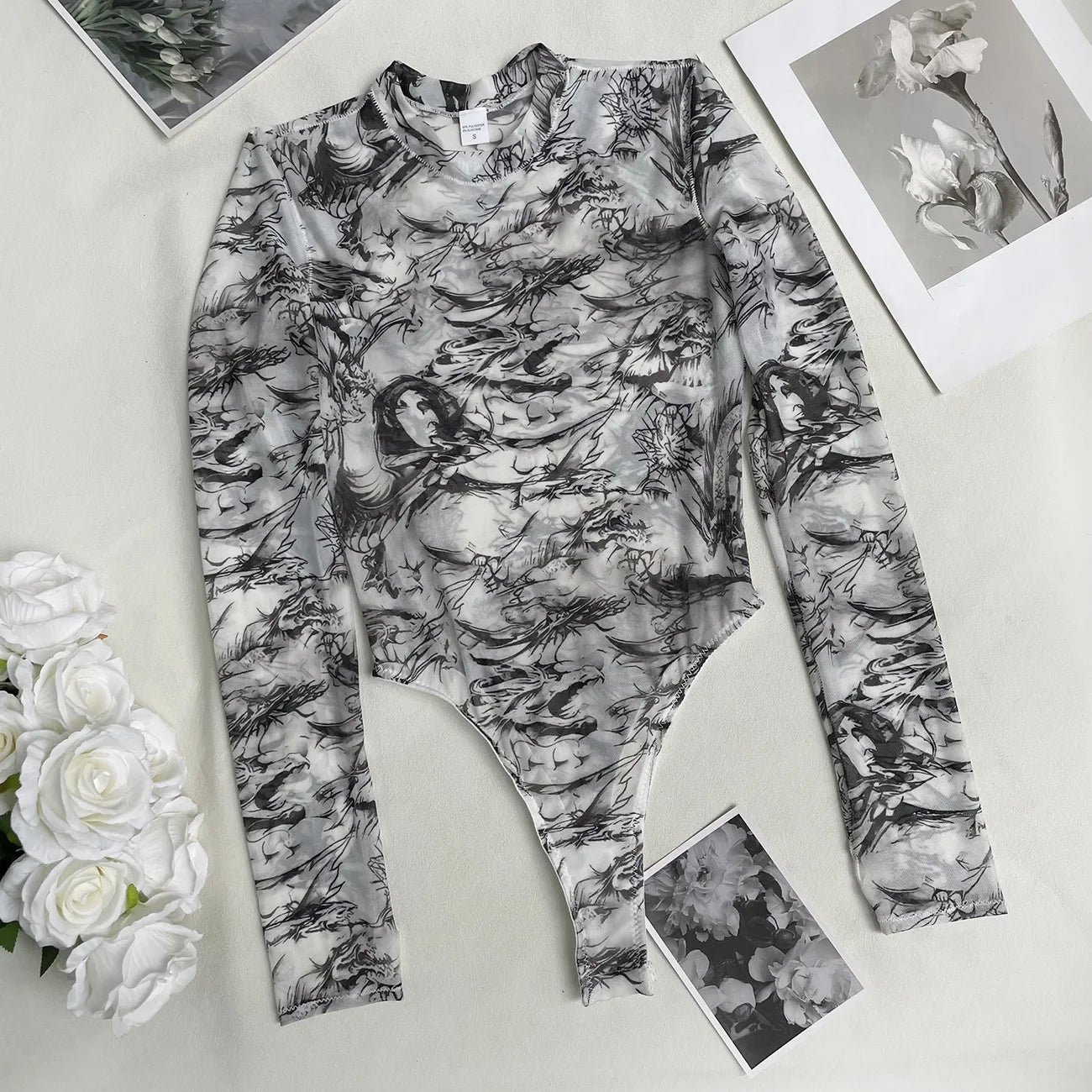 Ellolace Tie Dye Bodysuit Long Sleeve Lingerie Body Uncensored Tight Fitting Woman Crotchless Mesh Sexy Tops See Through Outfit