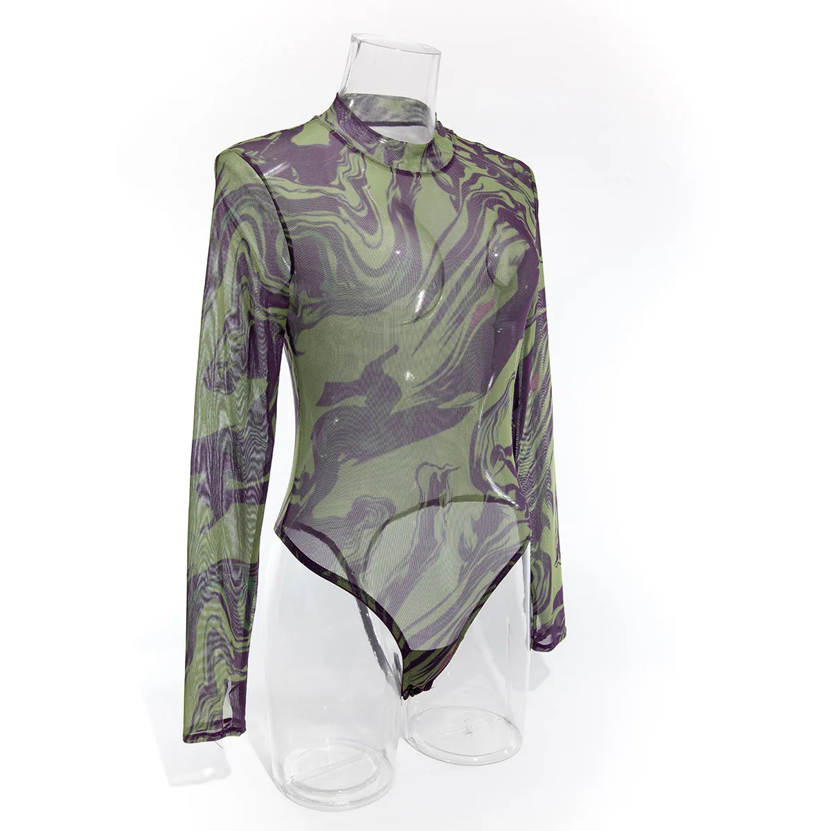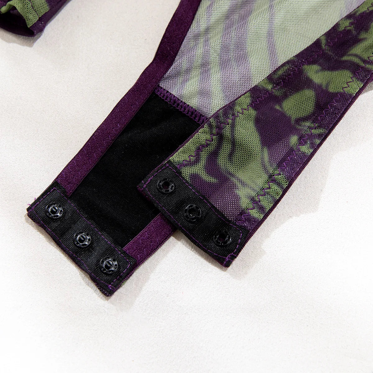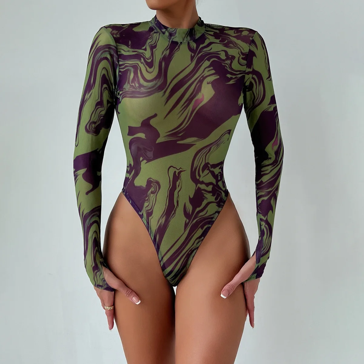 Ellolace Tie Dye Sexy Body Woman 2024 Long Sleeve One Piece Girl Body Seamless Sissy Tops Crotchless Tight High Cut Ladies Cloth