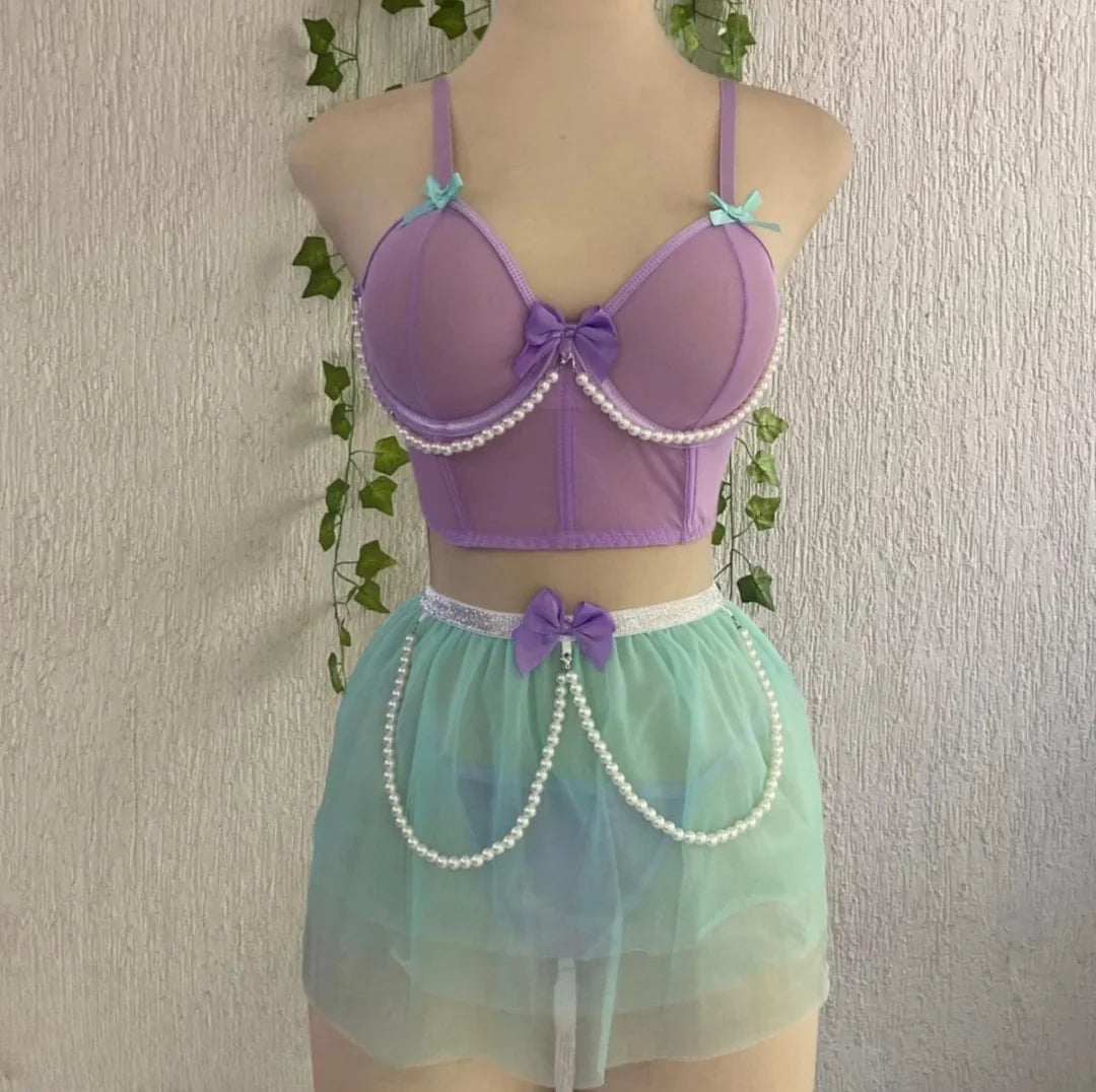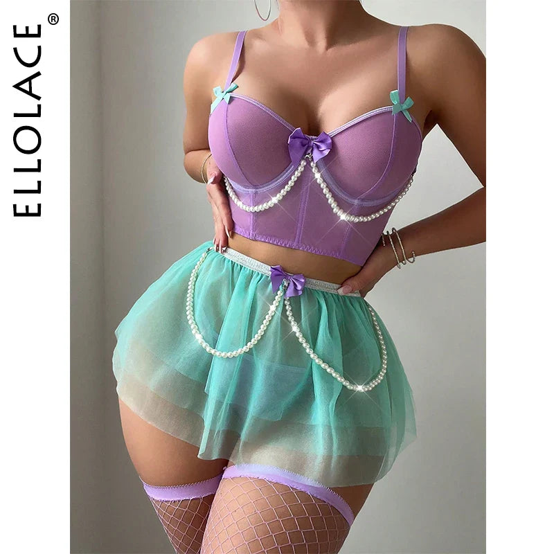 Ellolace Tulle Beautiful Lingerie Contrast Color Bowknot & Faux Pearl Decor Sexy Outfits Garter Stocking Fairy Exotic 4-Piece