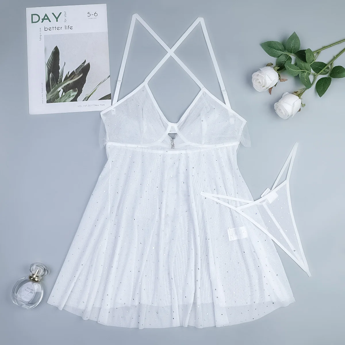 Ellolace White Night Dress With Diamond Lace Sexy Sleepwear Outfits Fantasy See Through Nightwear Attractive Nighty For Women