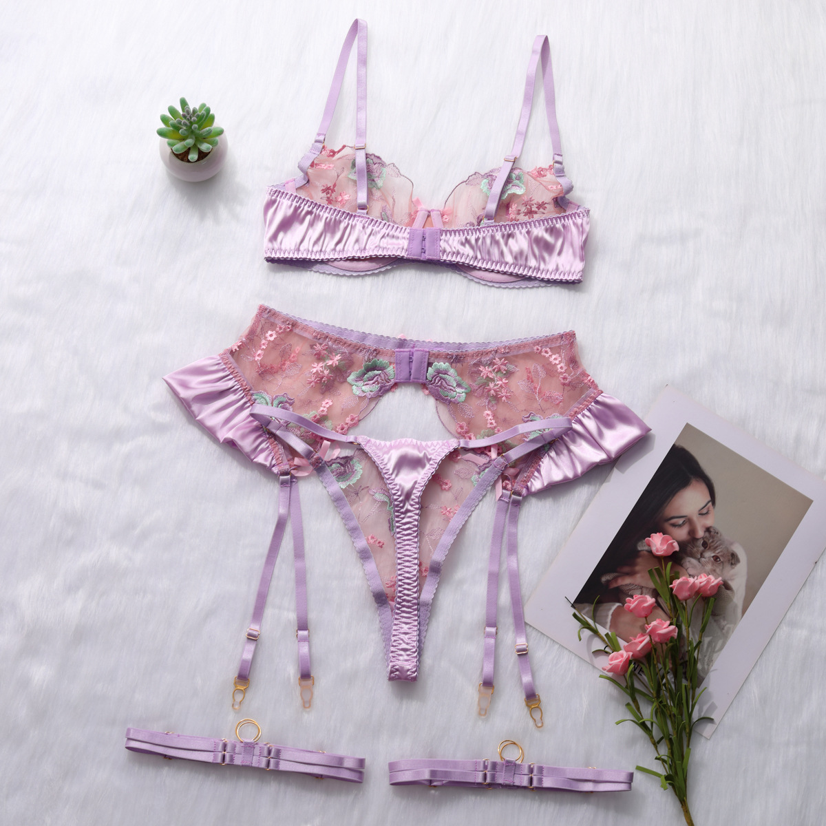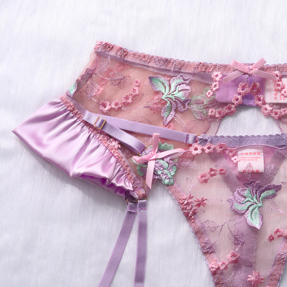 Embroidery Floral Bow Tie Stitching Satin Sexy Lingerie Four Piece Set