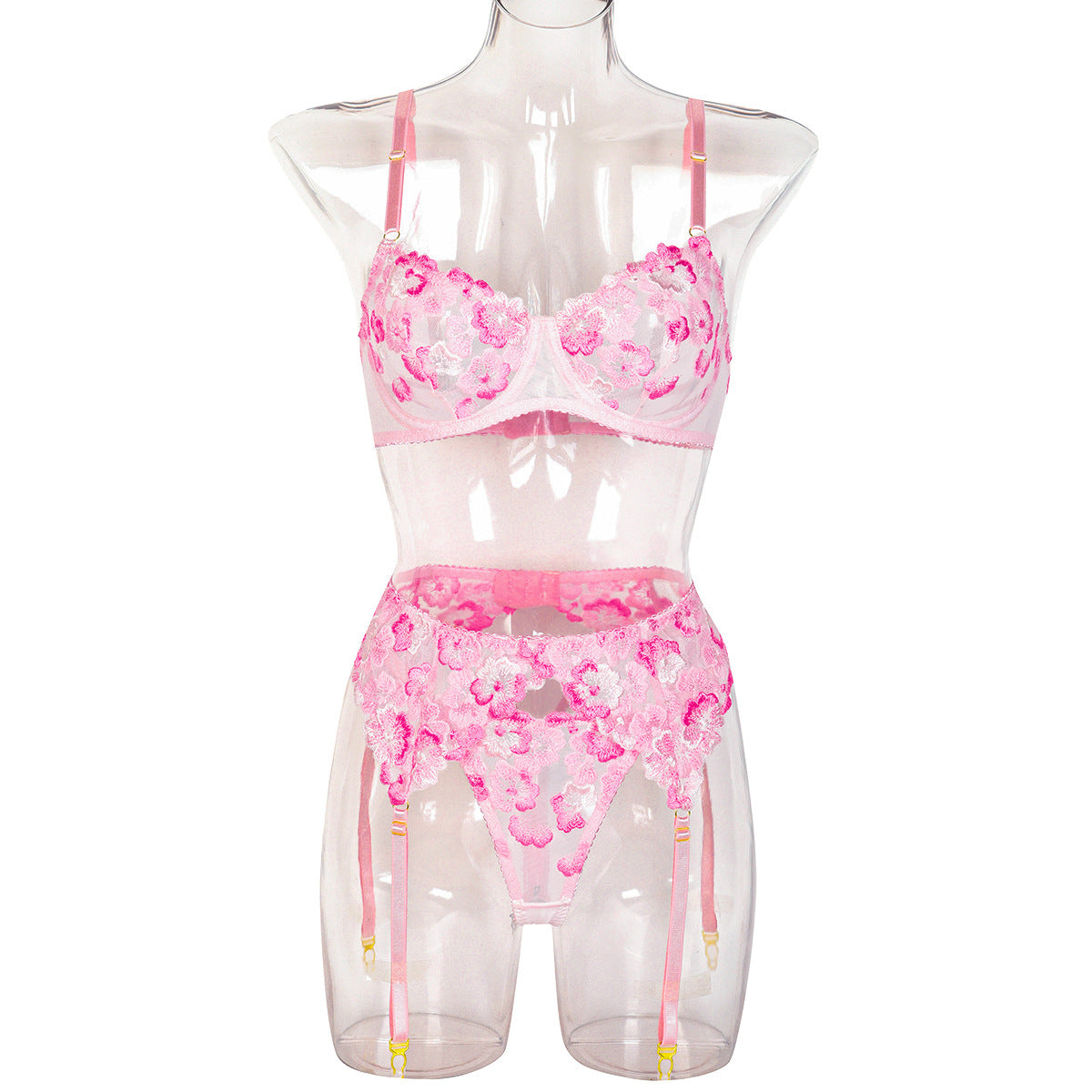 Exquisite Floral Embroidery See-through Sexy Three-Piece Set Sexy Lingerie