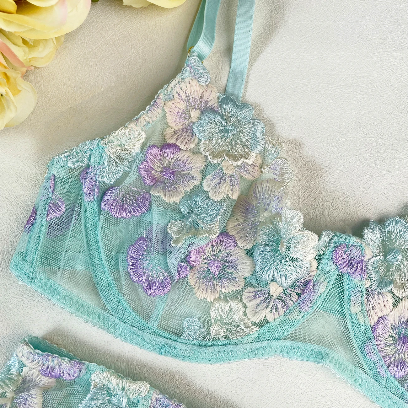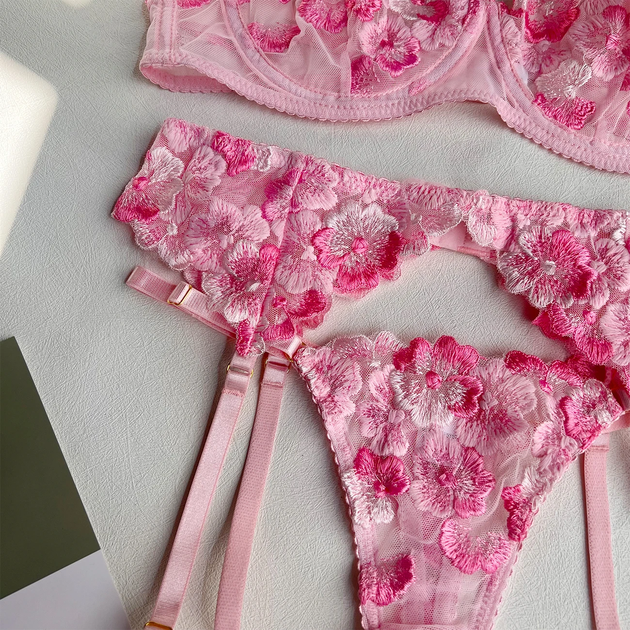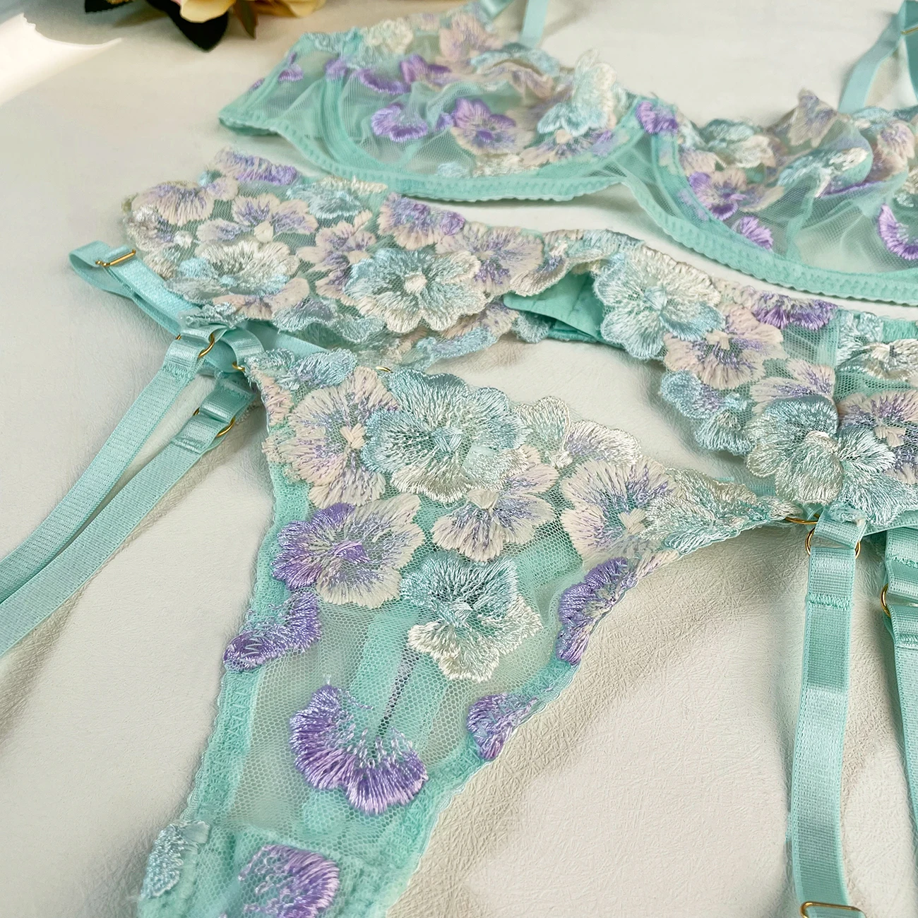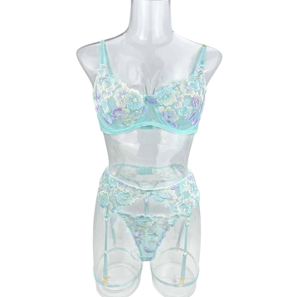 Fancy Lingerie Floral Embroidery Underwear 3-Piece Luxury Lace Garter Brief Sets Bra And Panty y Outfit Intimate