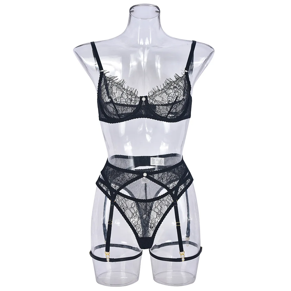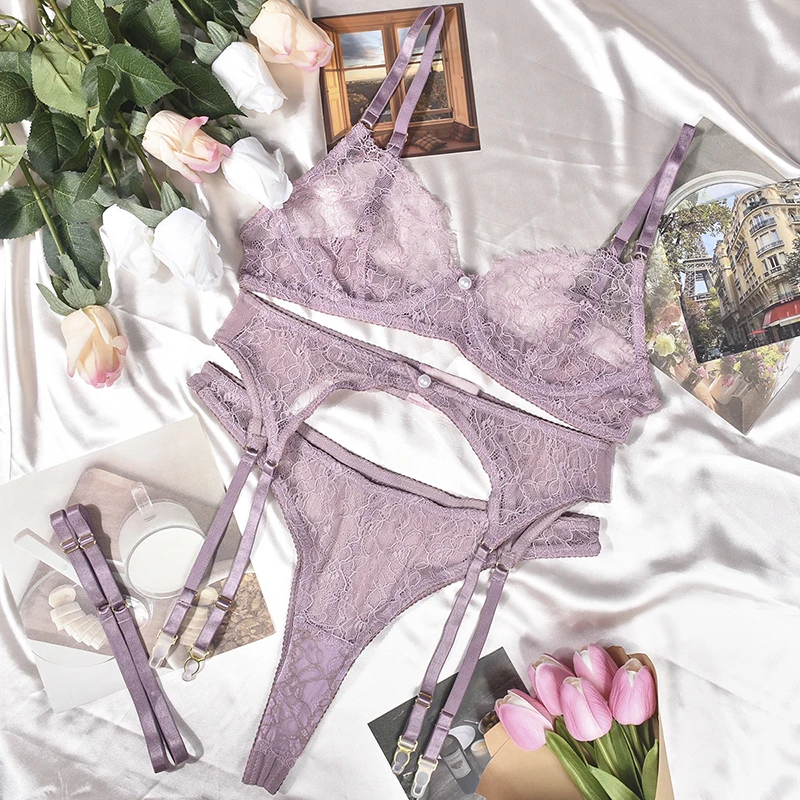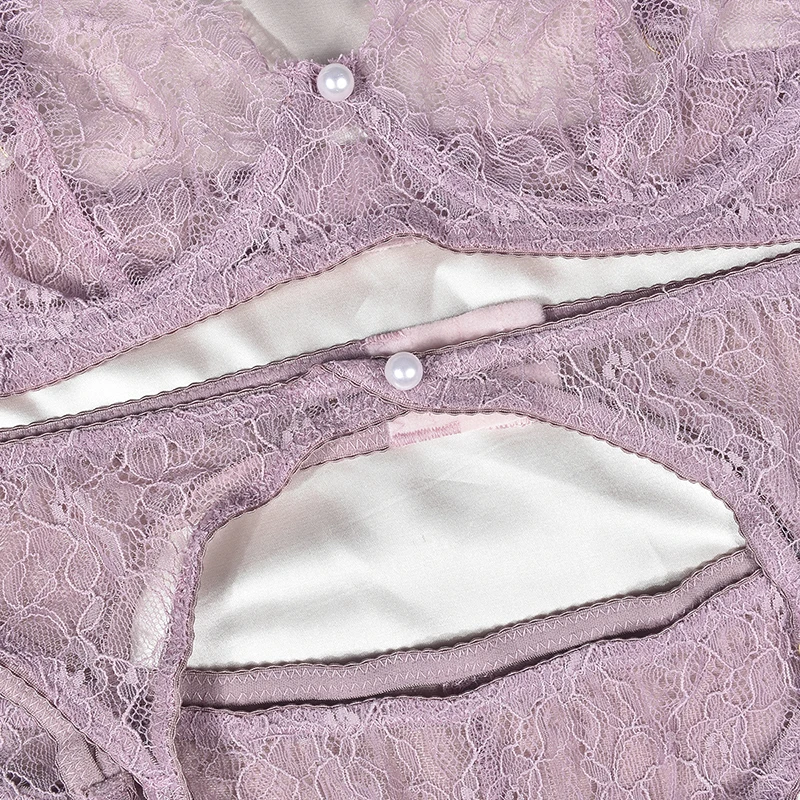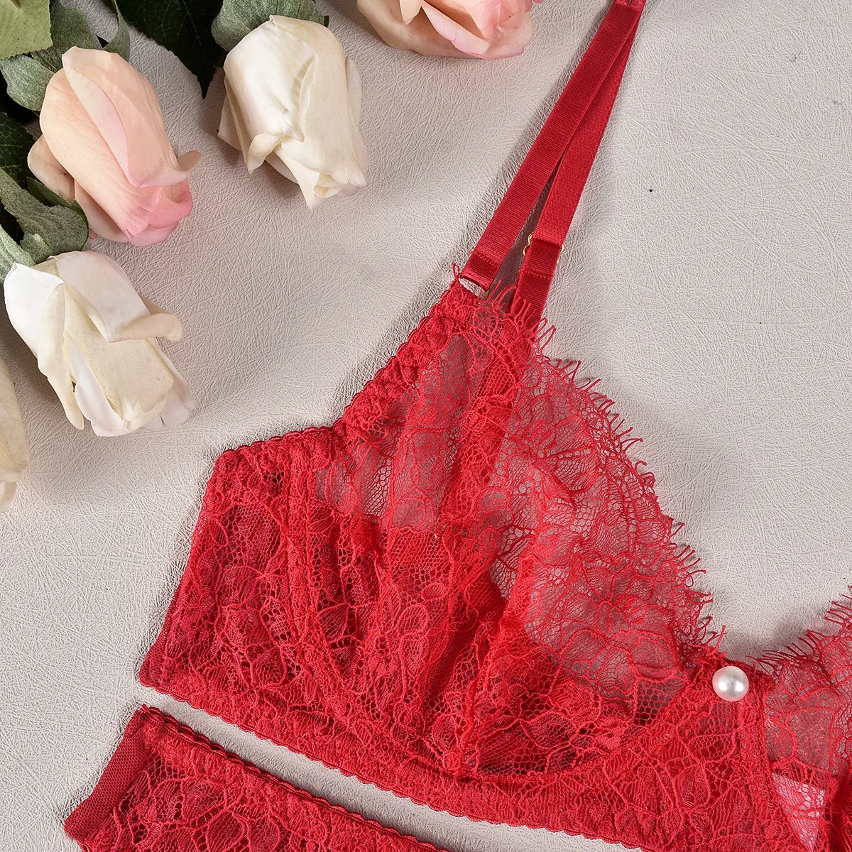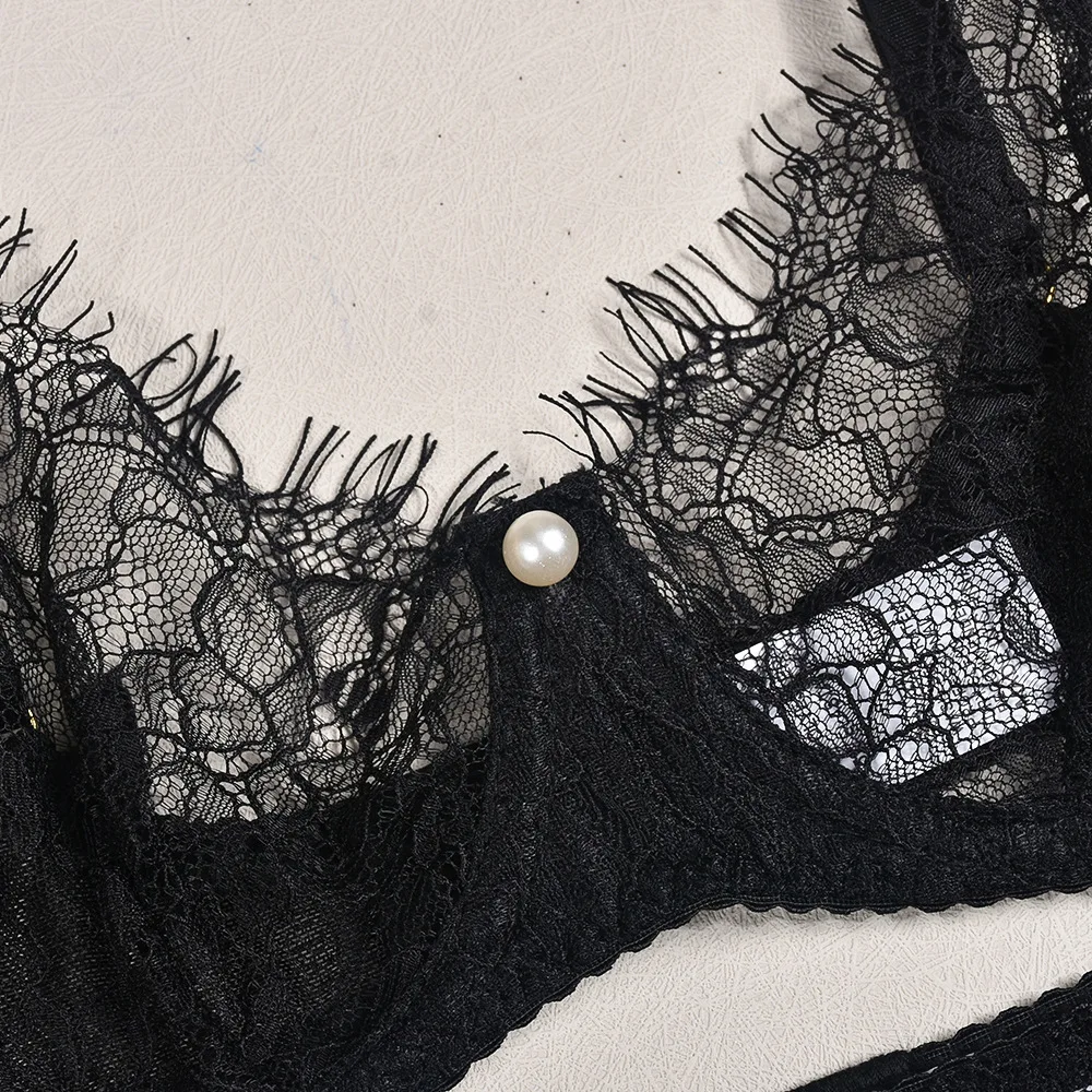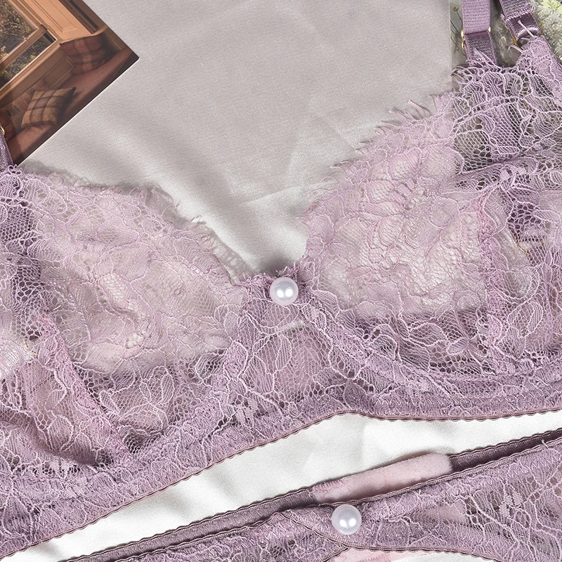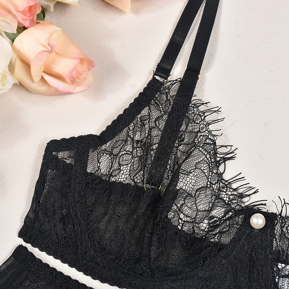 Fancy Lingerie Lace Seamless Underwear Pearly See Through Intim Goods Solid Bra And Panty Set Garters Outfit
