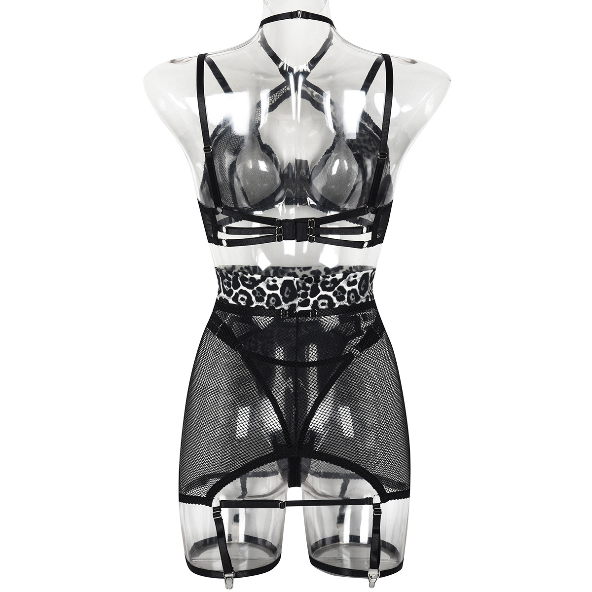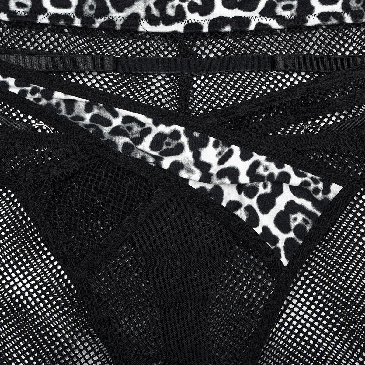 Fishnet Leopard Splicing Mesh Hollow Out Cutout Out Halter Cross Sexy Lingerie Three Piece Set Women