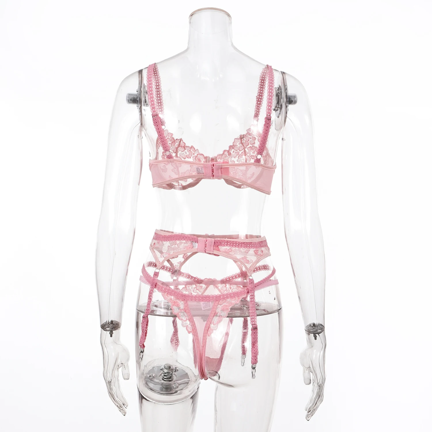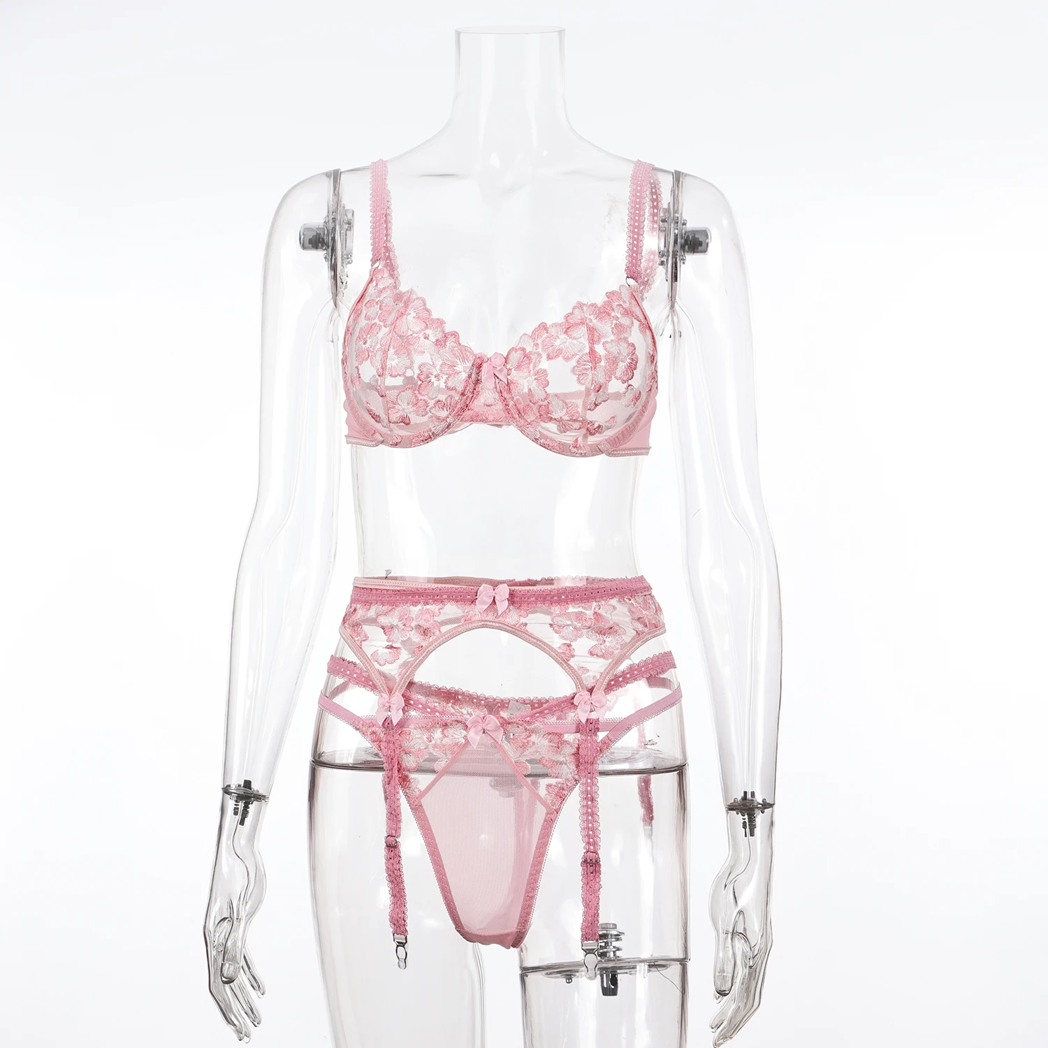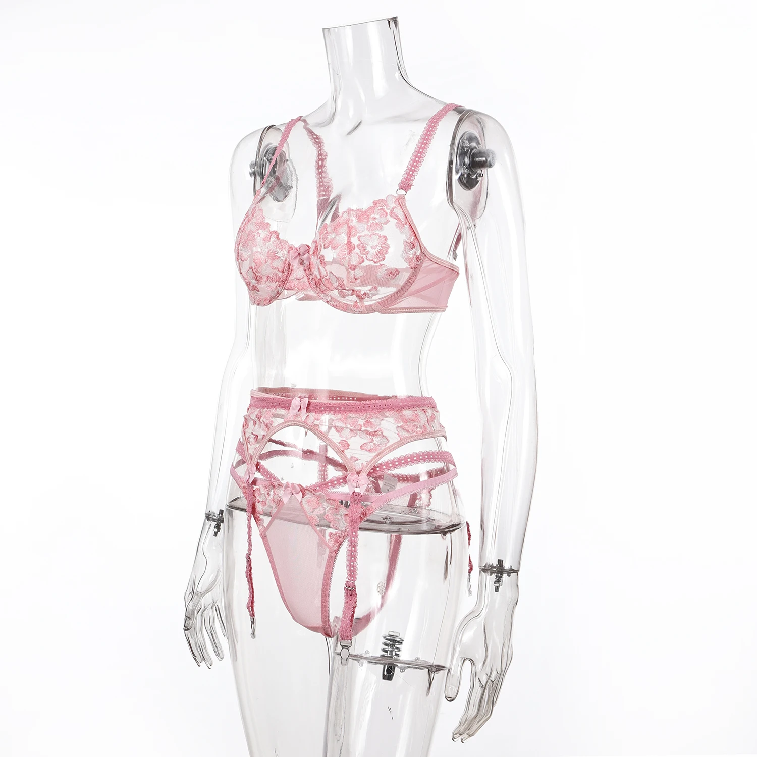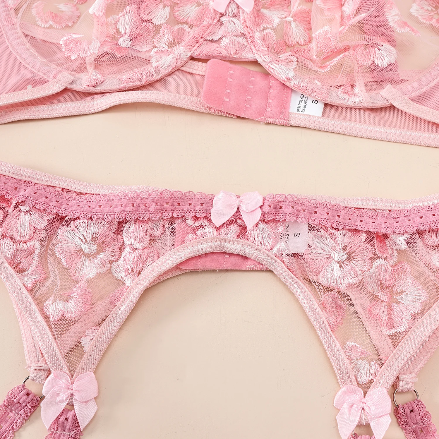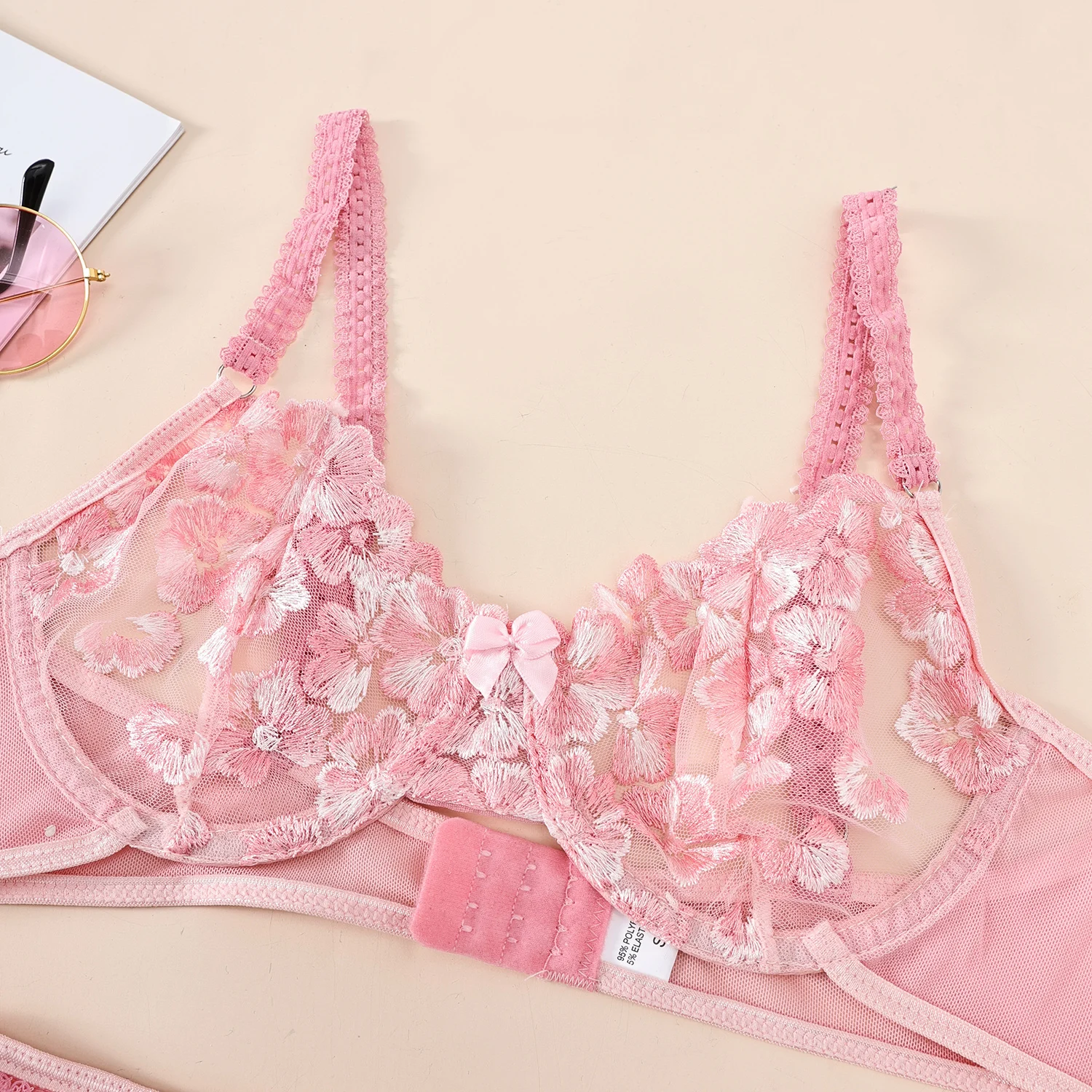 Floral Lingerie Lace Embroidery Well-Looking Underwear Fancy Pink Costume Nighty For Wife Bra And Panty Set
