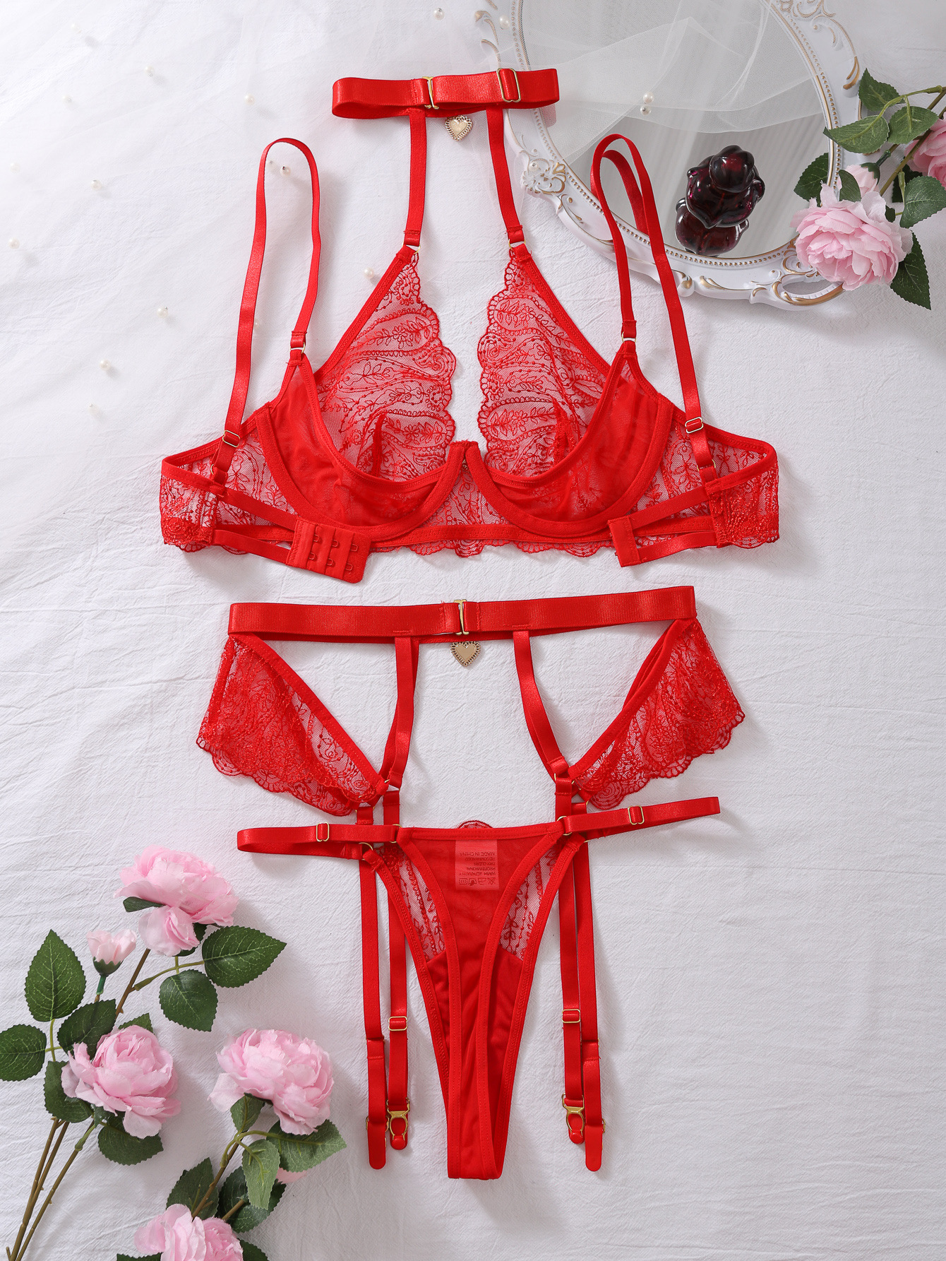 High Quality Bra Complex Craft See through Embroidery Love Embellished Sexy Underwear Three Piece Set