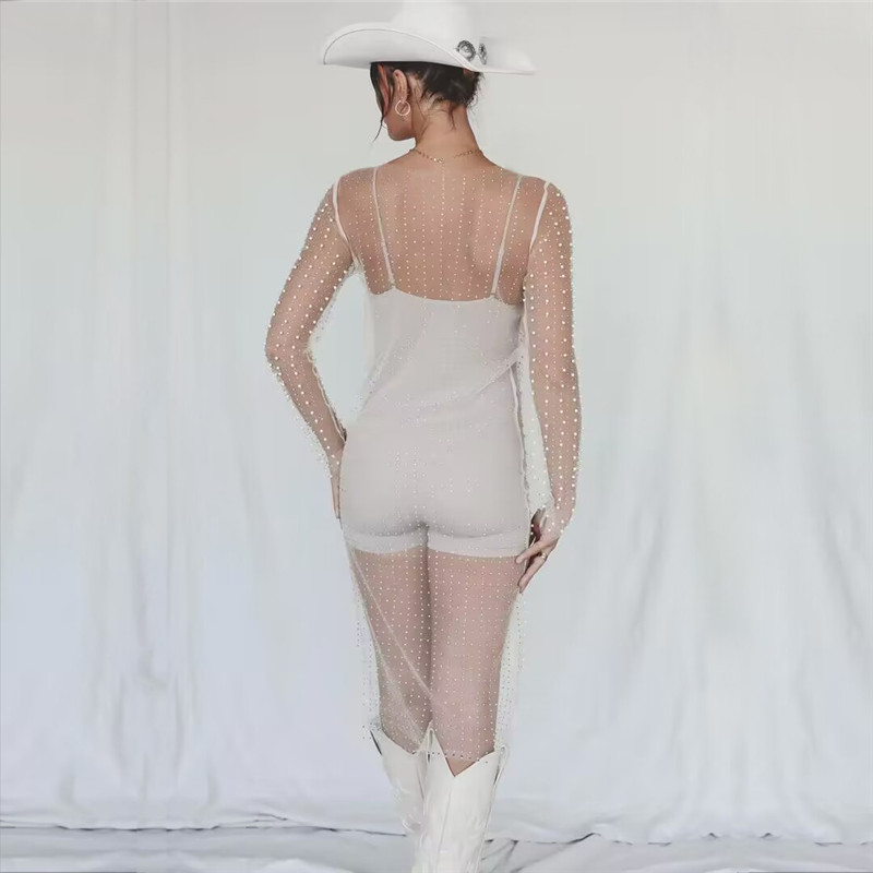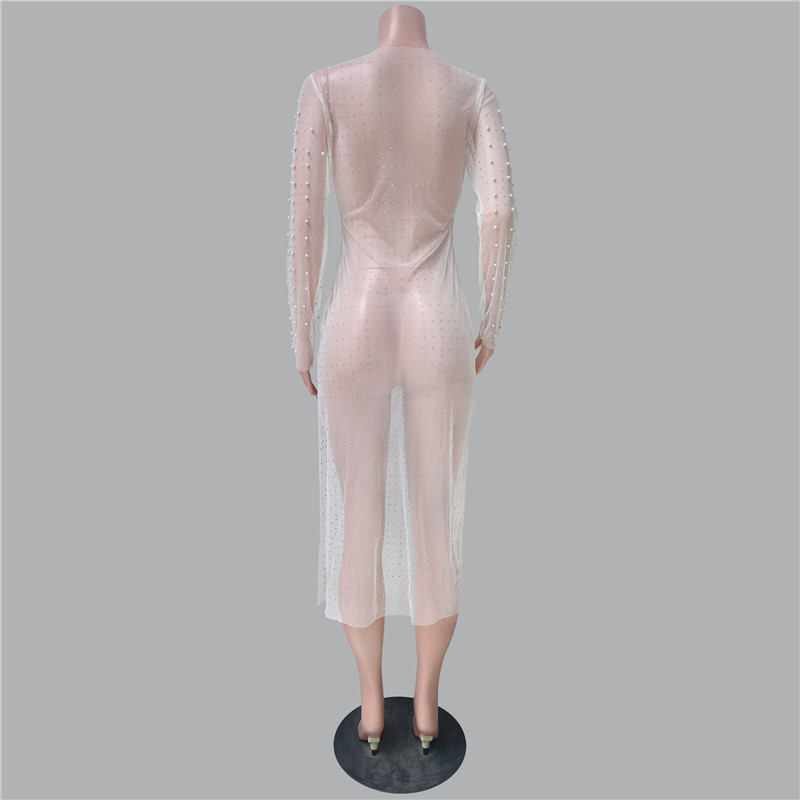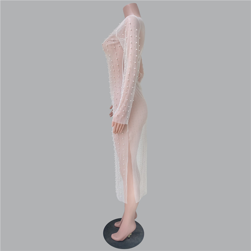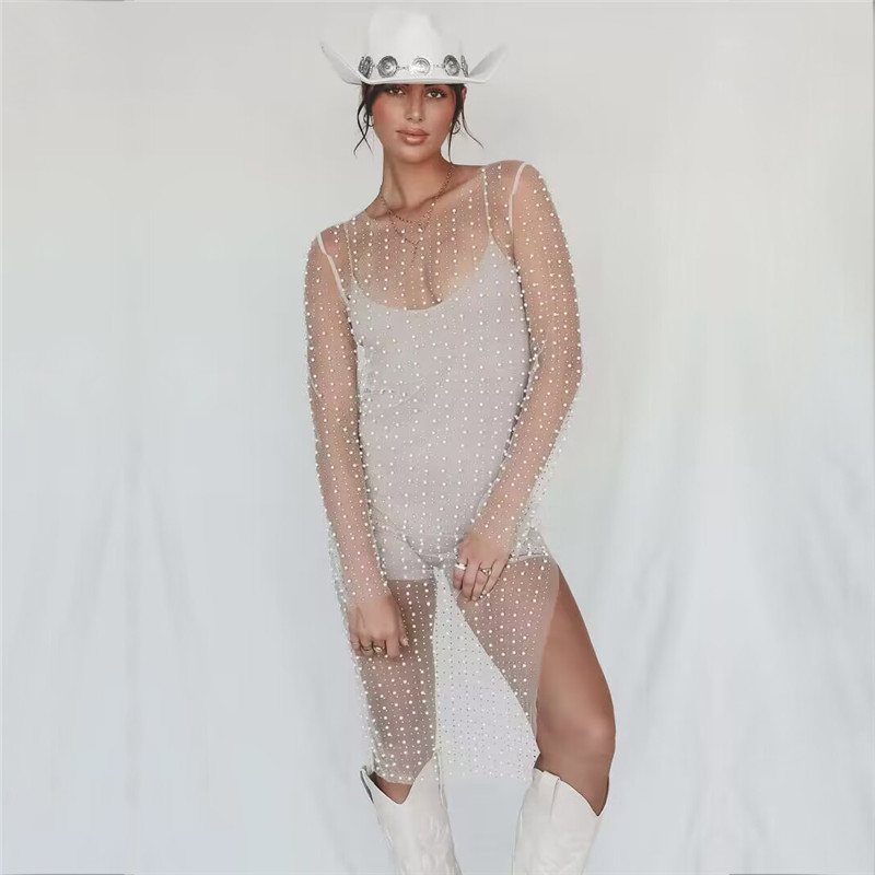 hirigin Women's Sexy Mesh Rhinestone Pearl Dress Side Slit Sheer See Through Midi Dress Holiday Beach Cover Up Dresses
