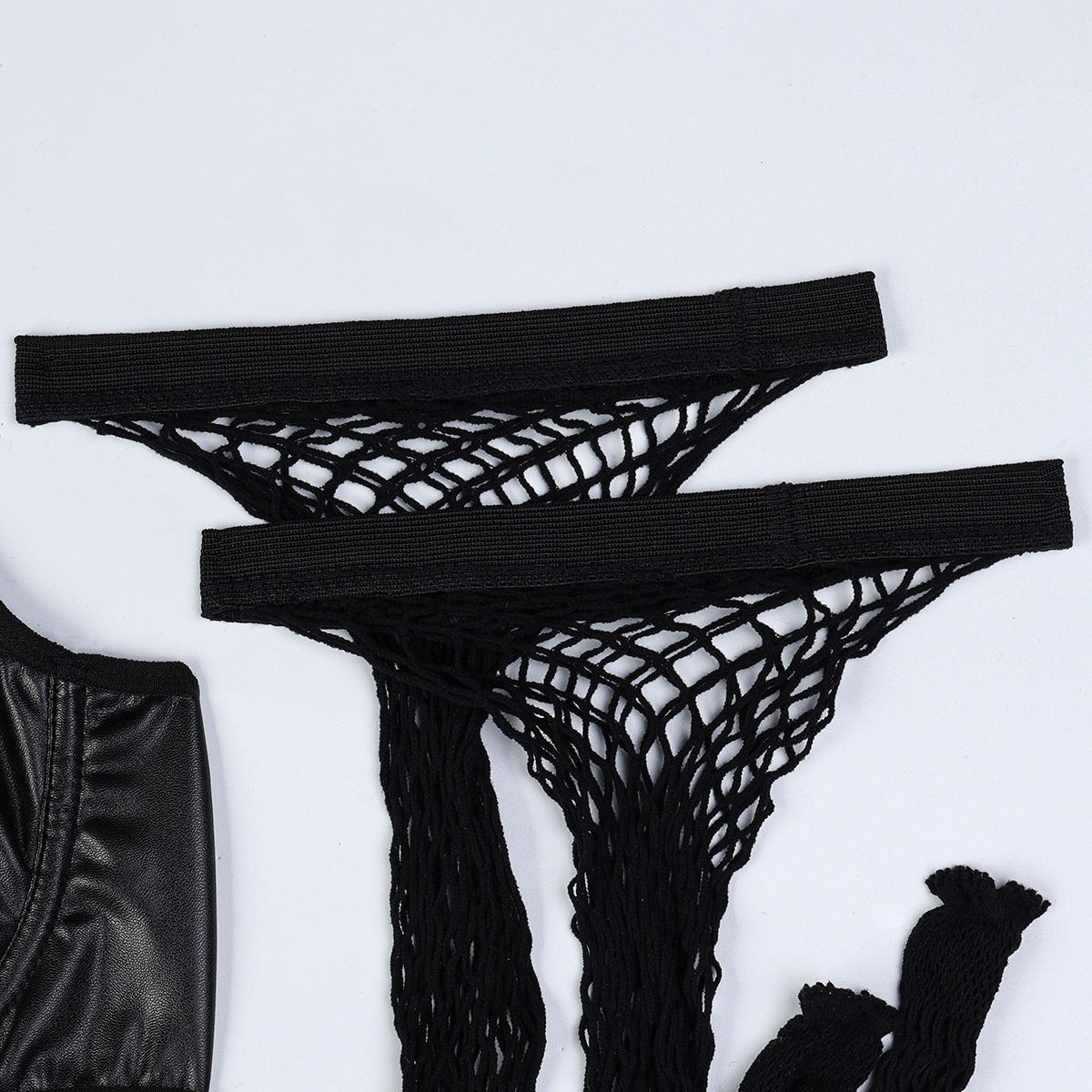 Hollow Out Cutout Out Mesh Stockings Black Faux Leather Long Soft Leather Micro Elastic Side Strap Love Cross Sexy Jumpsuit Women