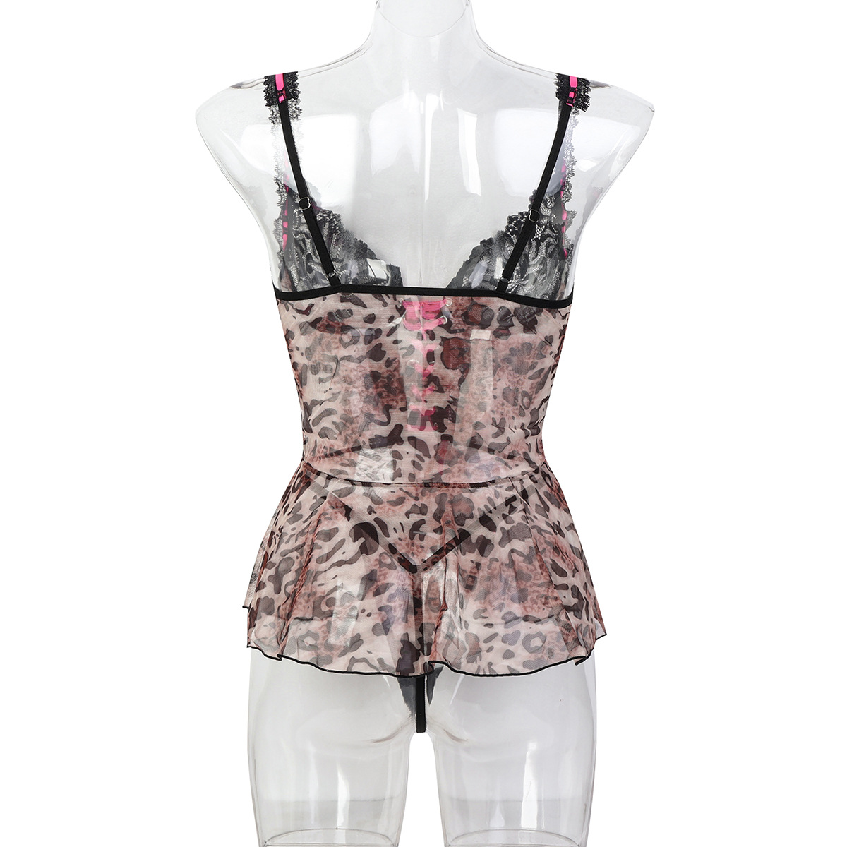Home Wear Leopard Print See through Mesh Tie Ribbon Cross Two Piece Pajamas