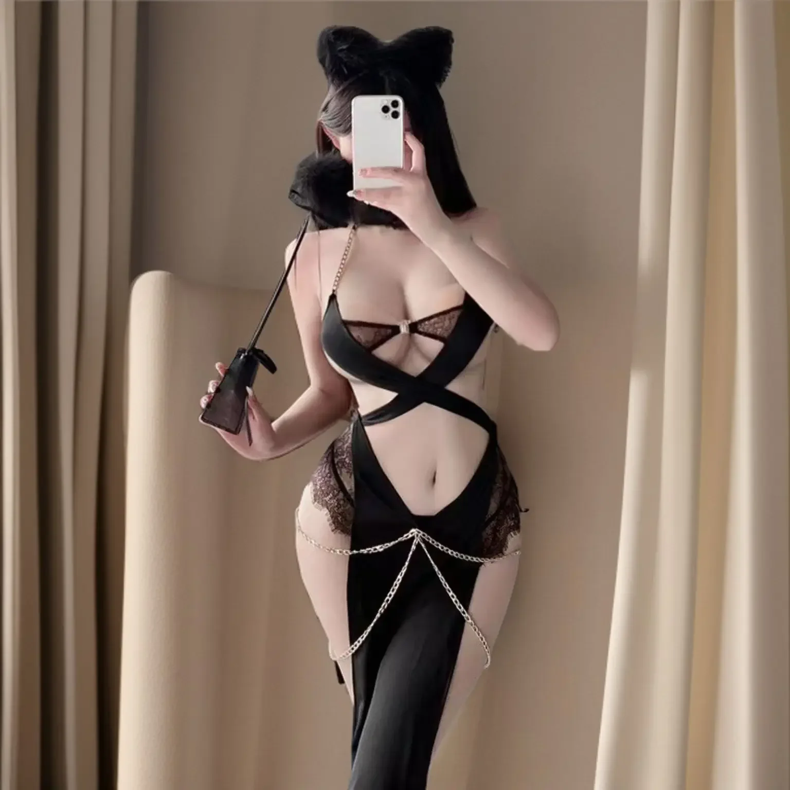 Hot Costume Cosplay Cat Girl Women Lingerie Set Dress Bodysuit Women Underwear Open Sleepwear Bra Set