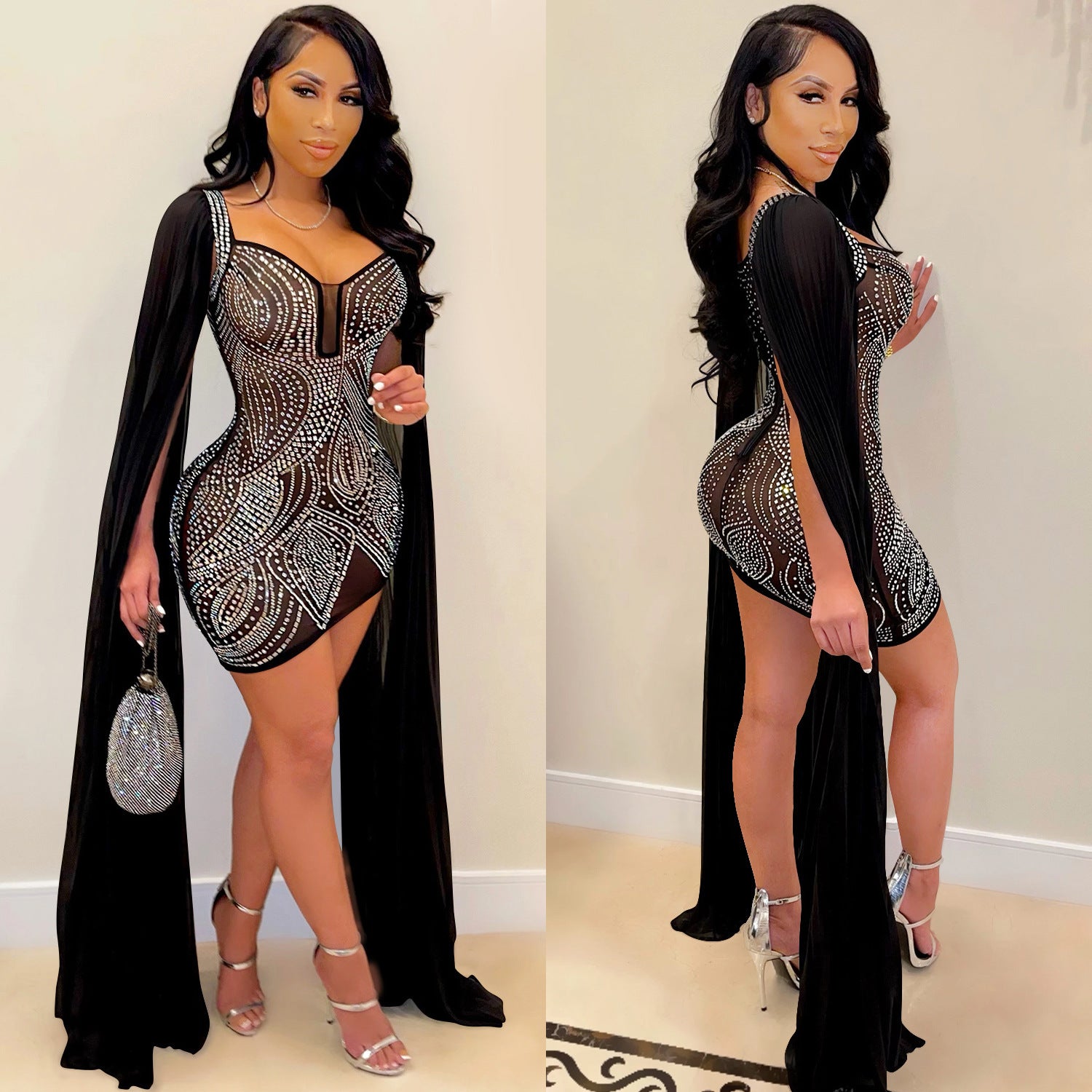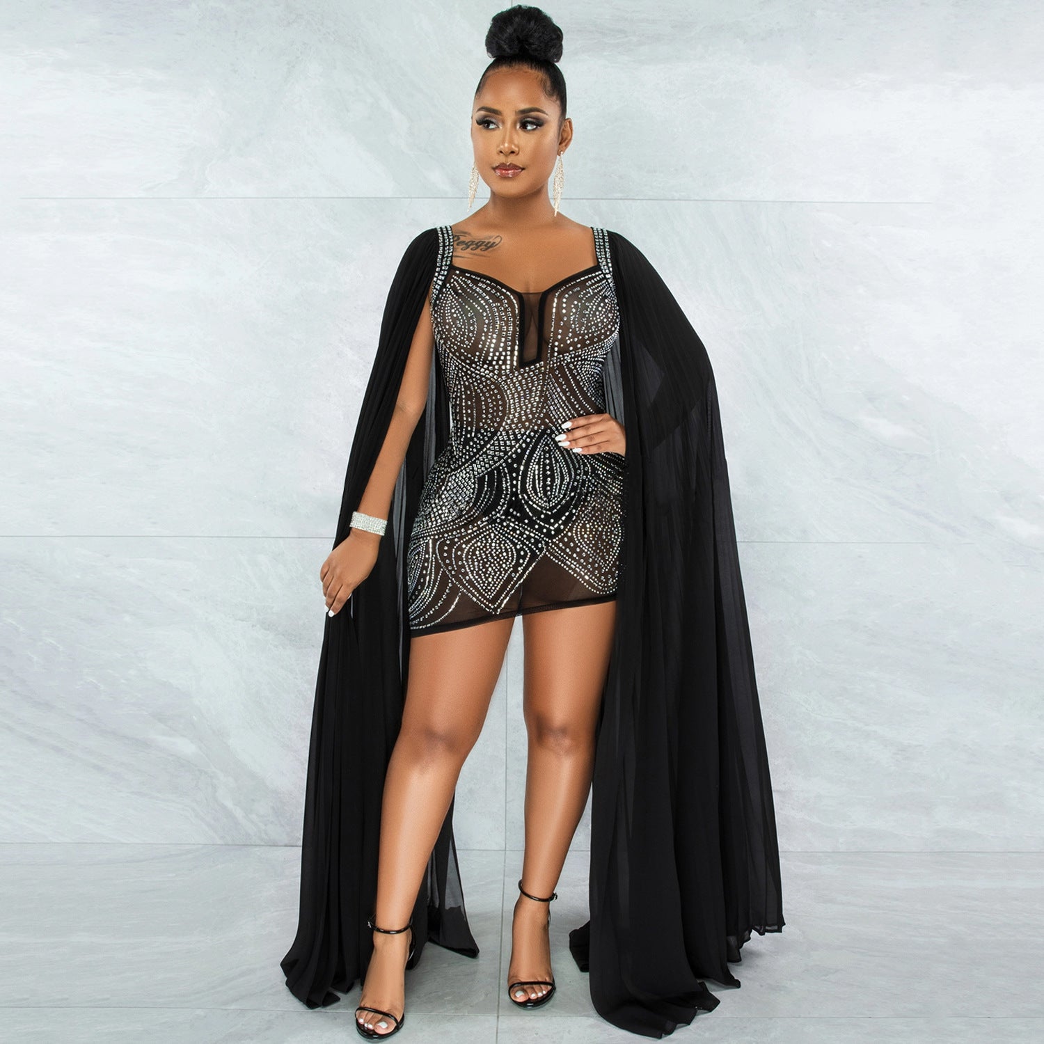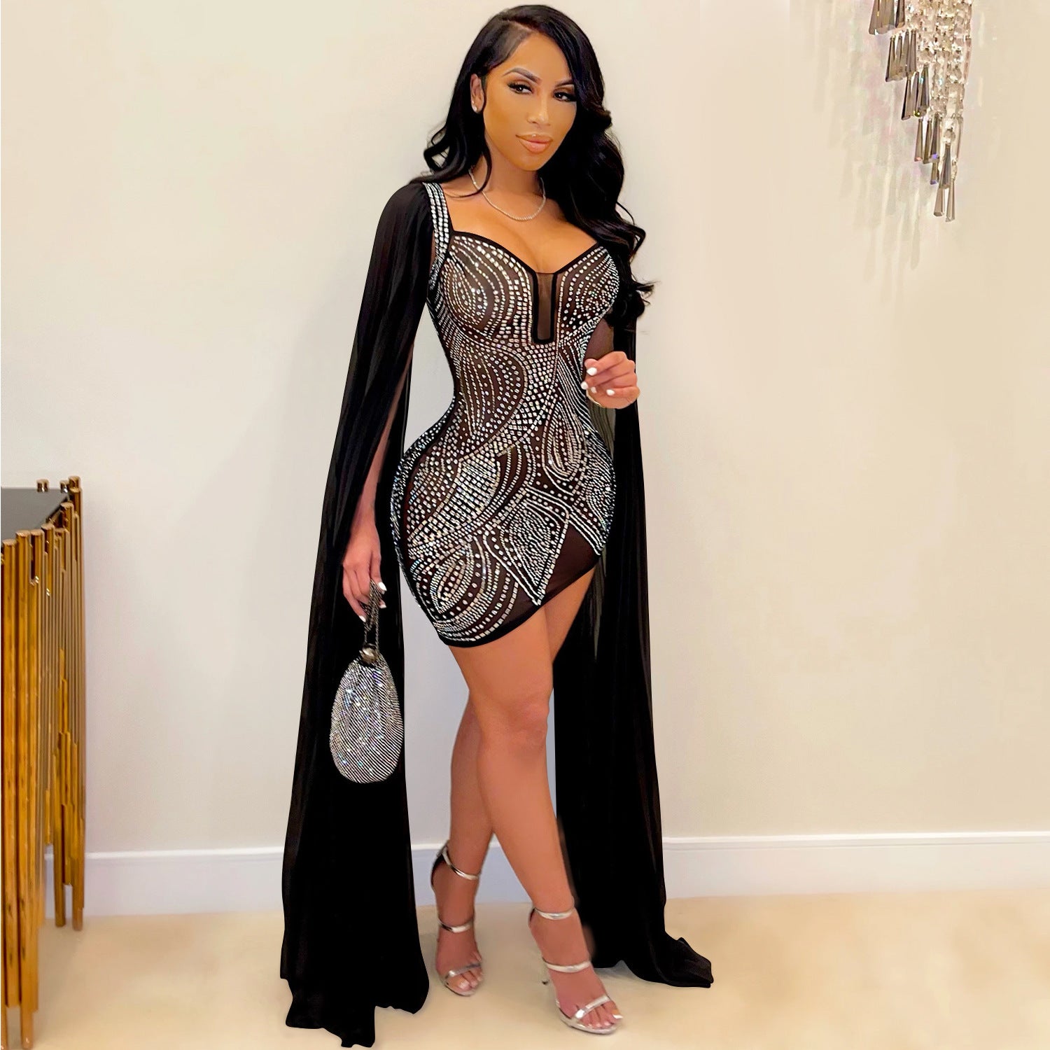 Hot Rhinestone Mesh Nightclub Long Sleeveless Zipper Midi Skirt Dress