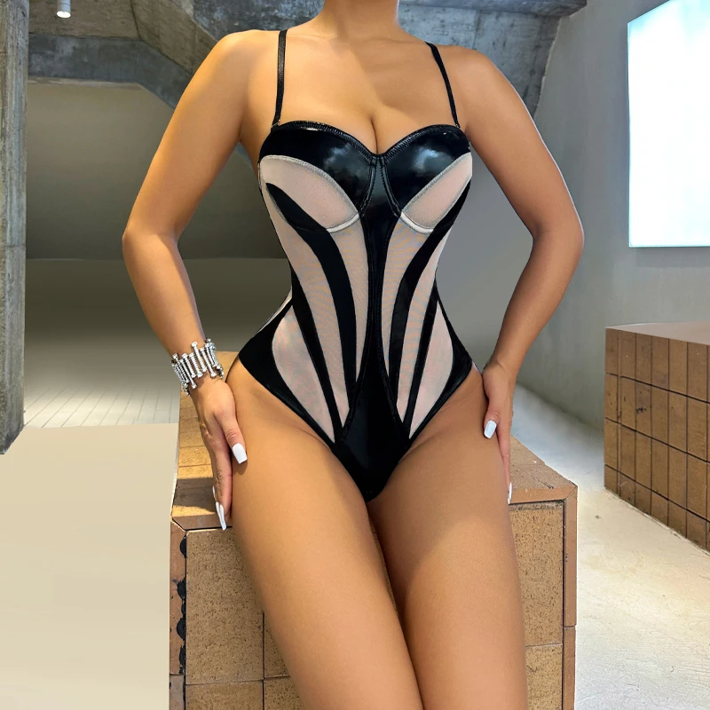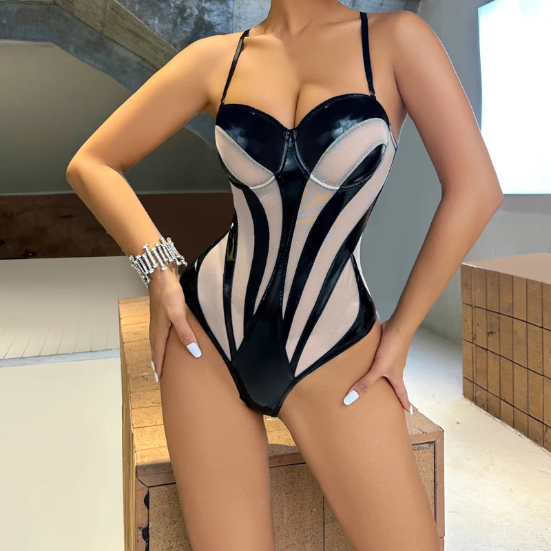Latex Bodysuit Fashion Off Shoulder Lace Up Body Mesh Patchwork Lingerie y Baby Dolls Body Mujer Fantasy Tight