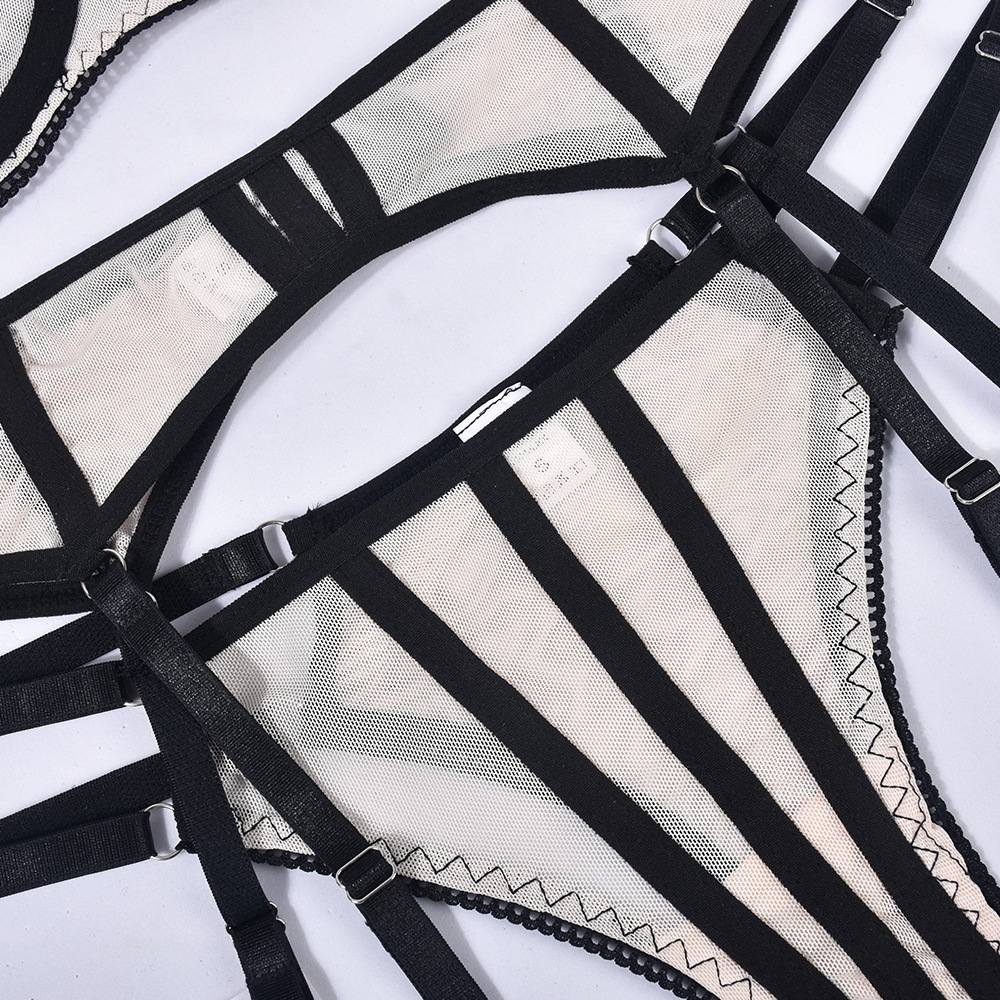 Lingering Sexy Underwear Popular Mesh Contrast Color Bra See through Sexy Three Piece Suit