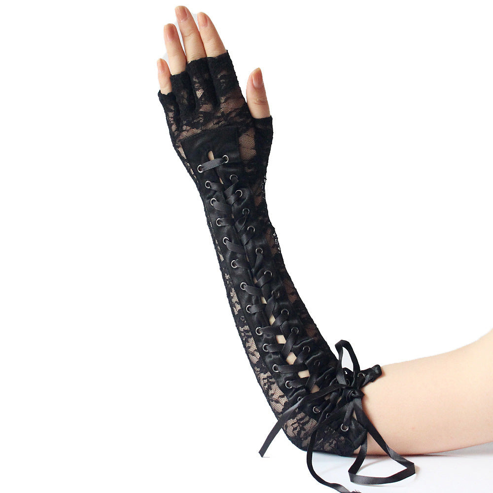 Long Half-Finger Lace Tie Ribbon Rivet Gloves