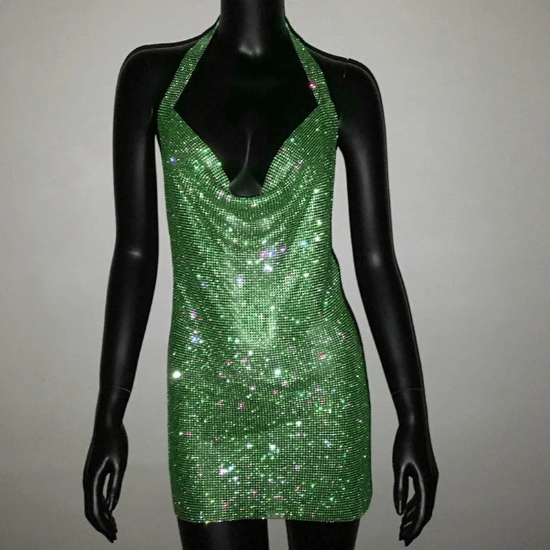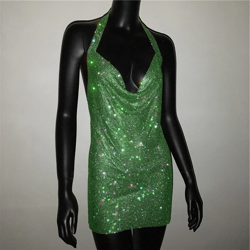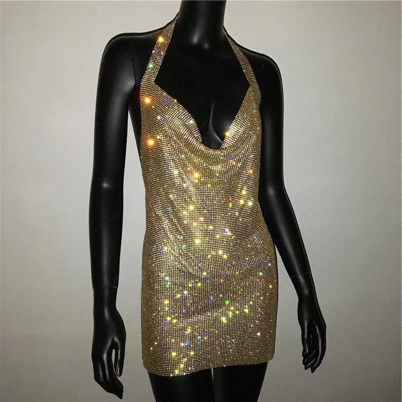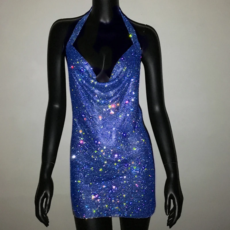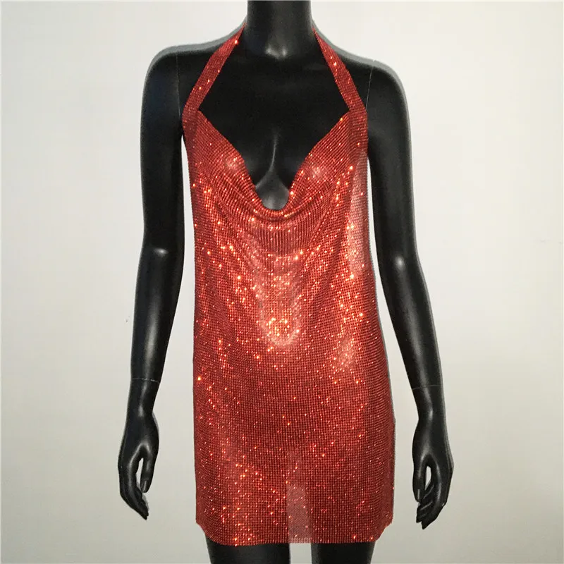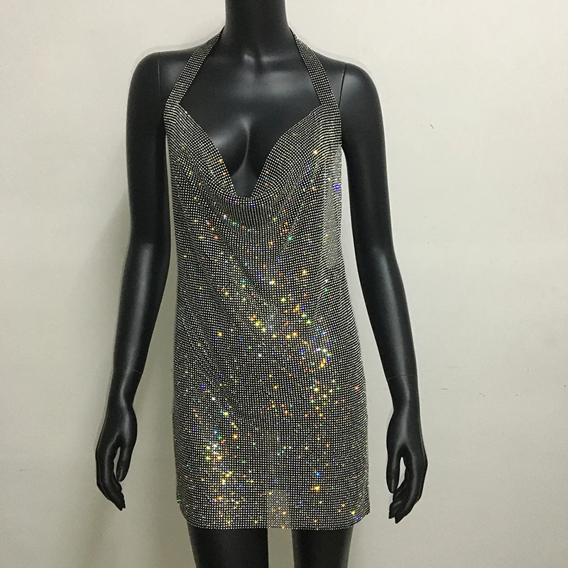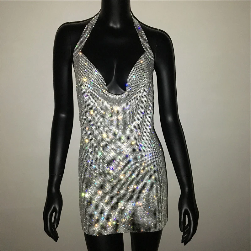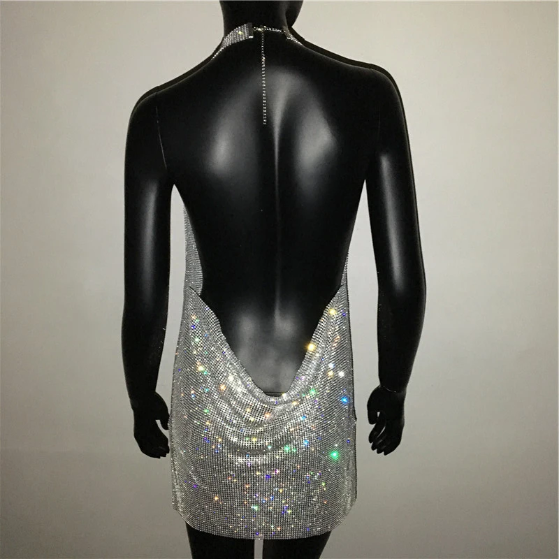 Luxury Crystal Rhinestone Sequins Mini Dress 2023 NEW Women Halter Backless Slit Metal Mesh Cocktail Evening Party Dresses