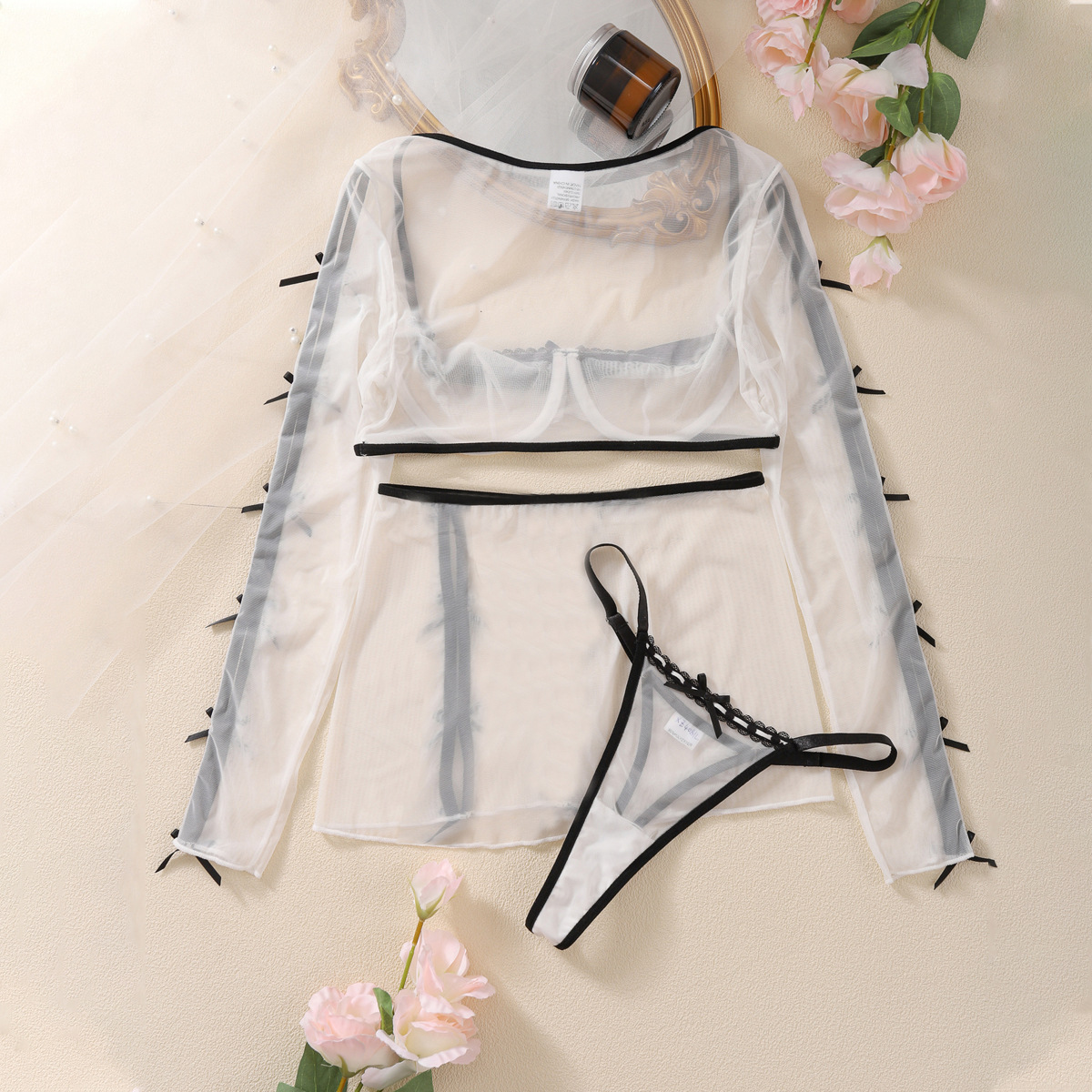 Mesh Contrast Color Sexy Bow Lace up Long Sleeve Halter Underwear See through Hip Skirt Sexy Three Piece Set