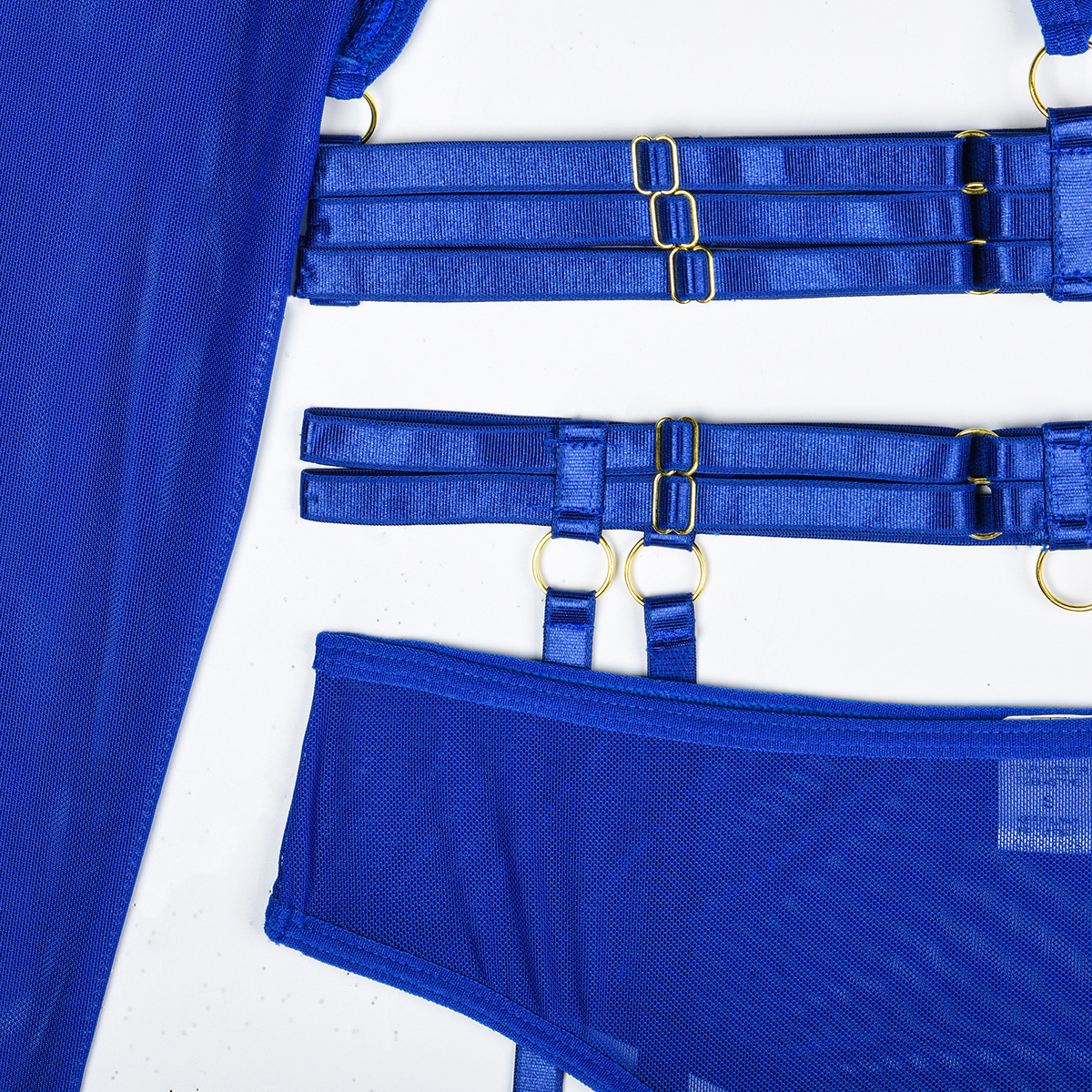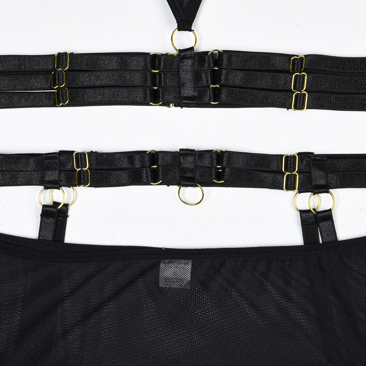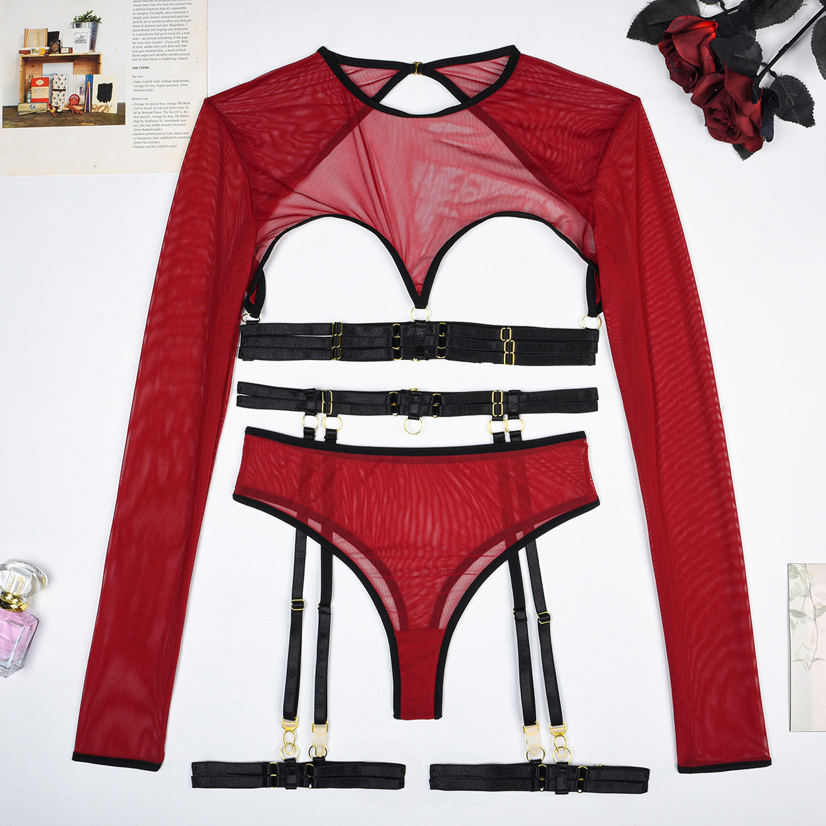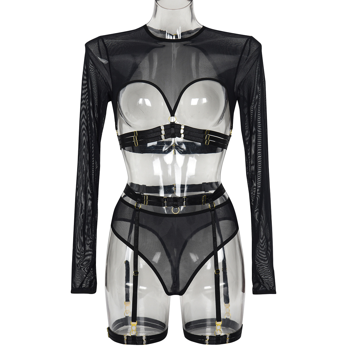 Mesh See through Patchwork Lace up Heavy Craft Complex Three Piece Sexy Lingerie