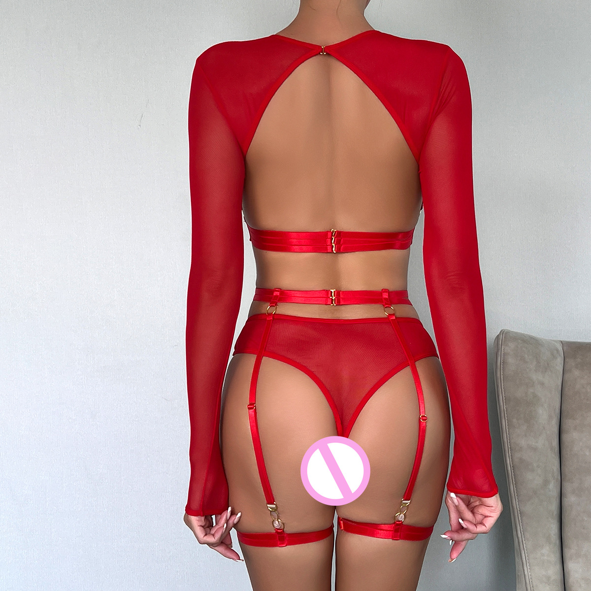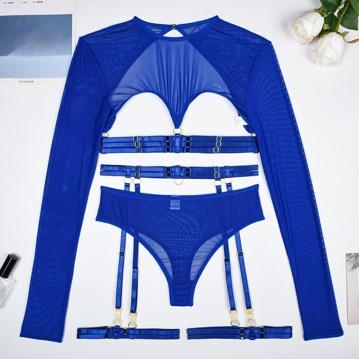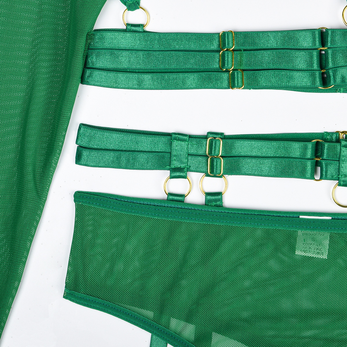 Mesh See through Patchwork Lace up Heavy Craft Complex Three Piece Sexy Lingerie
