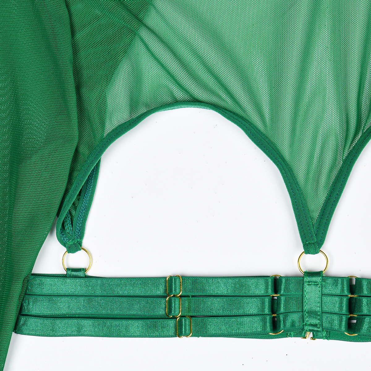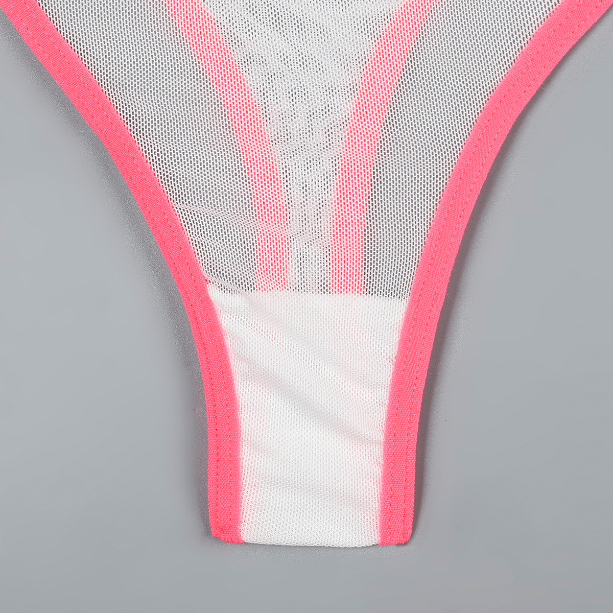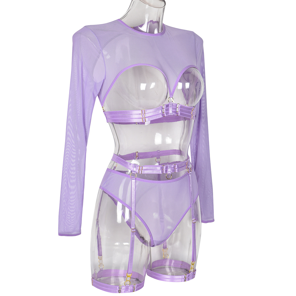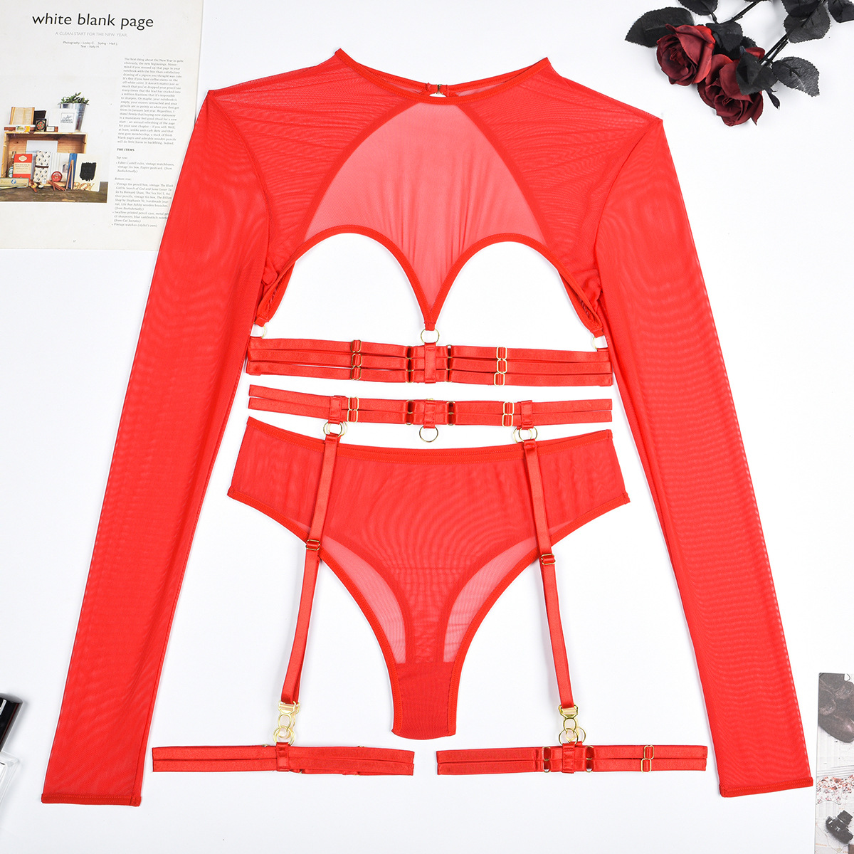 Mesh See through Patchwork Lace up Heavy Craft Complex Three Piece Sexy Lingerie