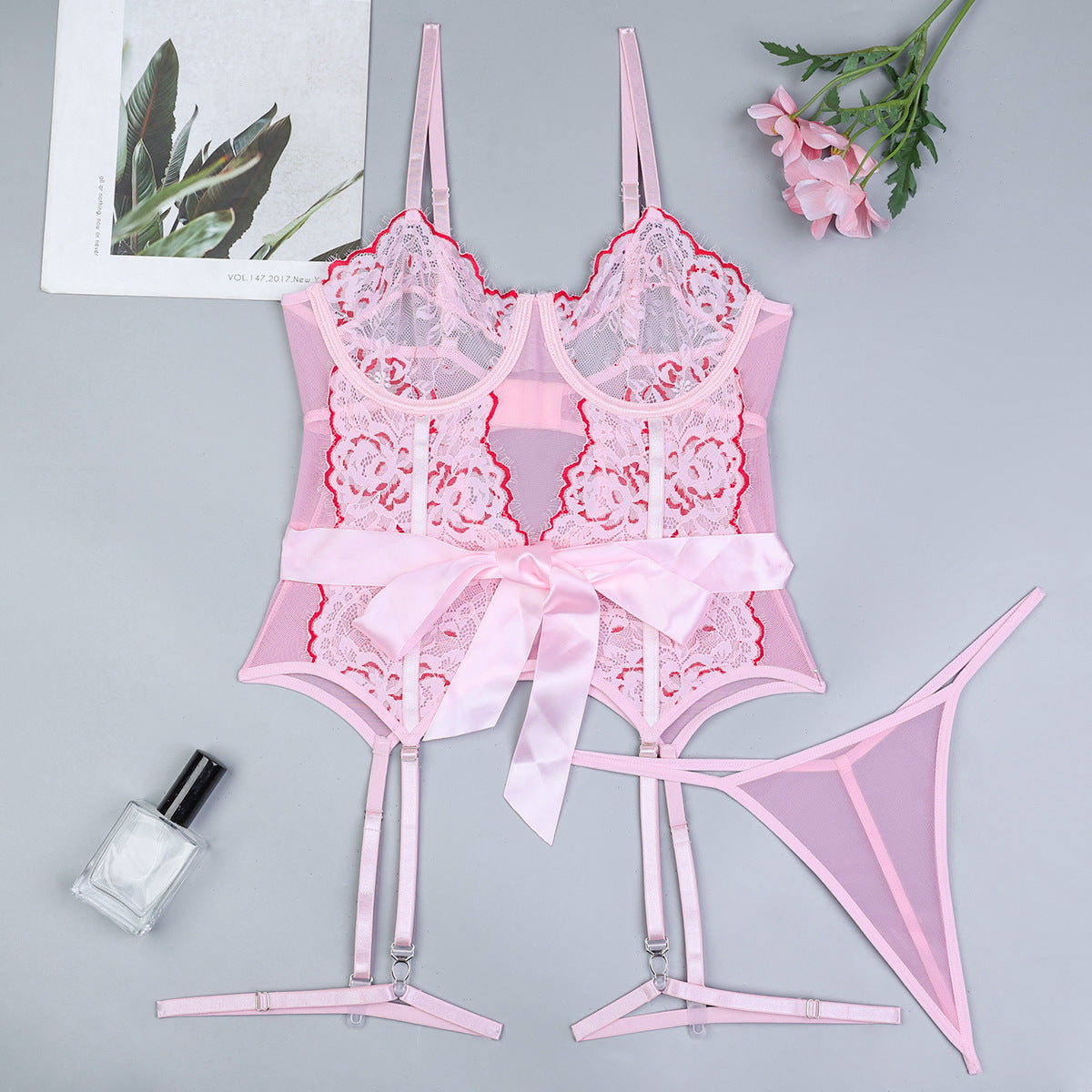 Pink Lace Sexy Lingerie Cute Pure Bow Big Ribbon Waist Two Piece Sling