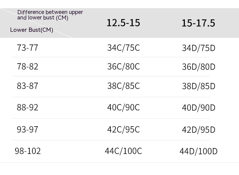 Size: 34/75C,34/75D,36/80C,36/80D,38/85C,38/85D,40/90C,40/90D,42/95C,42/95D,44/100C,44/100D