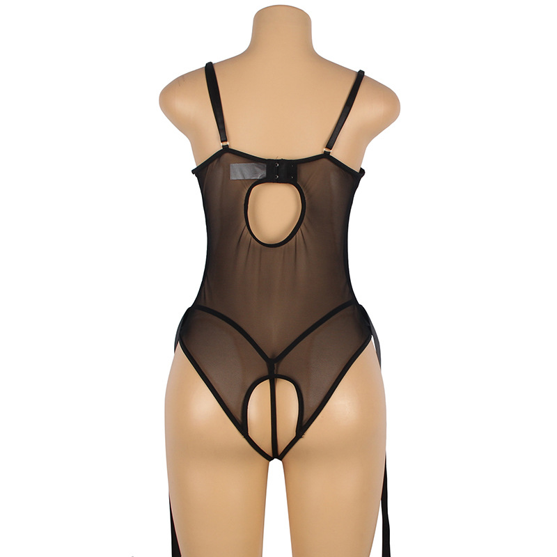 plus Size Underwear Lace Sleeveless Jumpsuit Sexy Black Leather Bra Set