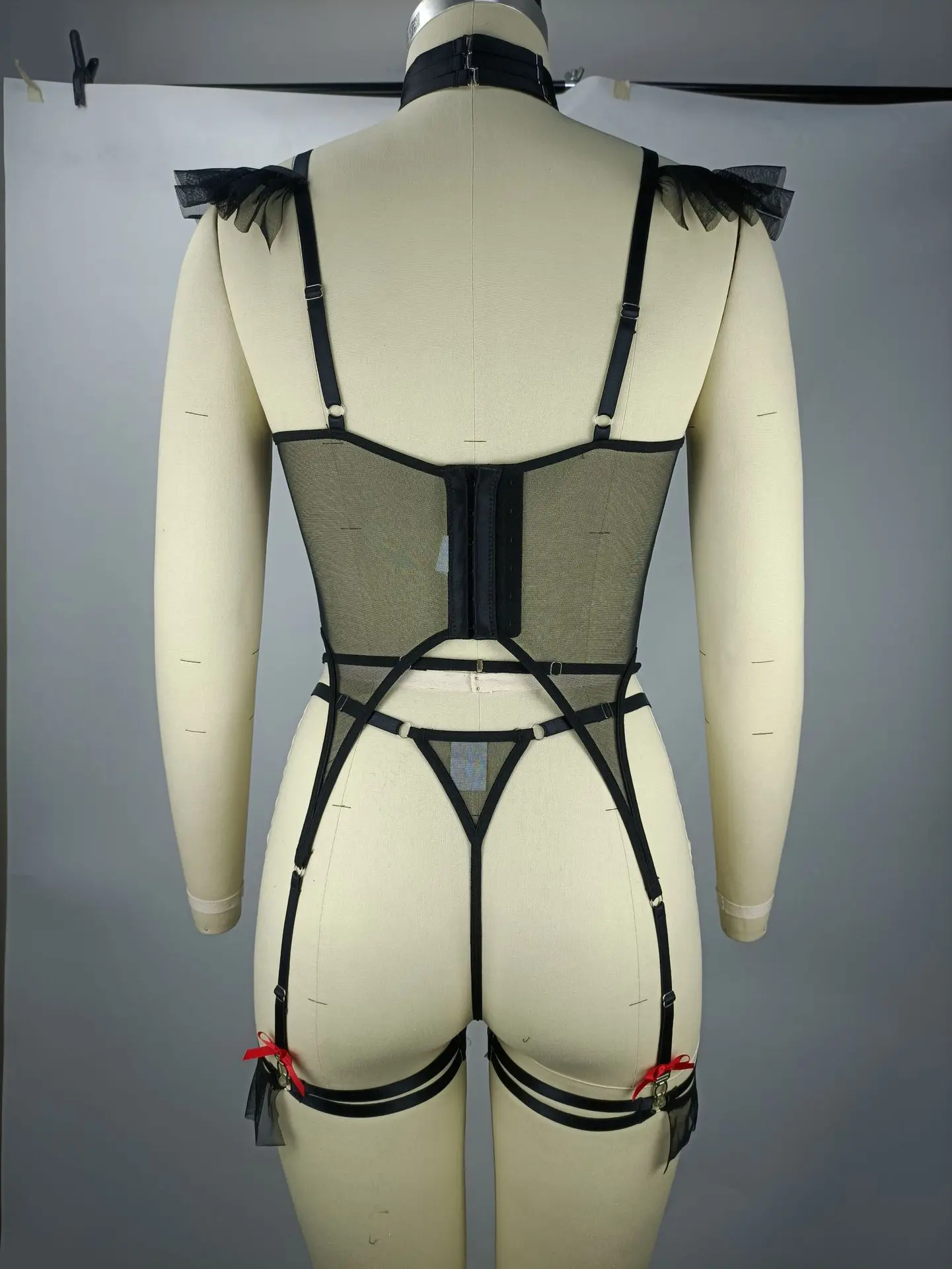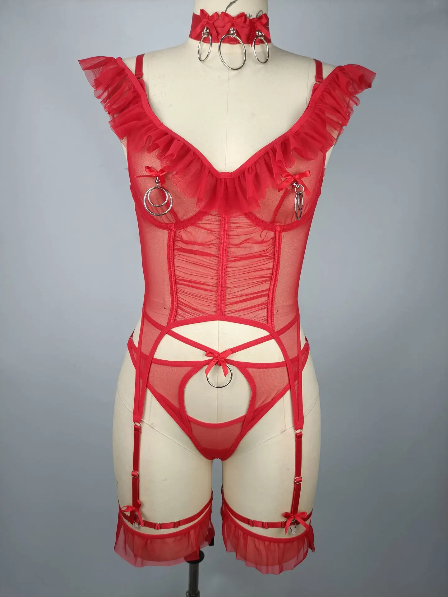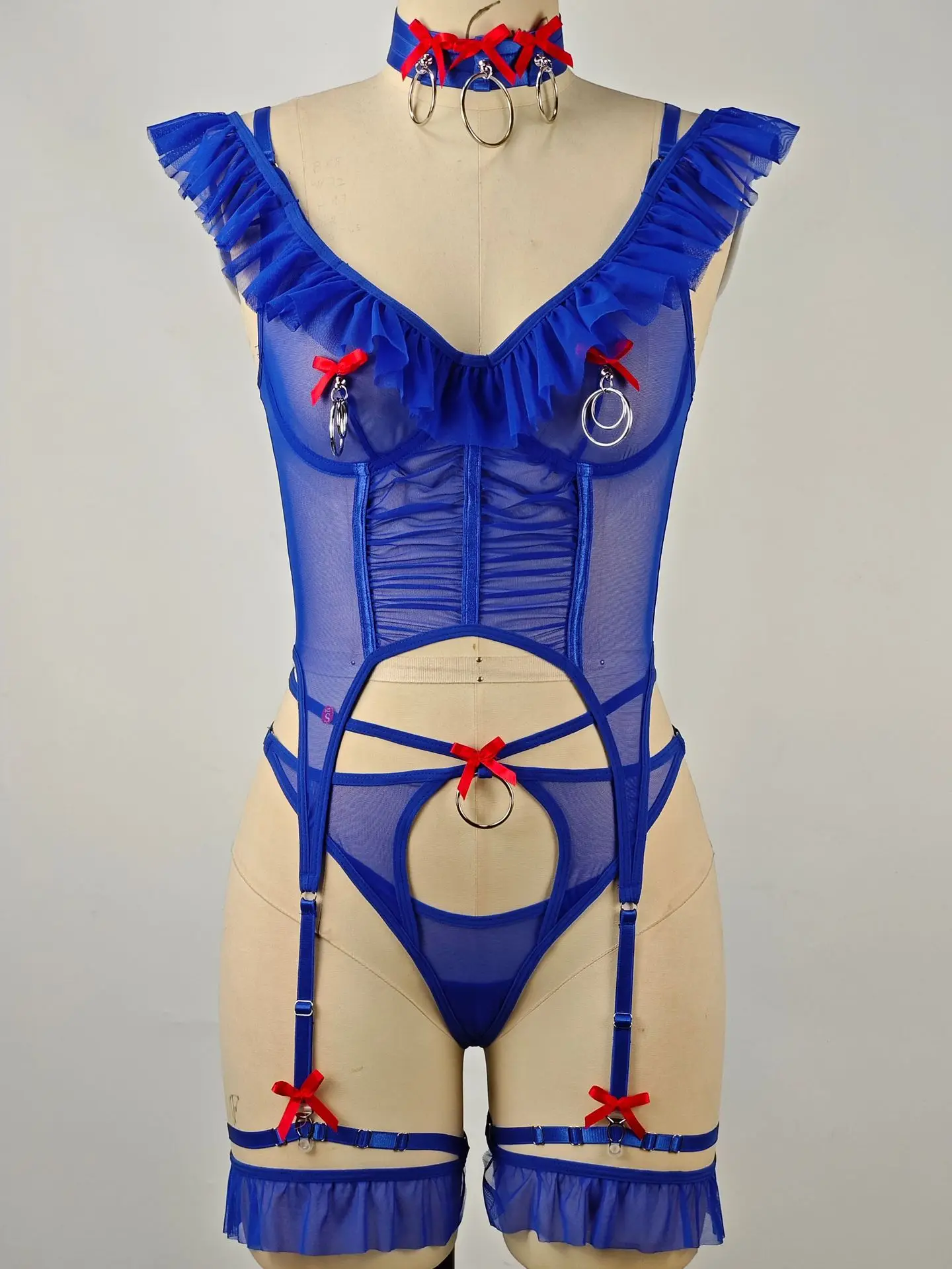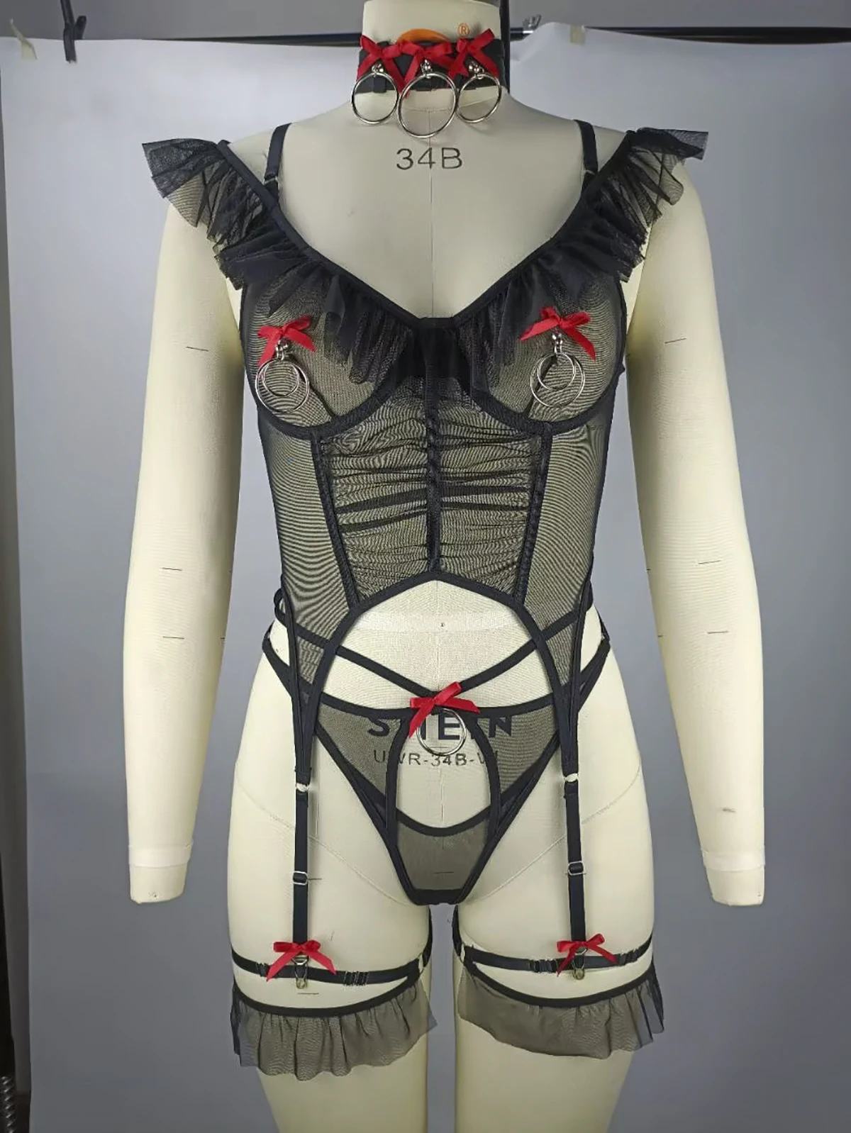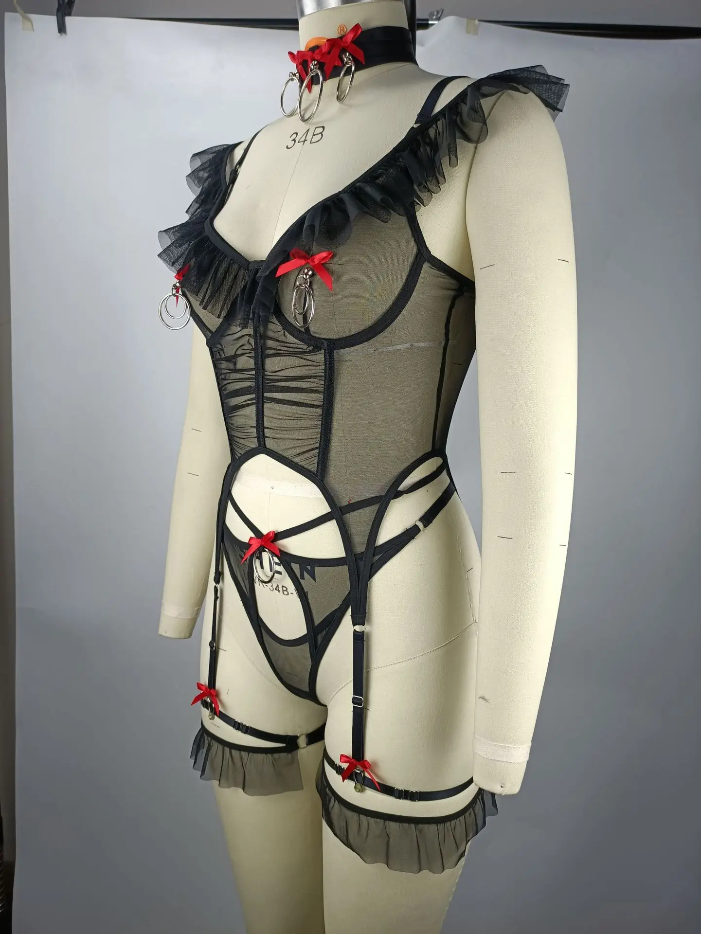 Ruffle Lingerie Fancy Sensual Underwear Transparent Bra With Round ring Pleated Top Thongs Bowknot Delicate Bilizna Set