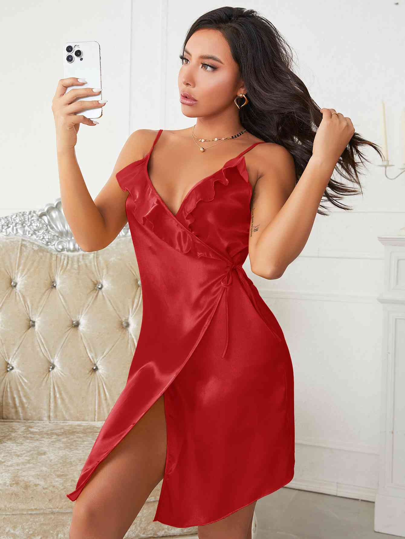 Satin Ruffled Spaghetti Strap Wrap Night Dress