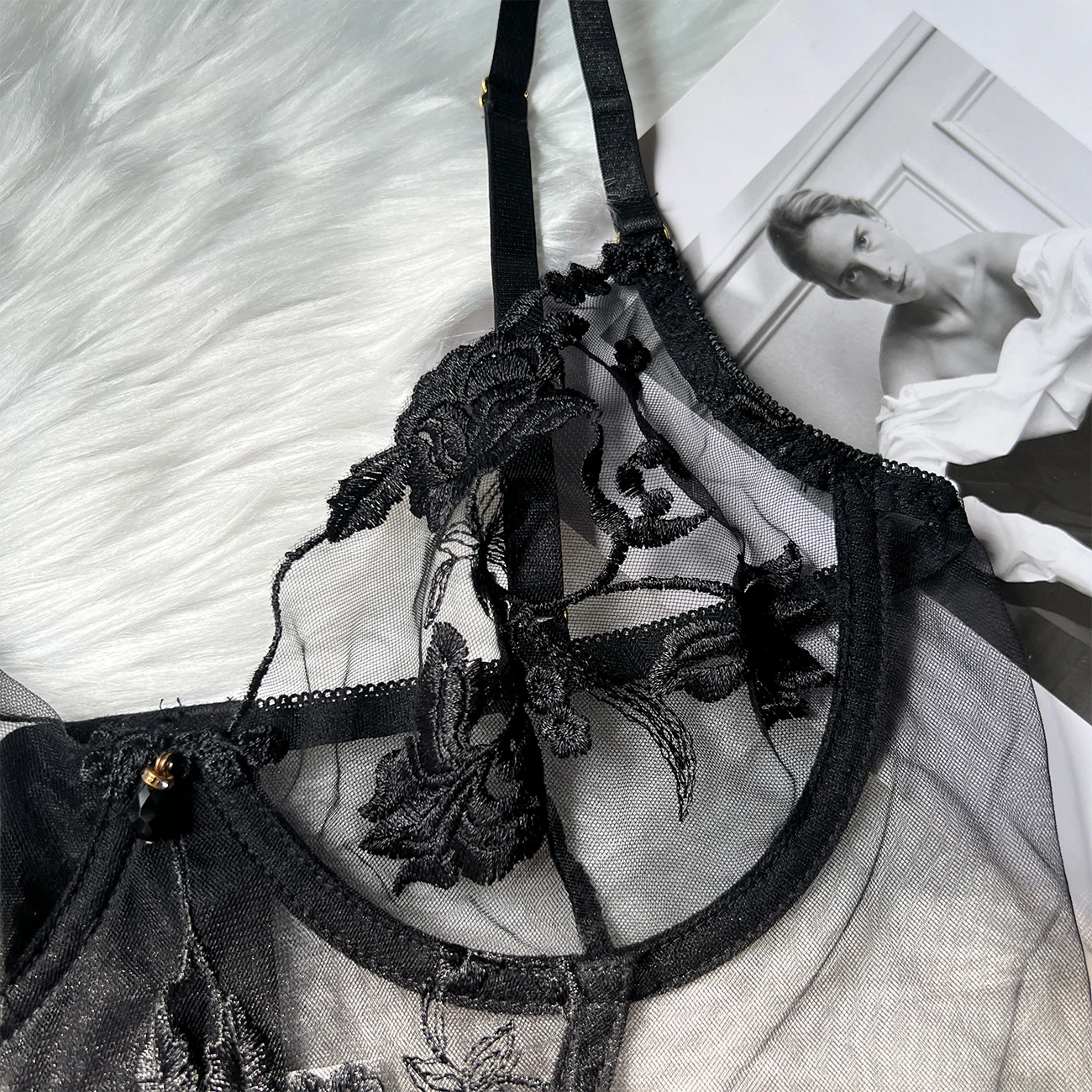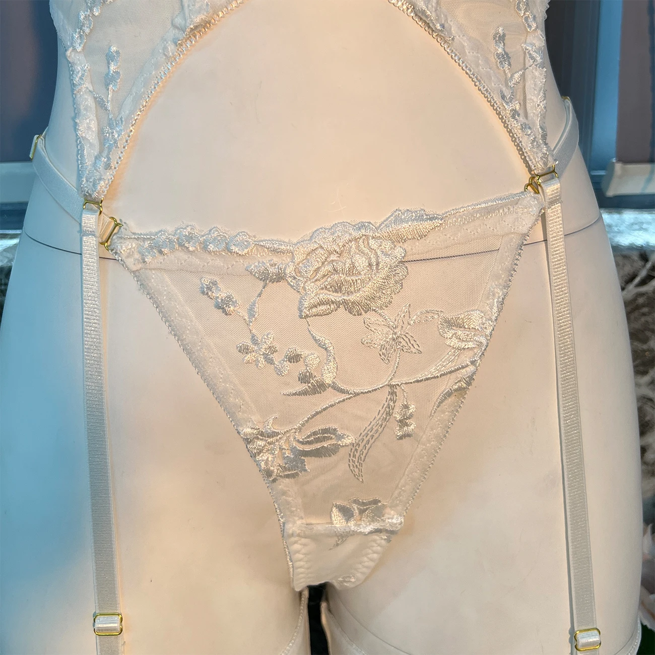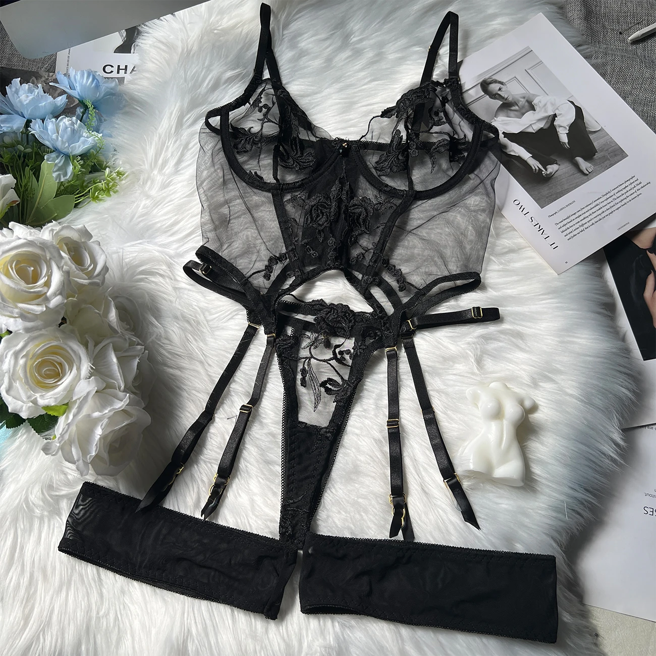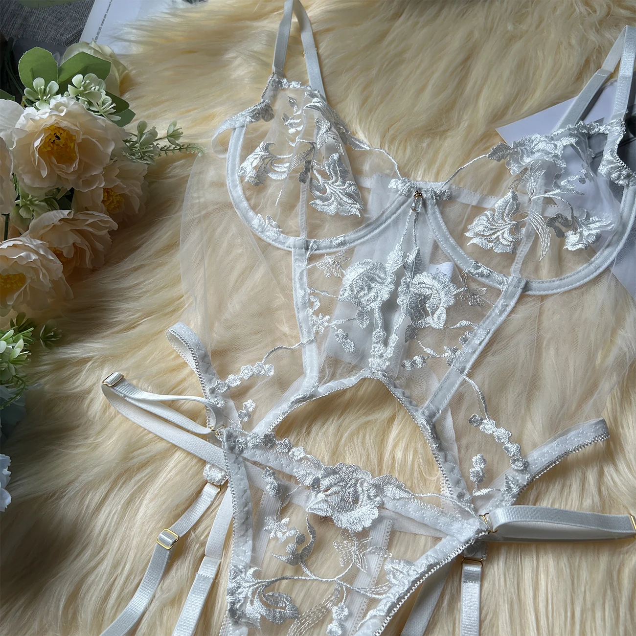 Sensual Lingerie Floral Lace Transparent Costume Bride Fantasy Crotchless Invisible Thongs Suit