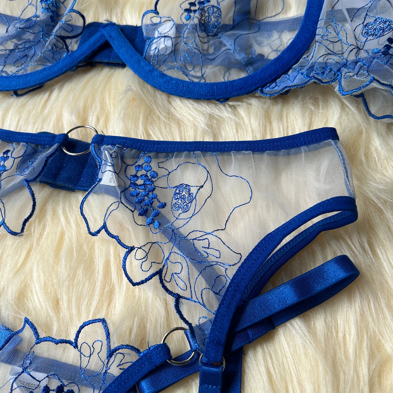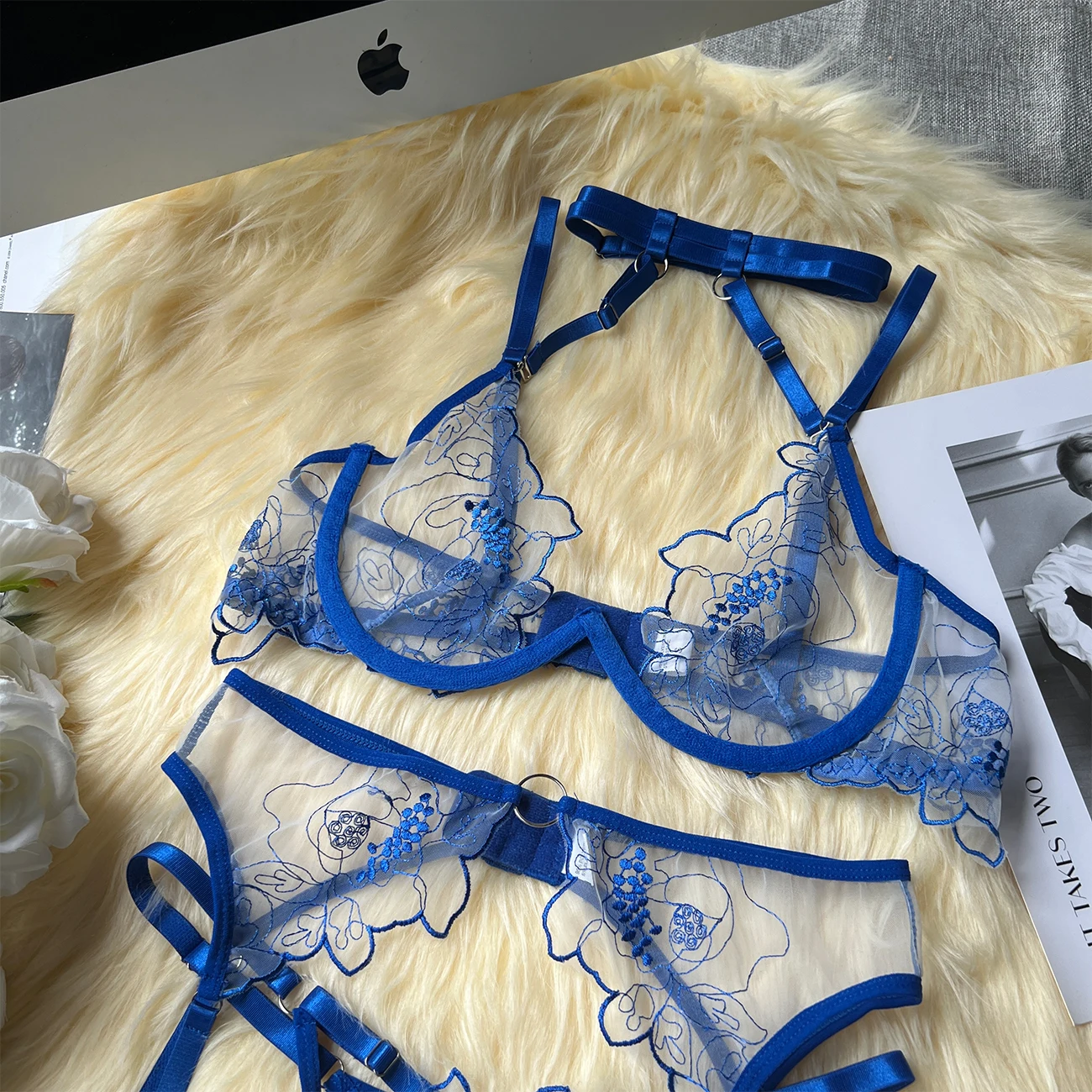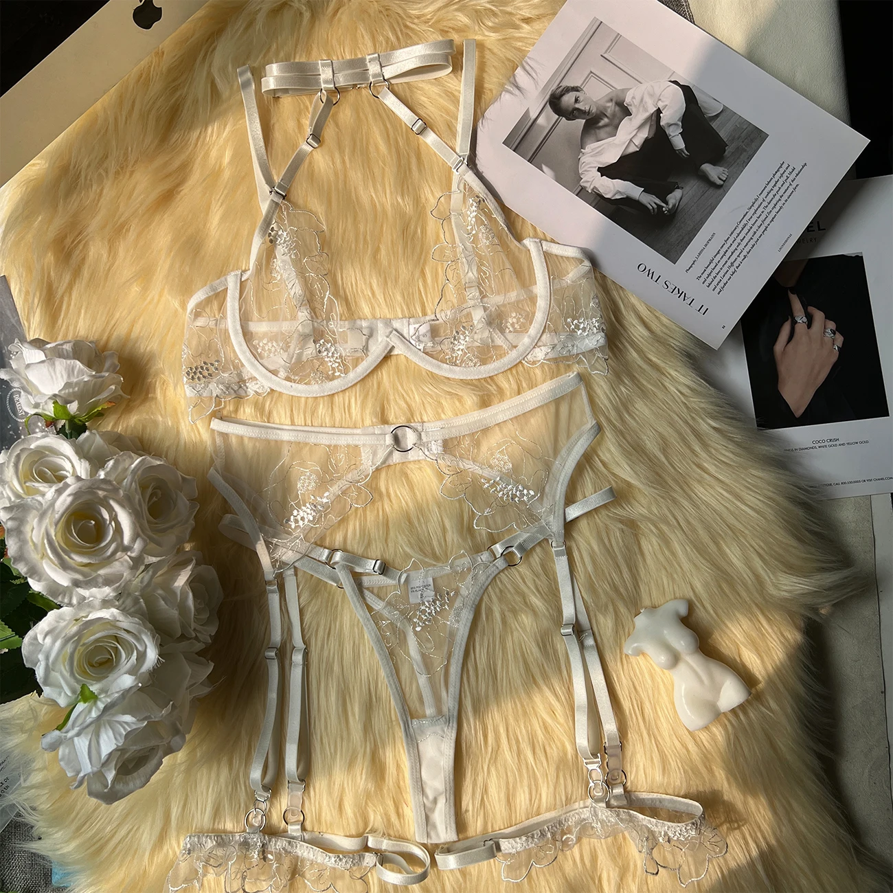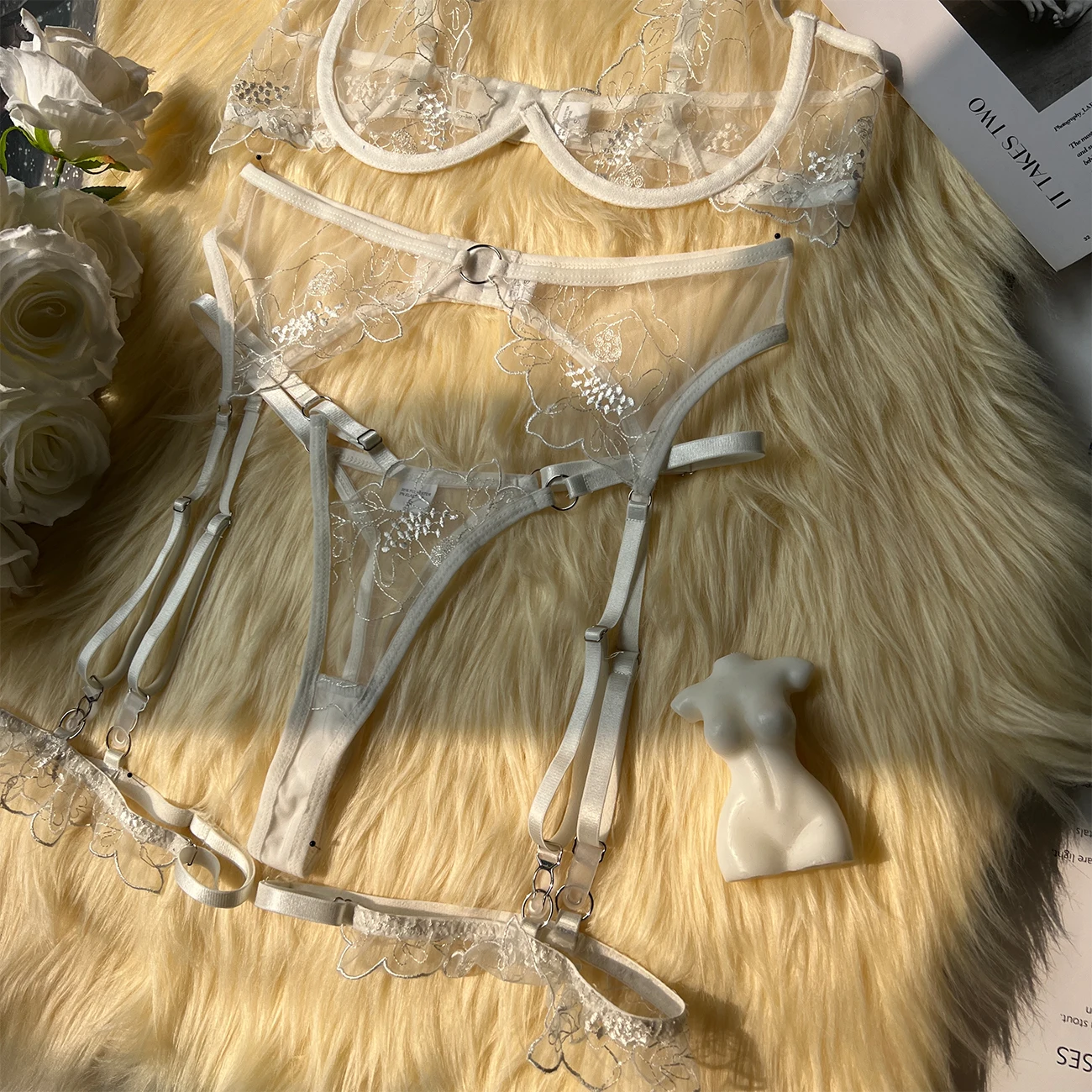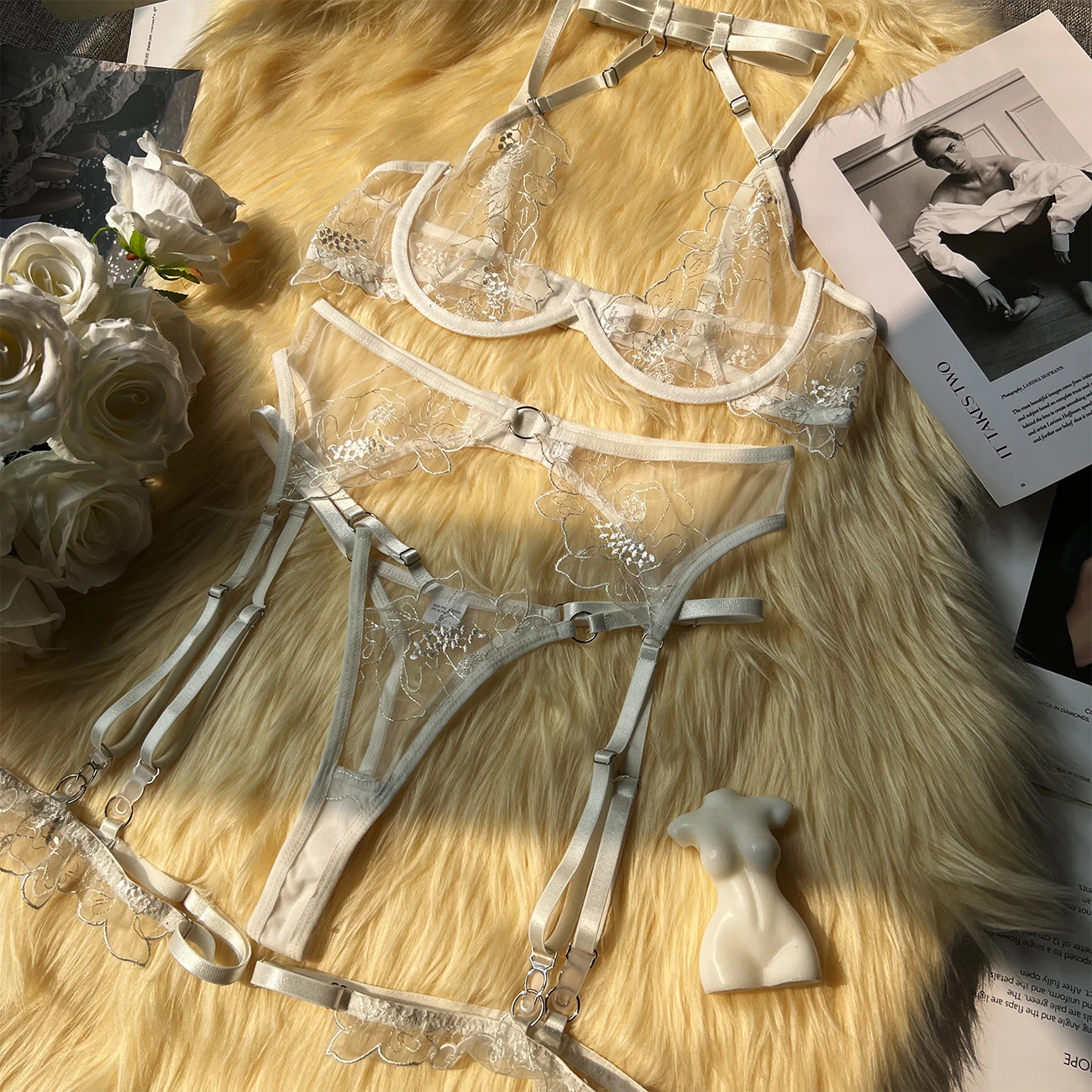 Sensual Romantic Lingeries Transparent Lace Embroidery Hot Girl Underwear See Through Lace Set Half Cup Push Up Outfit