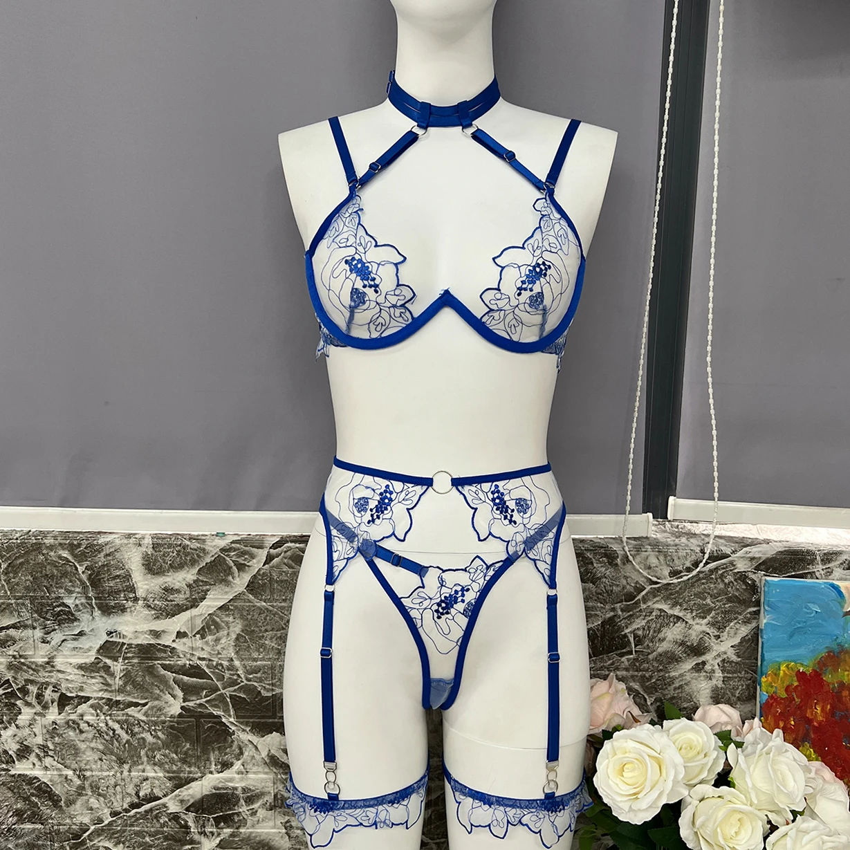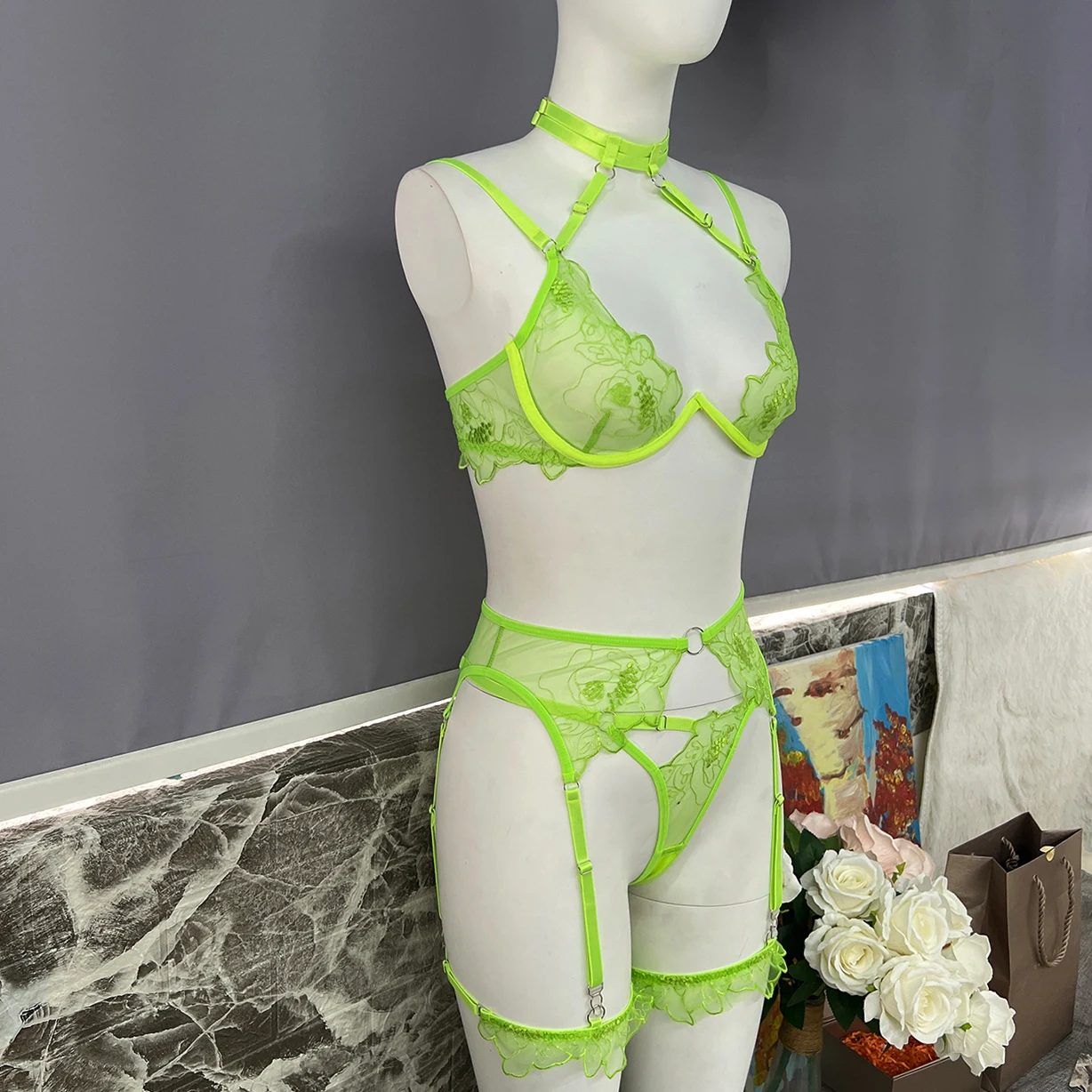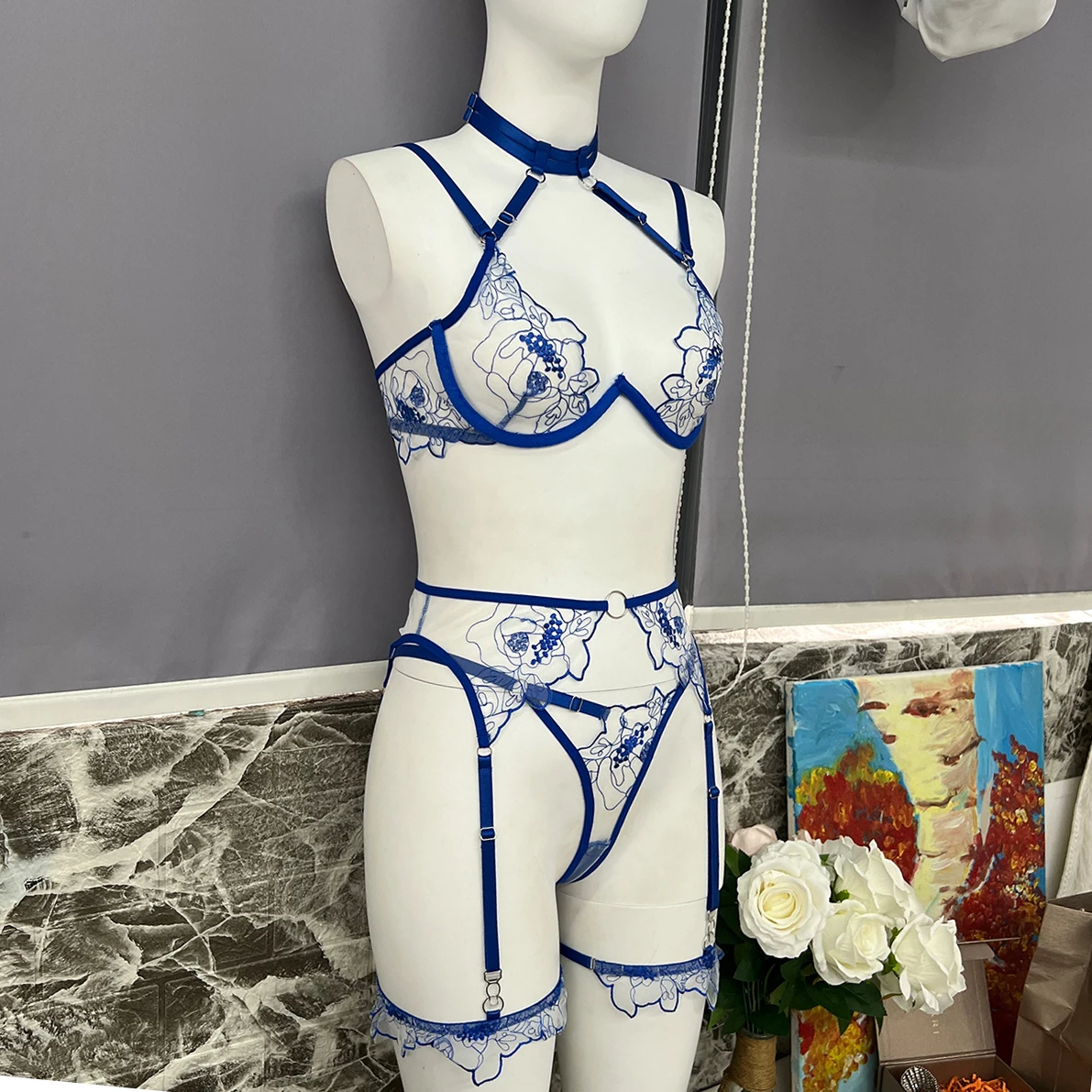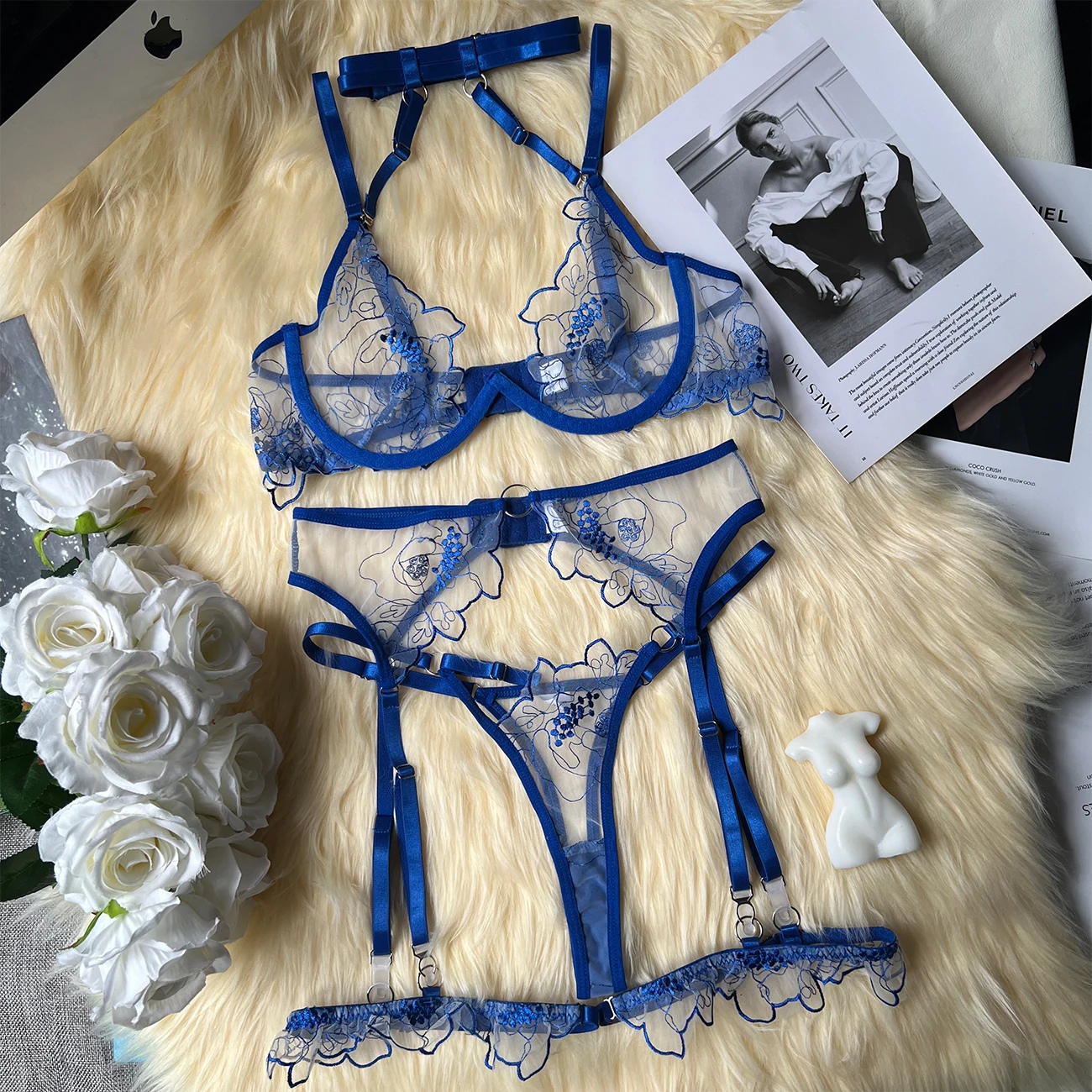 Sensual Romantic Lingeries Transparent Lace Embroidery Hot Girl Underwear See Through Lace Set Half Cup Push Up Outfit