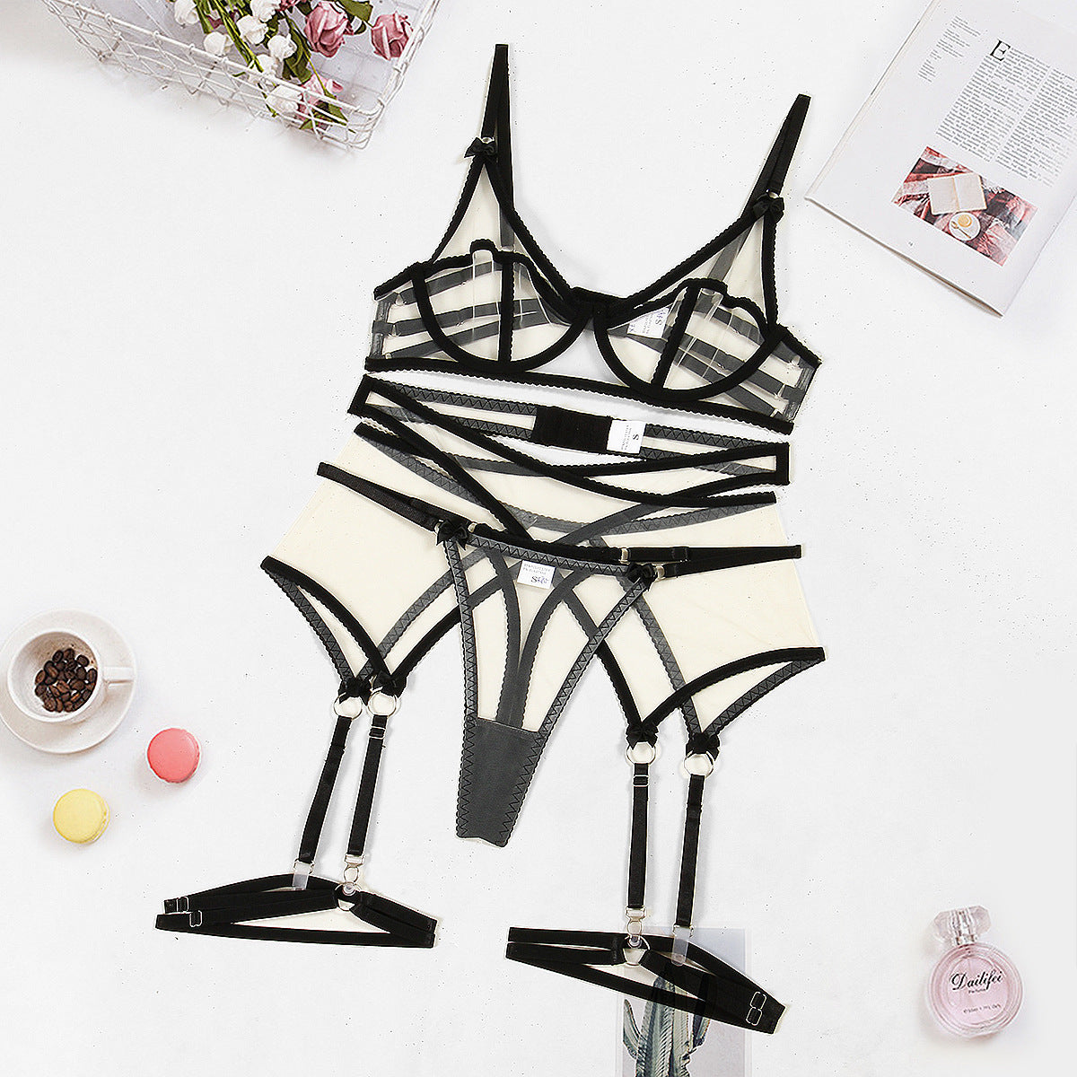 Sexy Beauty Back Bra Complex Sheer Mesh Sexy Lingerie Garter Four Piece Set Or Five Piece Set