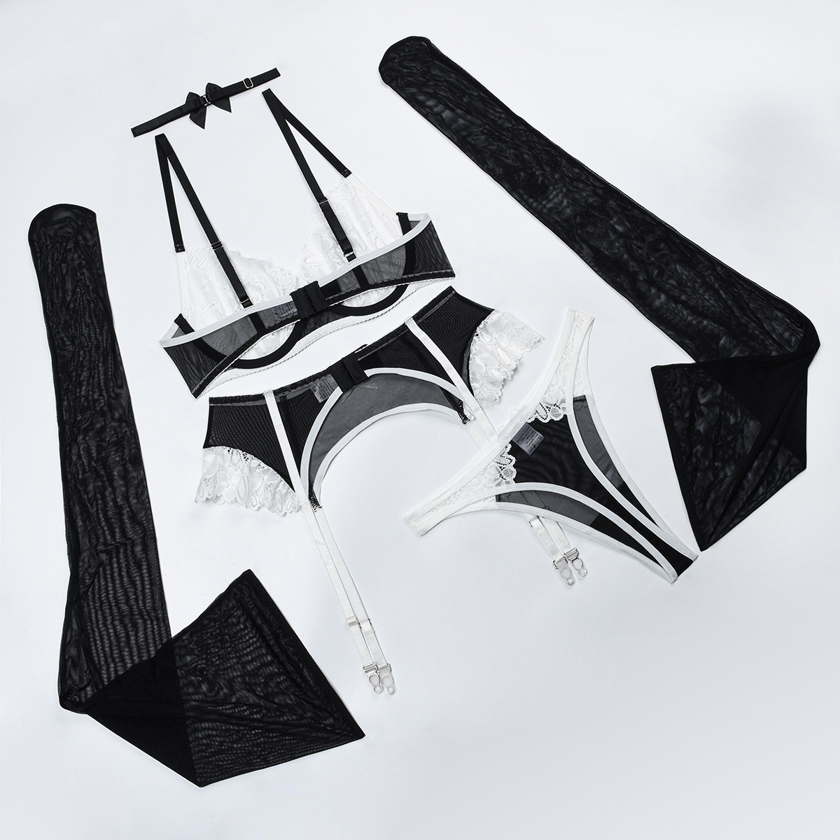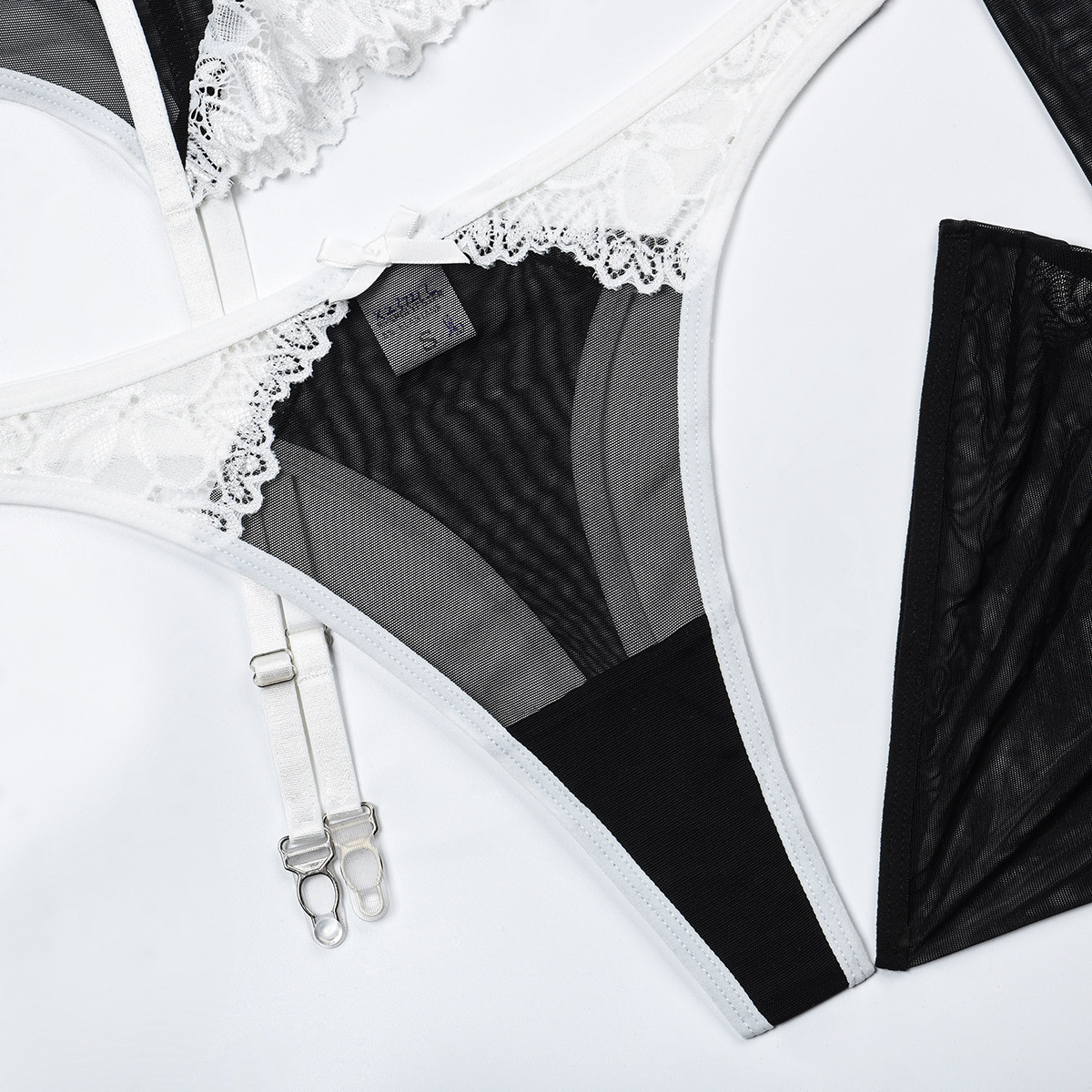 Sexy Bra Set Lace Mesh Patchwork Contrast Color Sexy Lingerie Five Piece Set