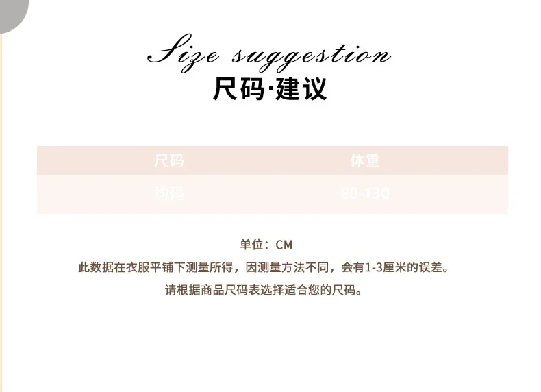One size fits women who are 5'1-5'7 tall and weigh 88-130 pounds. The girl in the picture weighs 49 kilograms/108 pounds, is 170 centimeters tall, has a chest circumference of 85 centimeters/33.4 inches, a waist circumference of 62 centimeters/24.4 inches, and a hip circumference of 87 centimeters/34.2 inches. Before purchasing this product, you can refer to this data.