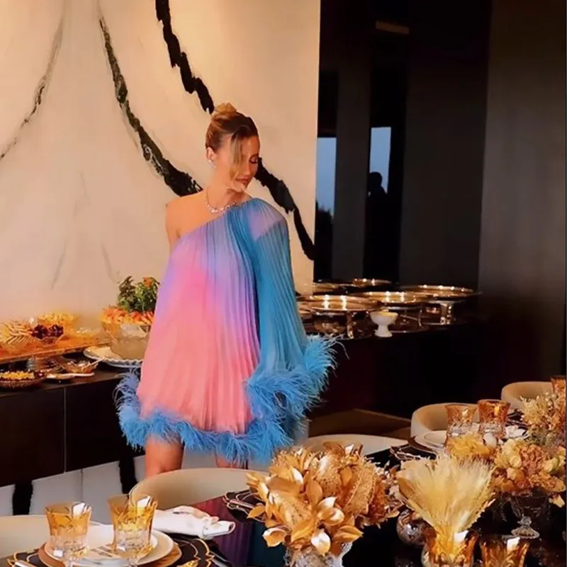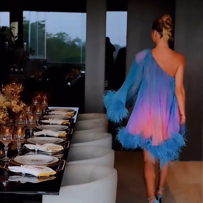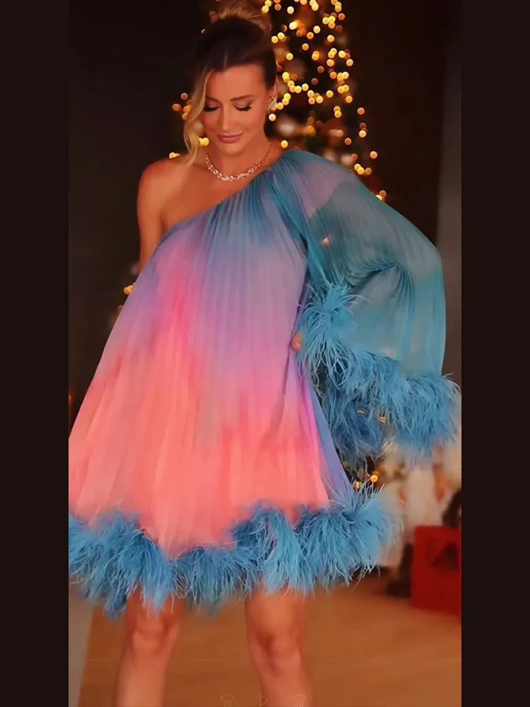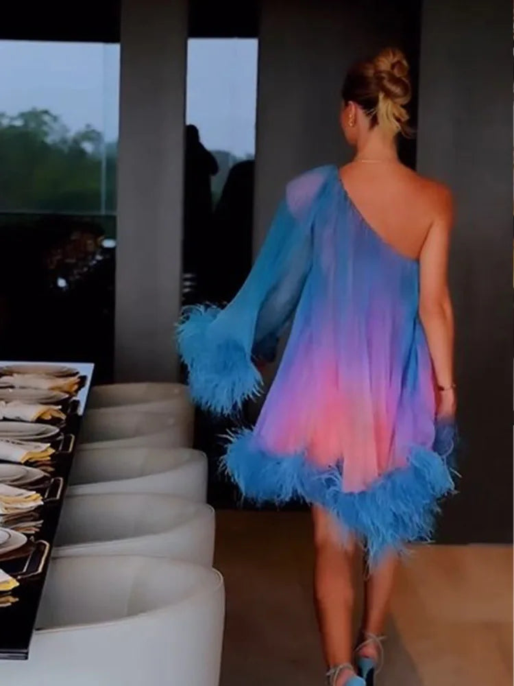 Sexy Diagonal Shoulder Gradient Color Short Dress For Women Fashion Velvet Long Sleeve Casual Loose Mini Dress Female Vestidos