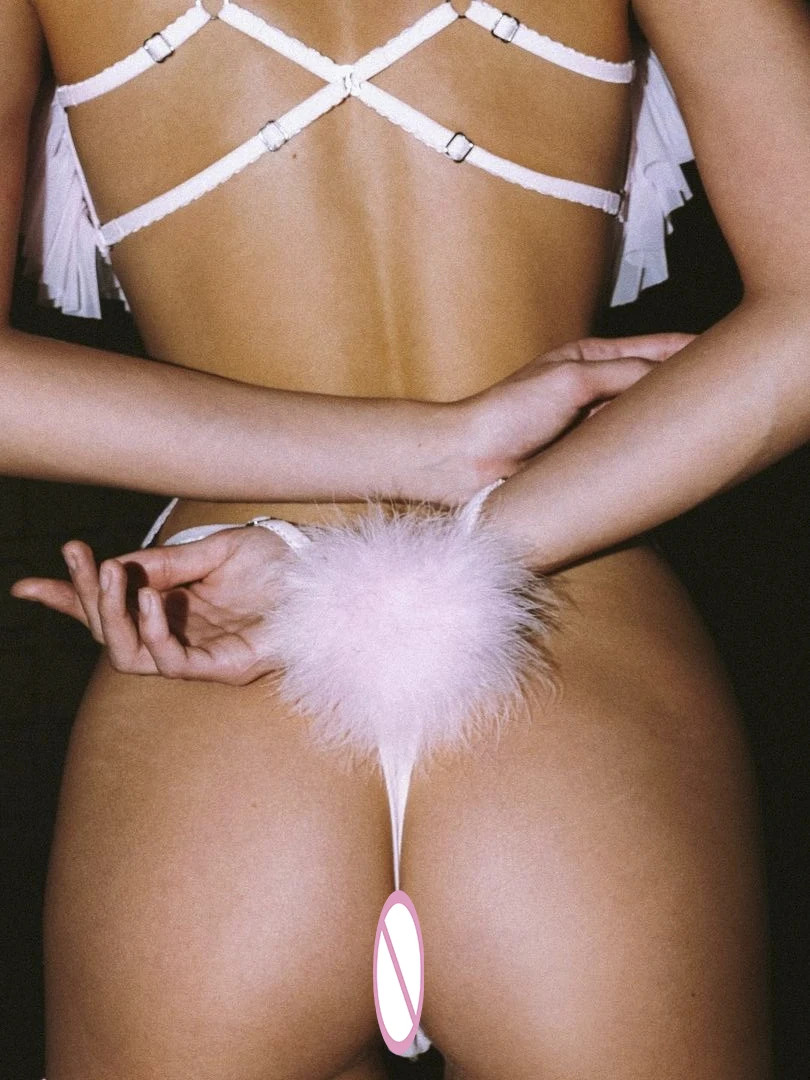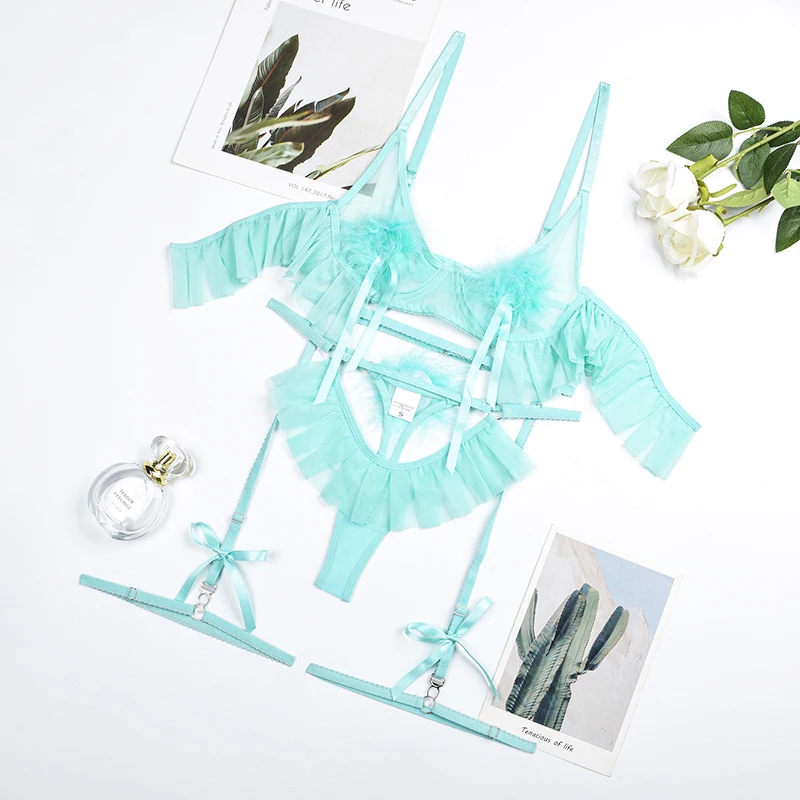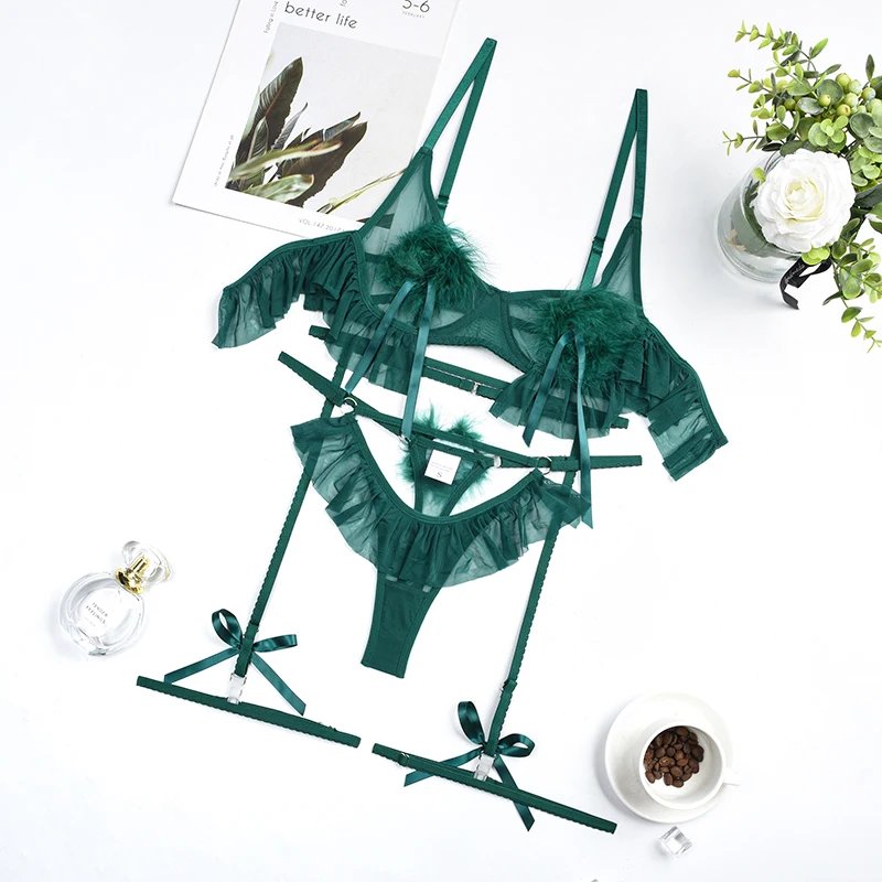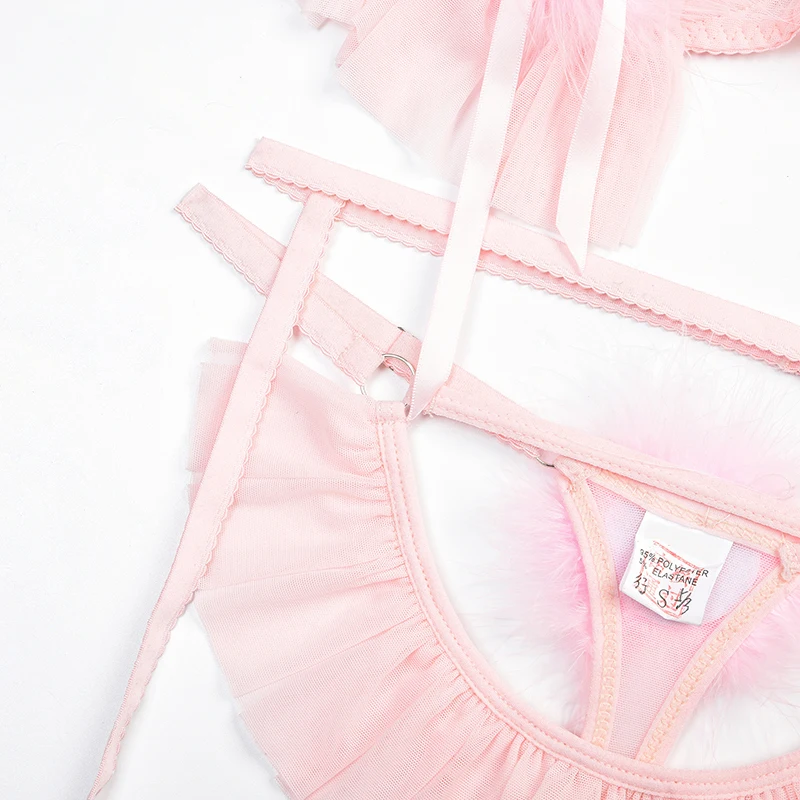 Sexy Feather Lingerie Light Pink Ruffle Hollow Thongs Outfits Seamless Set Woman 3 Pieces Fairy Intimate