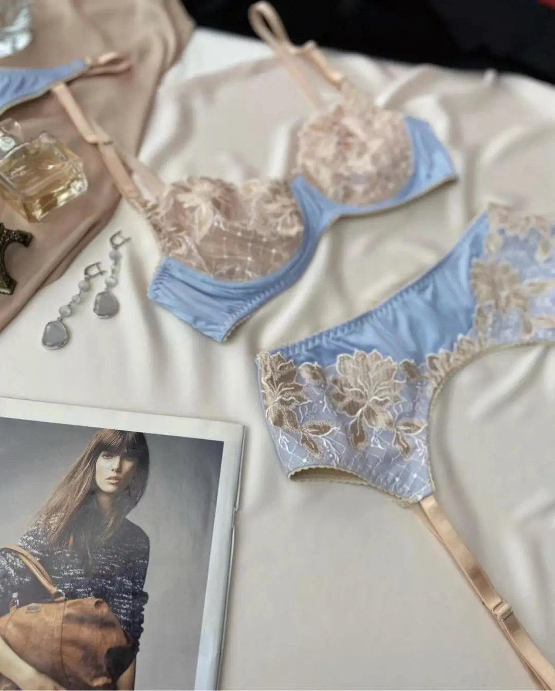 Sexy Lingerie Lace Embroidery Underwear Set Underwire Push Up Bra Brief Sets with Garters Fancy Sensual Outfit
