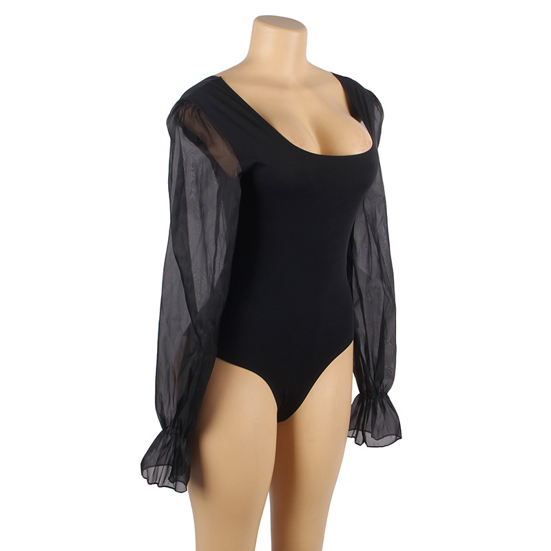 Sexy Lingerie Mesh Stitching Long Sleeve off Free Sexy Jumpsuit Square Collar Slim Fit Slimming Inner Wear Outer Wear Women Organza