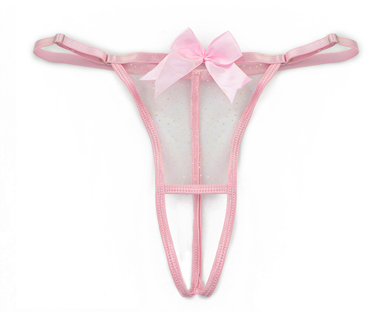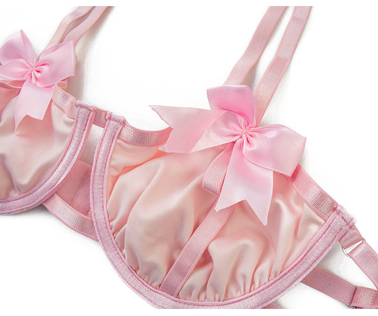 Sexy Lingerie Sling Three Piece Pink Bow Hollow Out Cutout Backless Bra See Through T Back Sexy