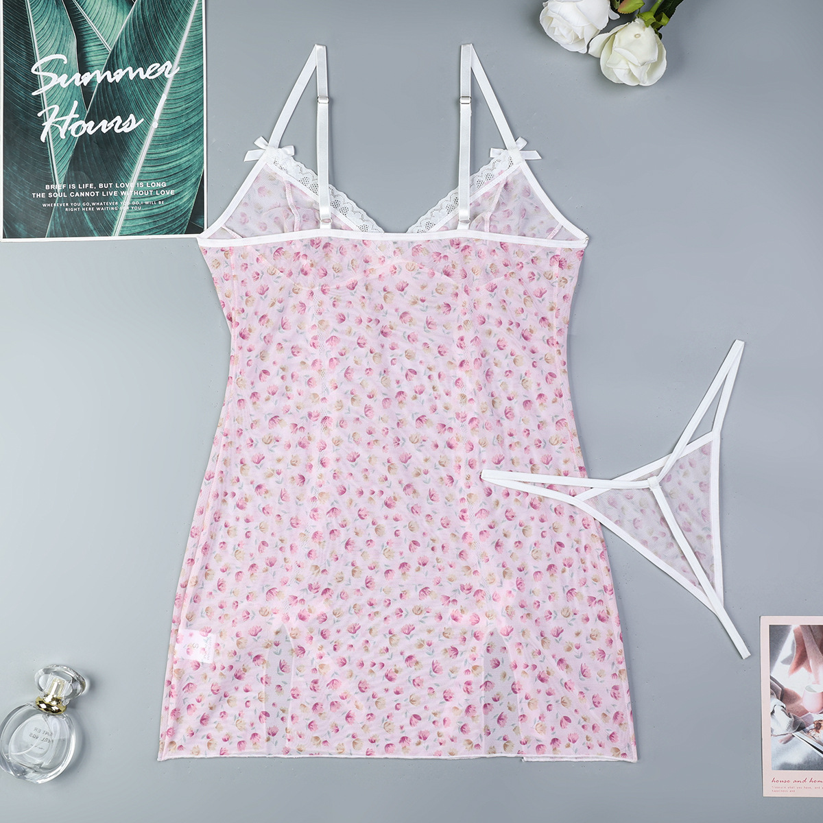 Sexy See through Pajamas Lace Stitching Printing Mesh Stretch Split Sling Soft Two Piece Women Clothing