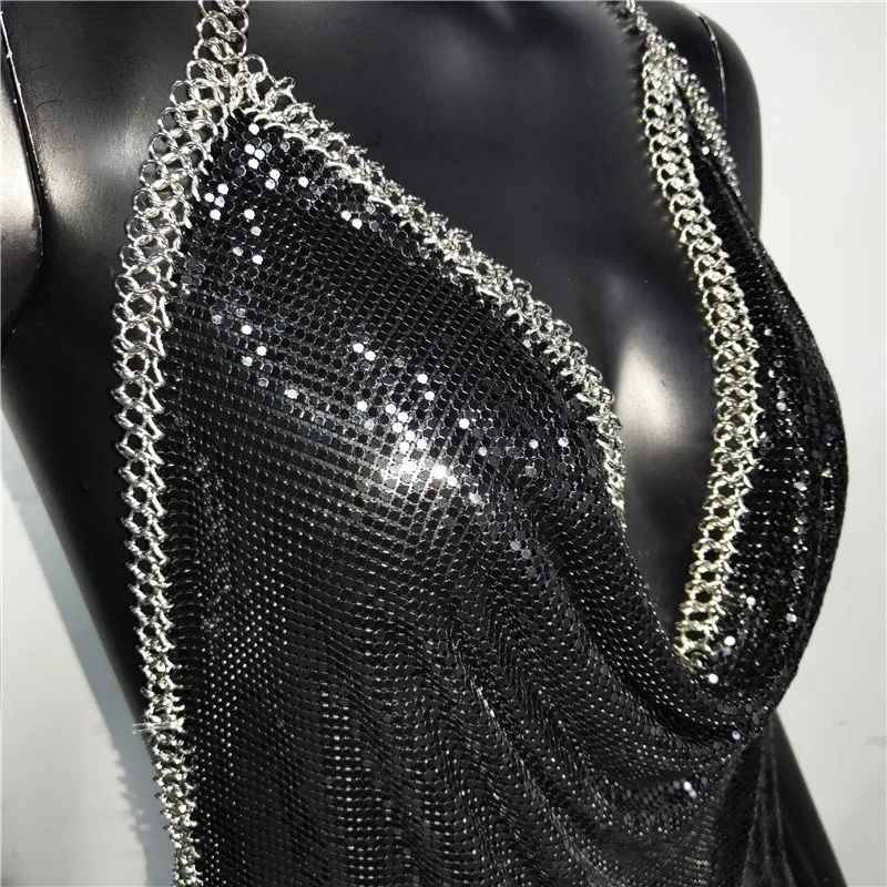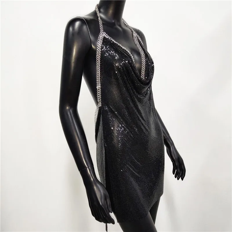 Sexy See Through Rhinestone Metal Chain Glitter Summer Dress Women Backless Slip Sequins Mini Luxury Club Party Dresses Vestidos