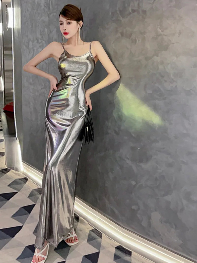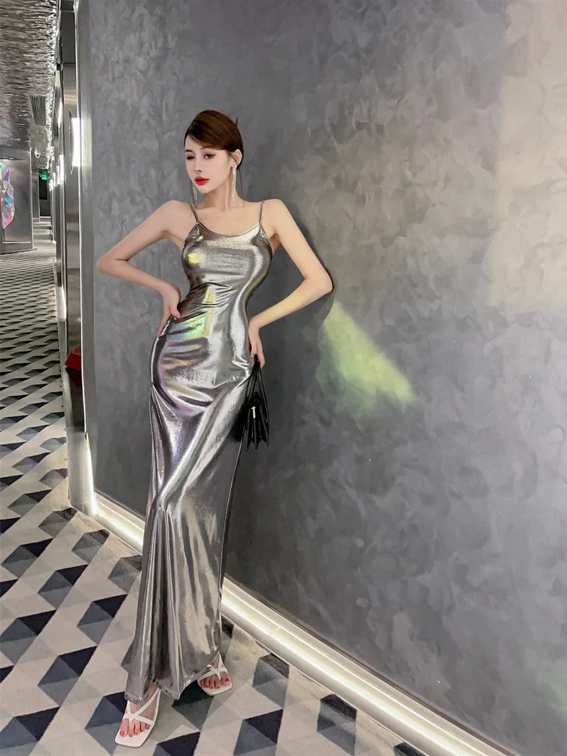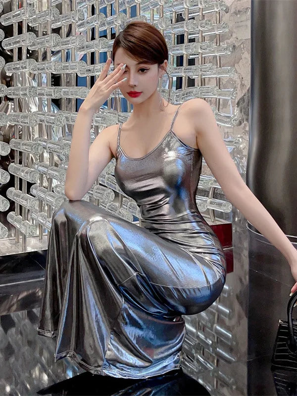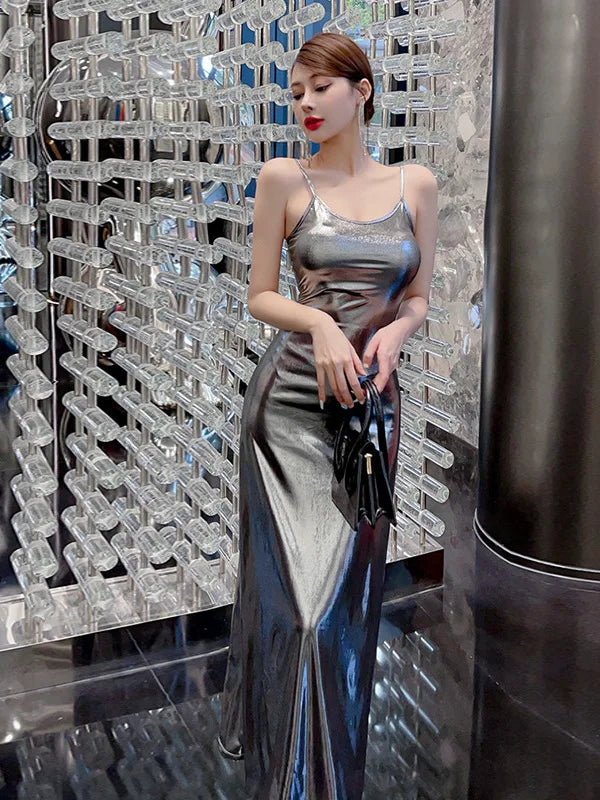 Sexy Style Light Luxury Spicy Girl Liquid Bright Female Korean Indie Style Silver Dress Elegant Party Fashion TemperamentBMI6