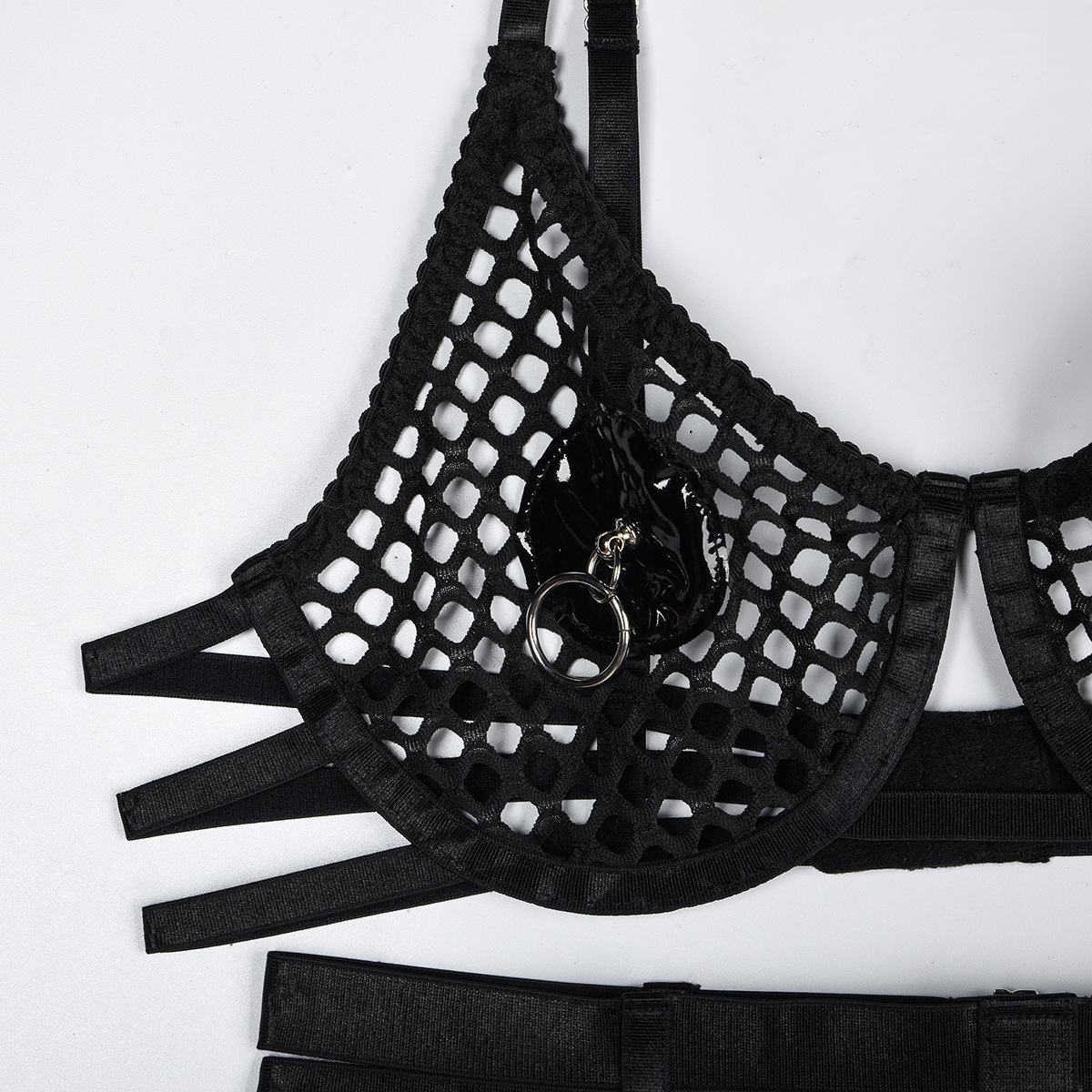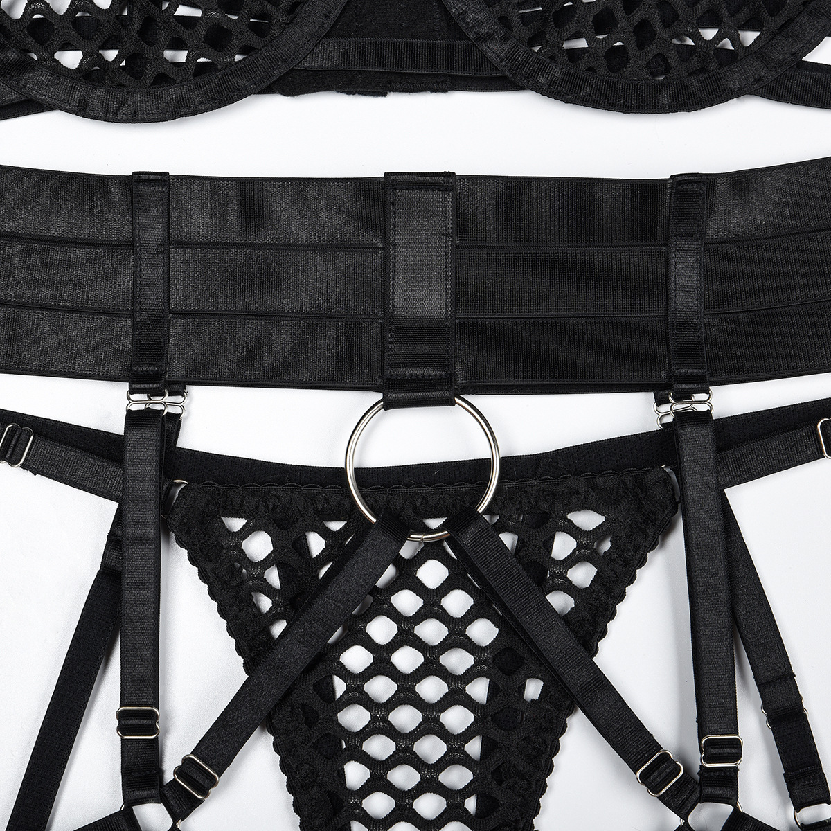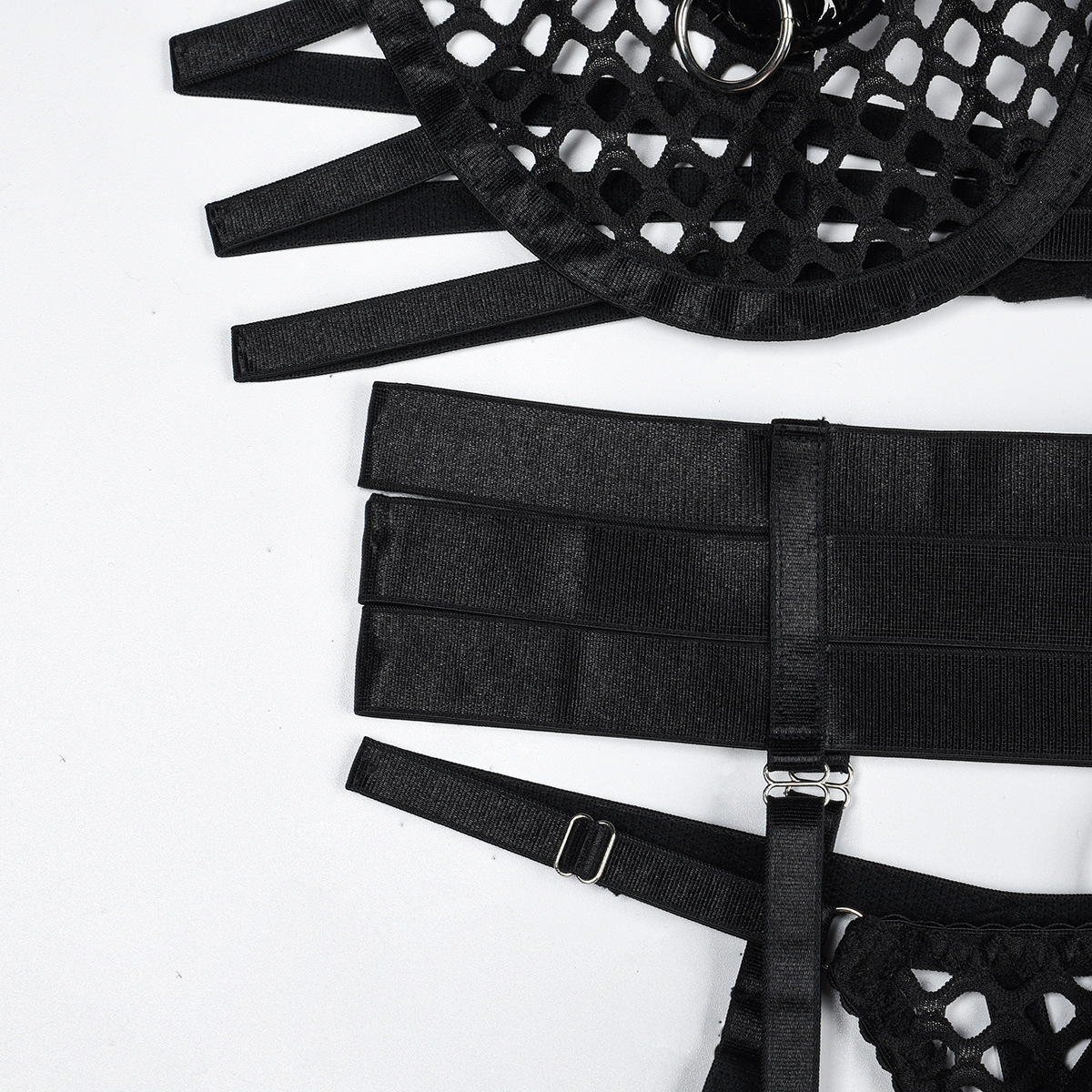 Sexy Underwear Metal Hollow Out Cutout Large Hole Mesh Bandage Sexy See through Garter Five Piece Set