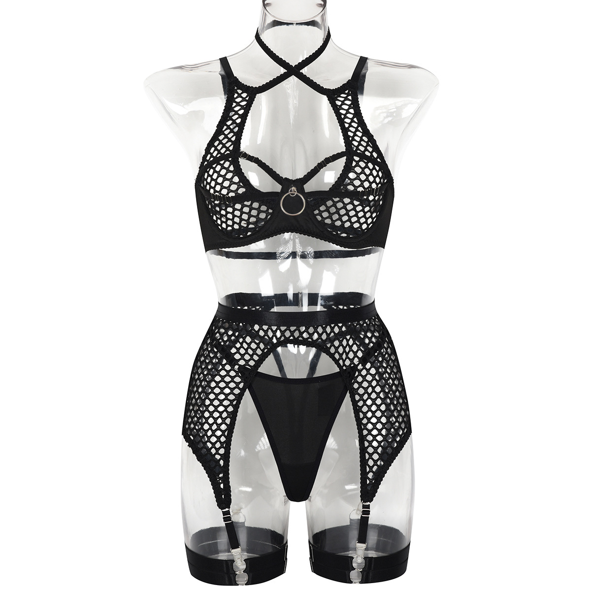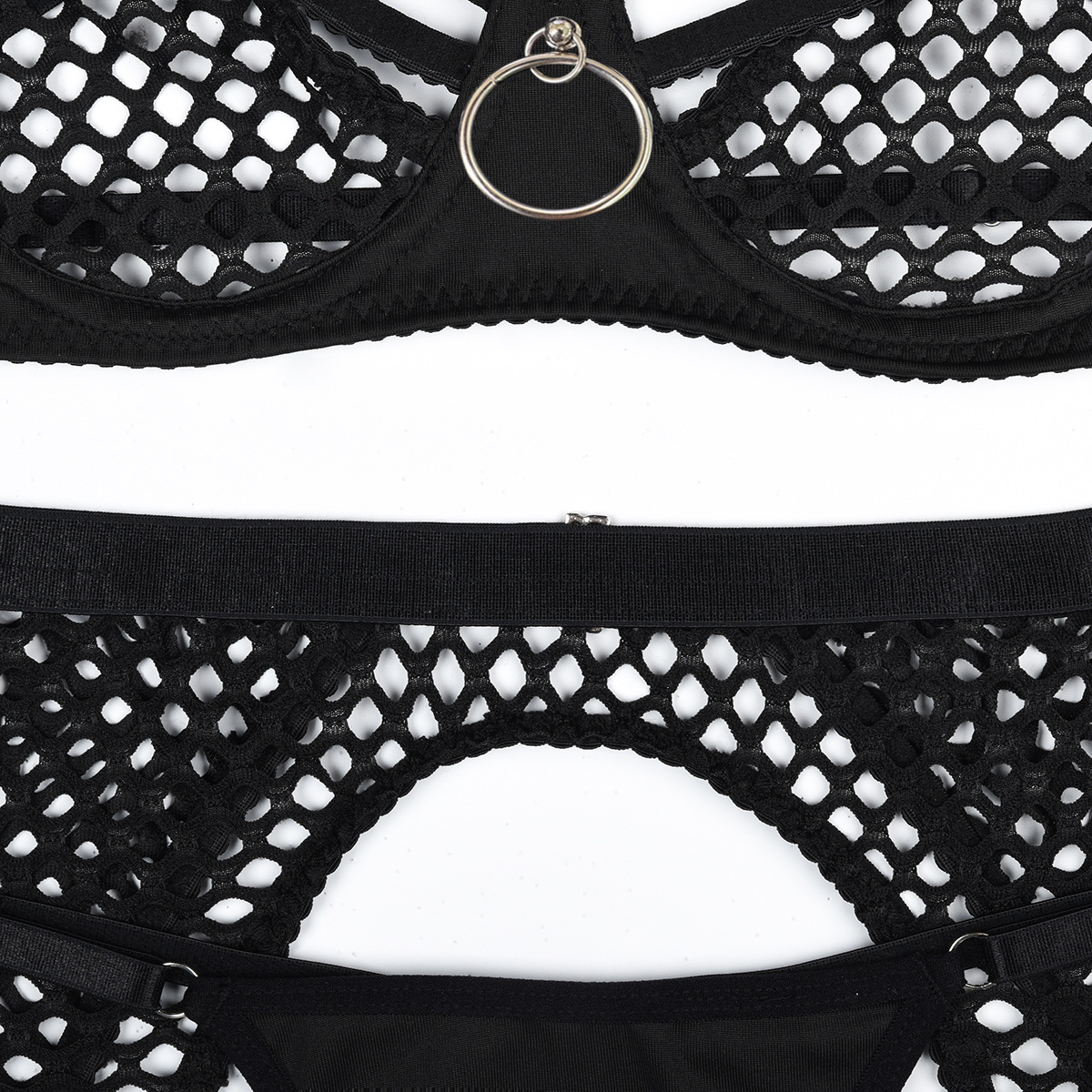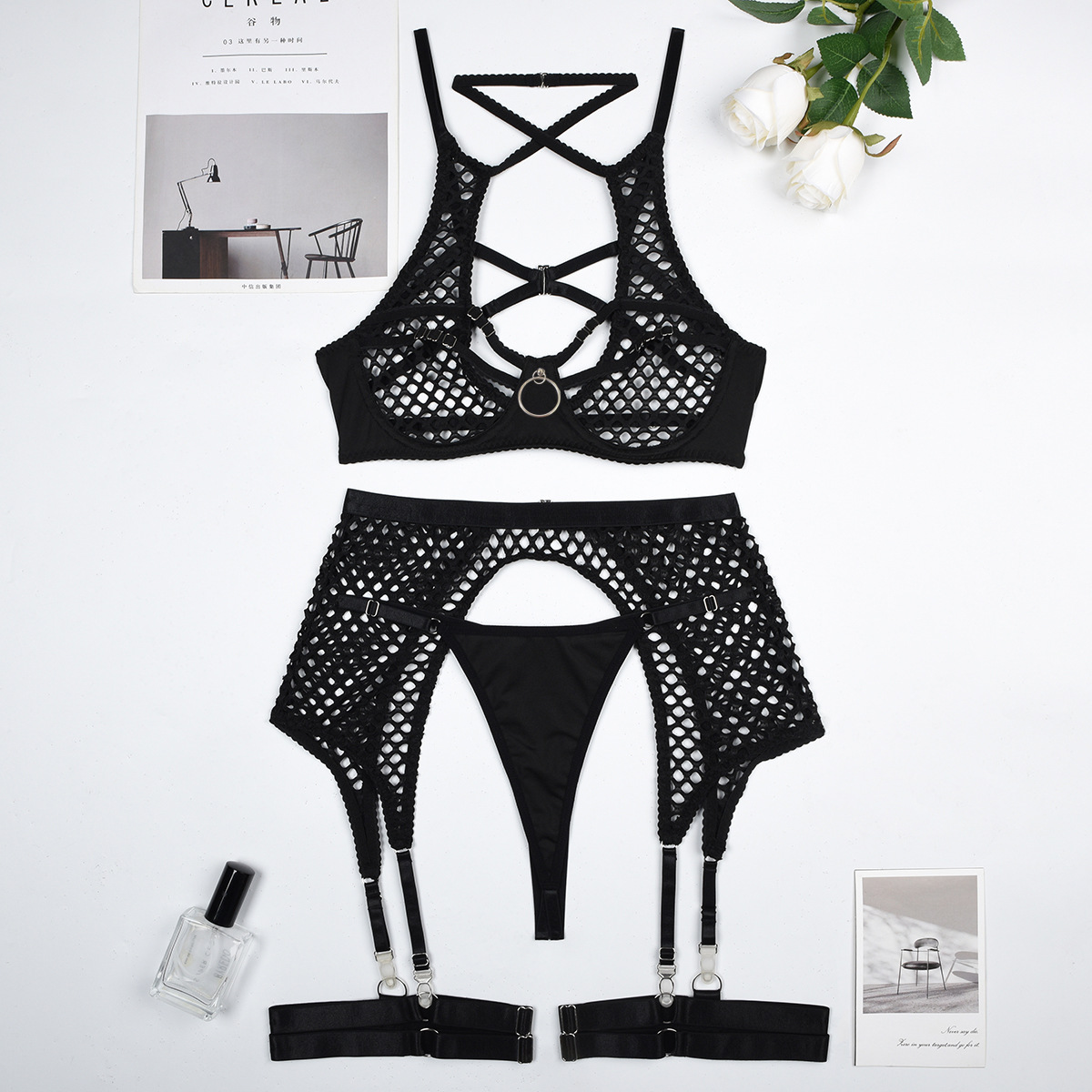 Sexy Underwear Metal Hollow Out Cutout Large Hole Mesh Bandage Sexy See Through Garter Four Piece Set