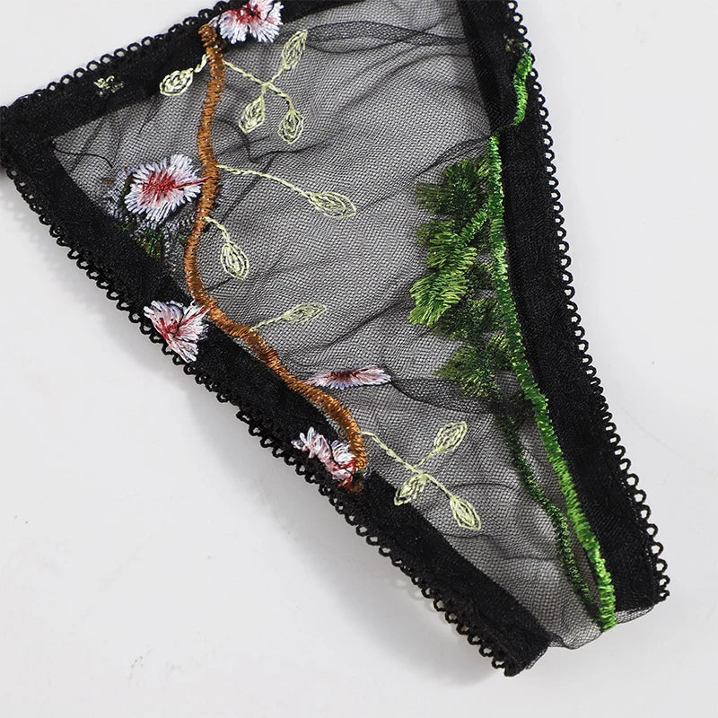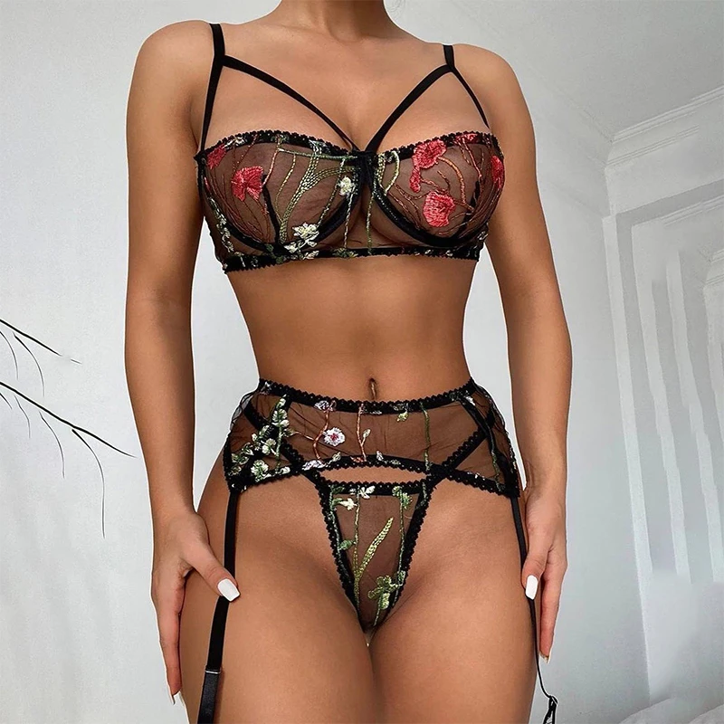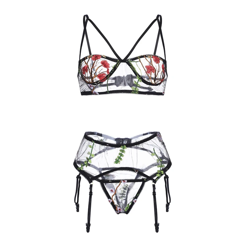 Sexy Women Hot Lingerie Lace Embroidery Floral Transparent Bra Panty Garter Belt Set Female Exotic Sexy Dress Night Sex Lenceria