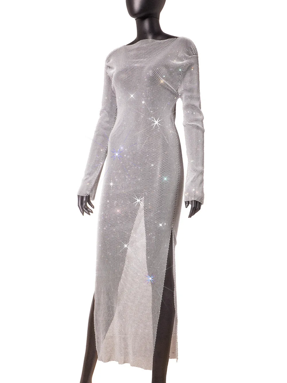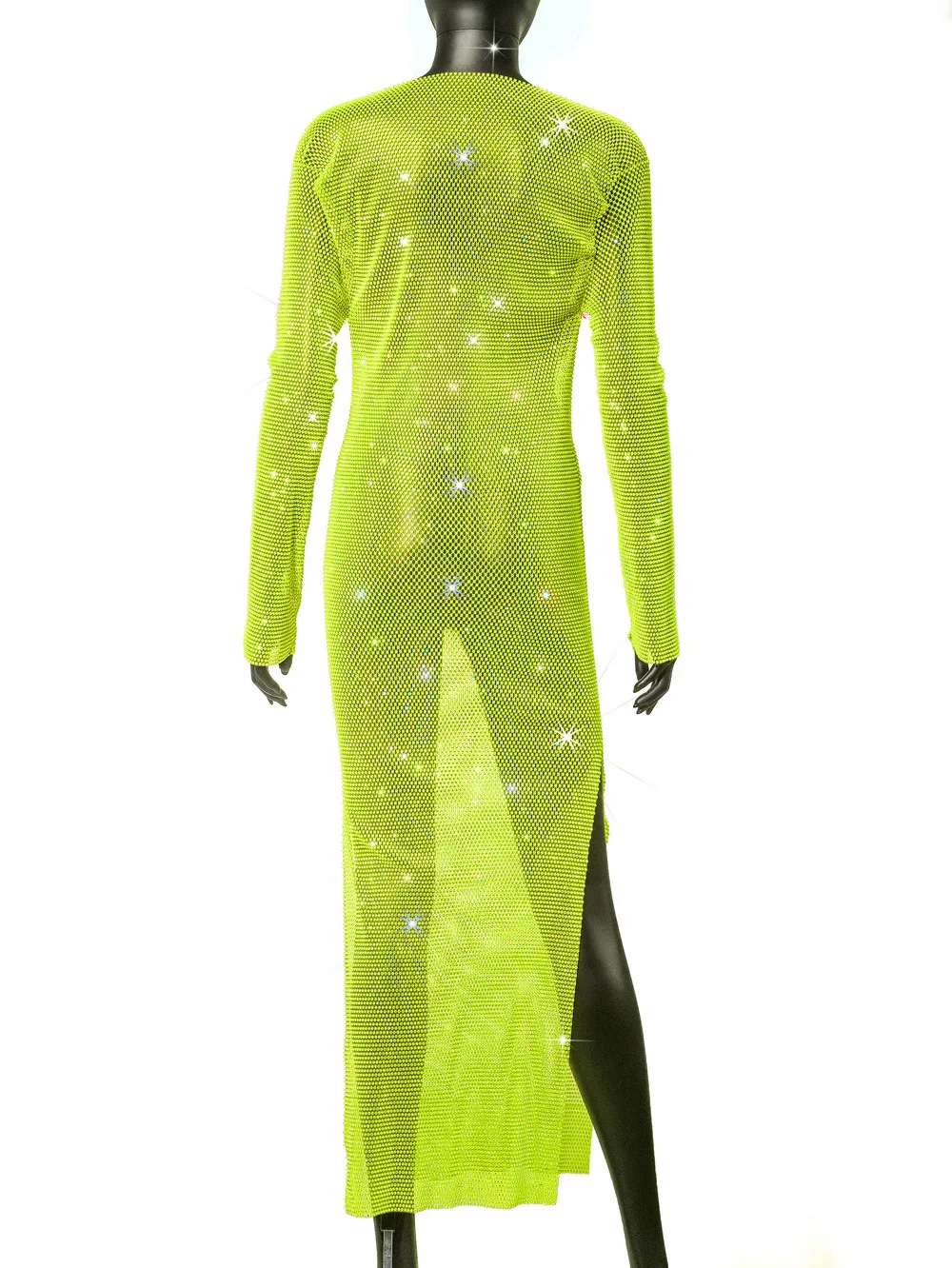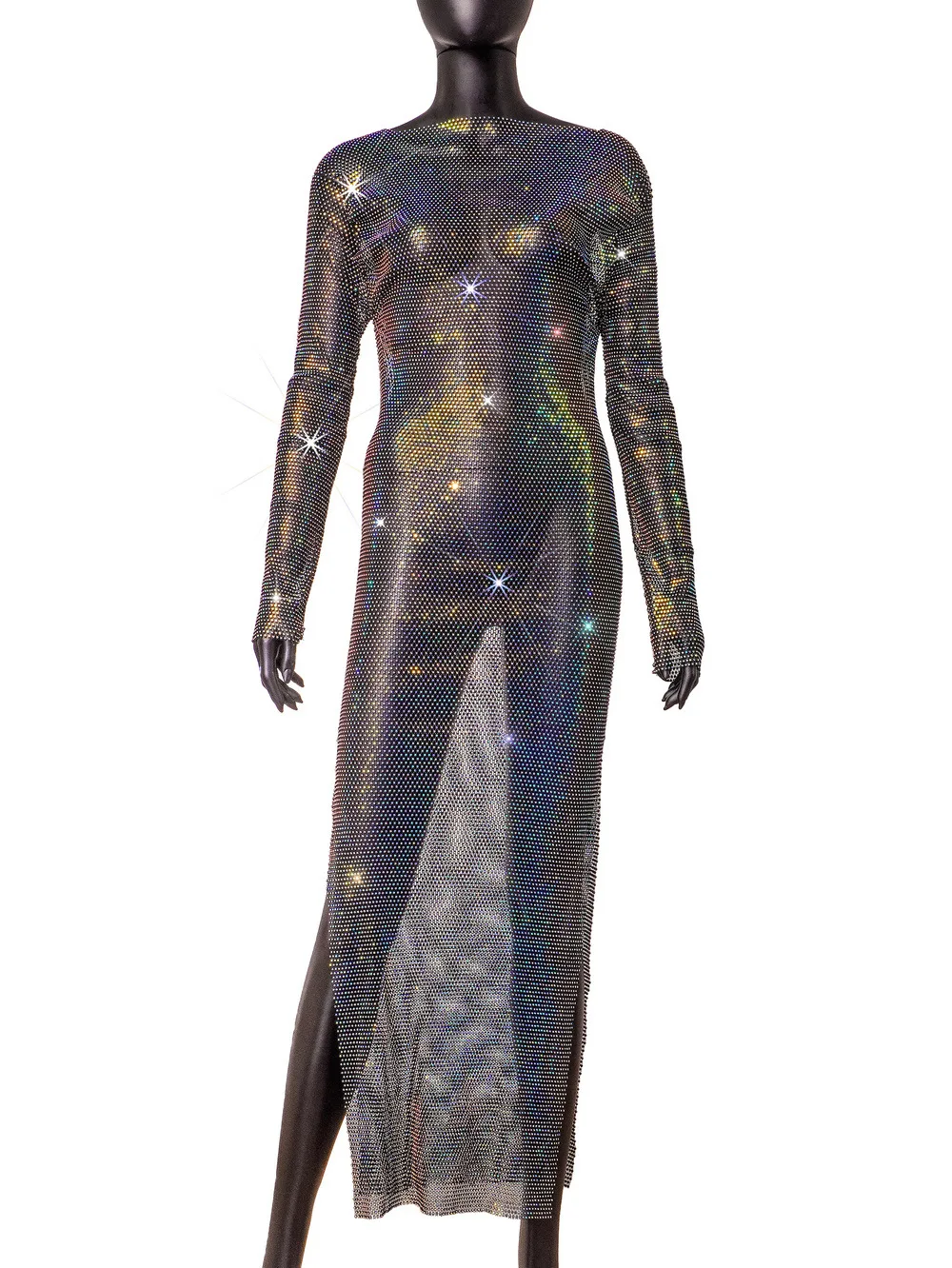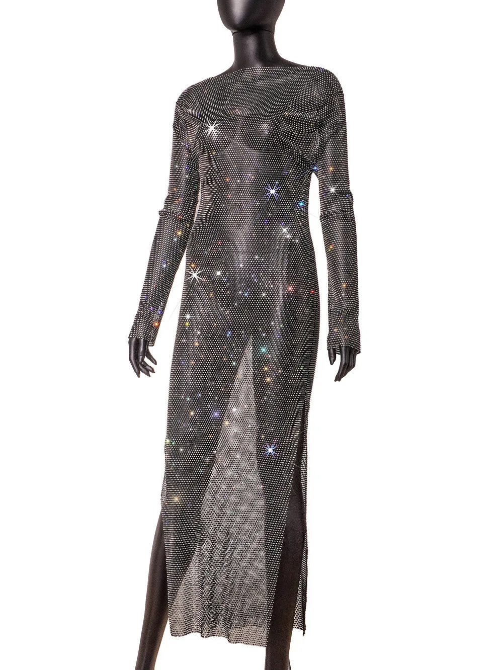 Shiny Rhinestone See Through Mesh Dress Women Sexy O Neck Split Long Sleeve Party Dresses Nightclub Cocktail Ladies Dress