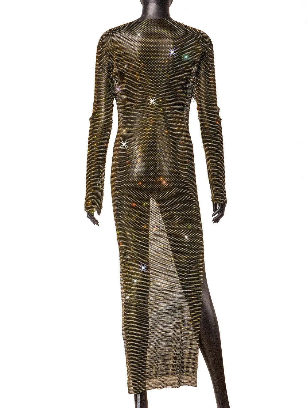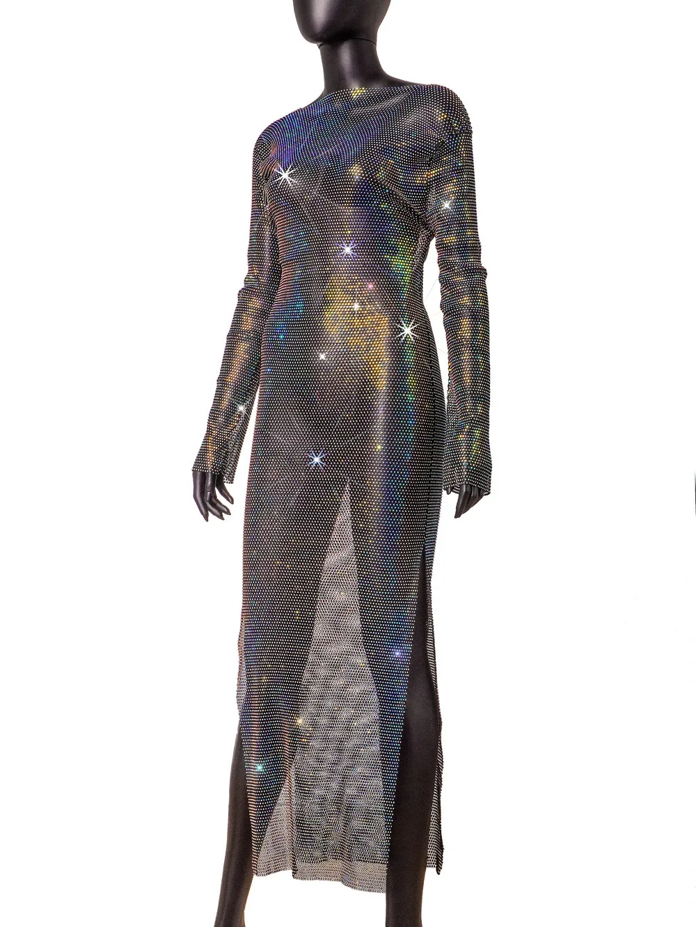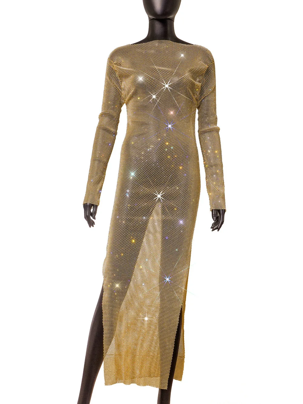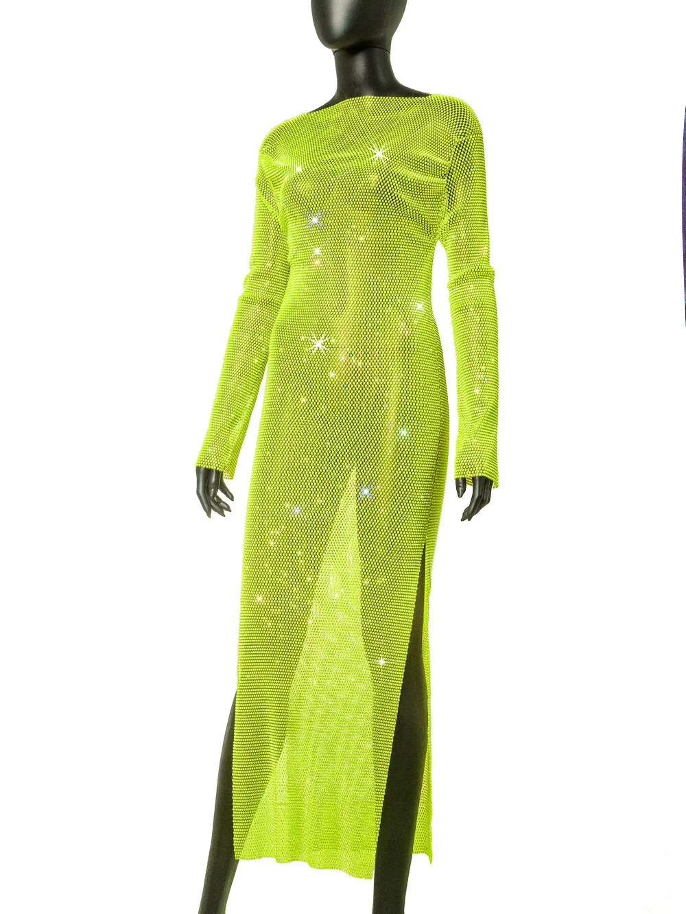 Shiny Rhinestone See Through Mesh Dress Women Sexy O Neck Split Long Sleeve Party Dresses Nightclub Cocktail Ladies Dress