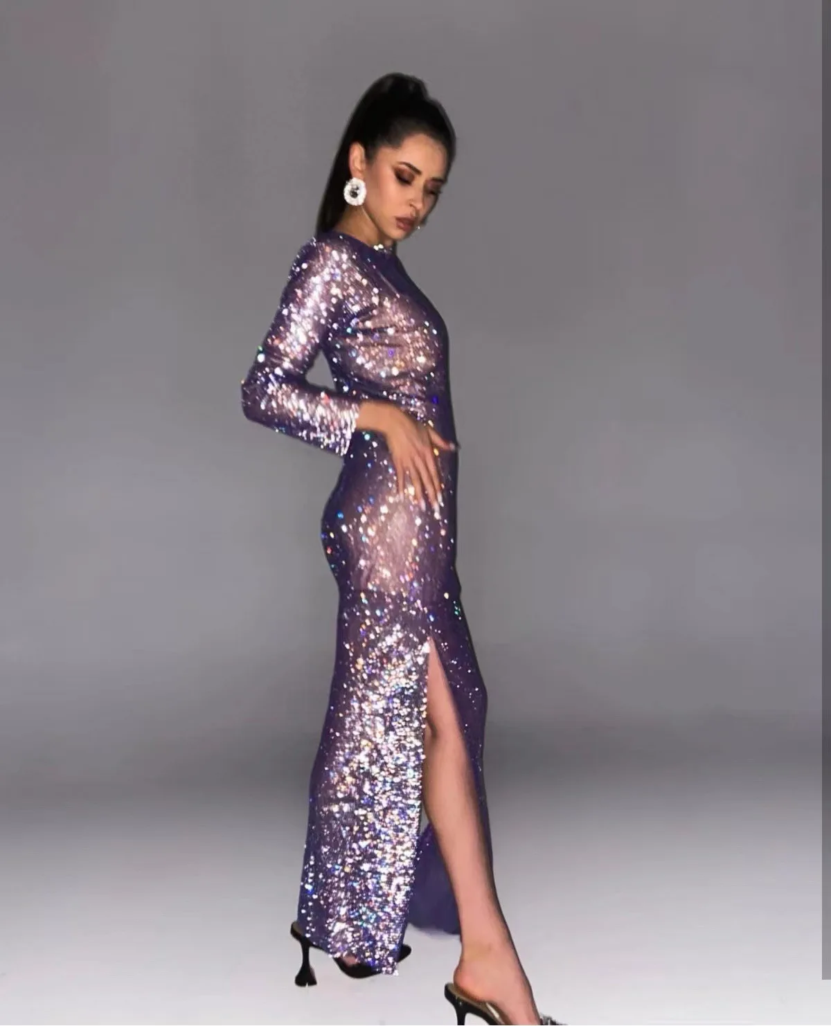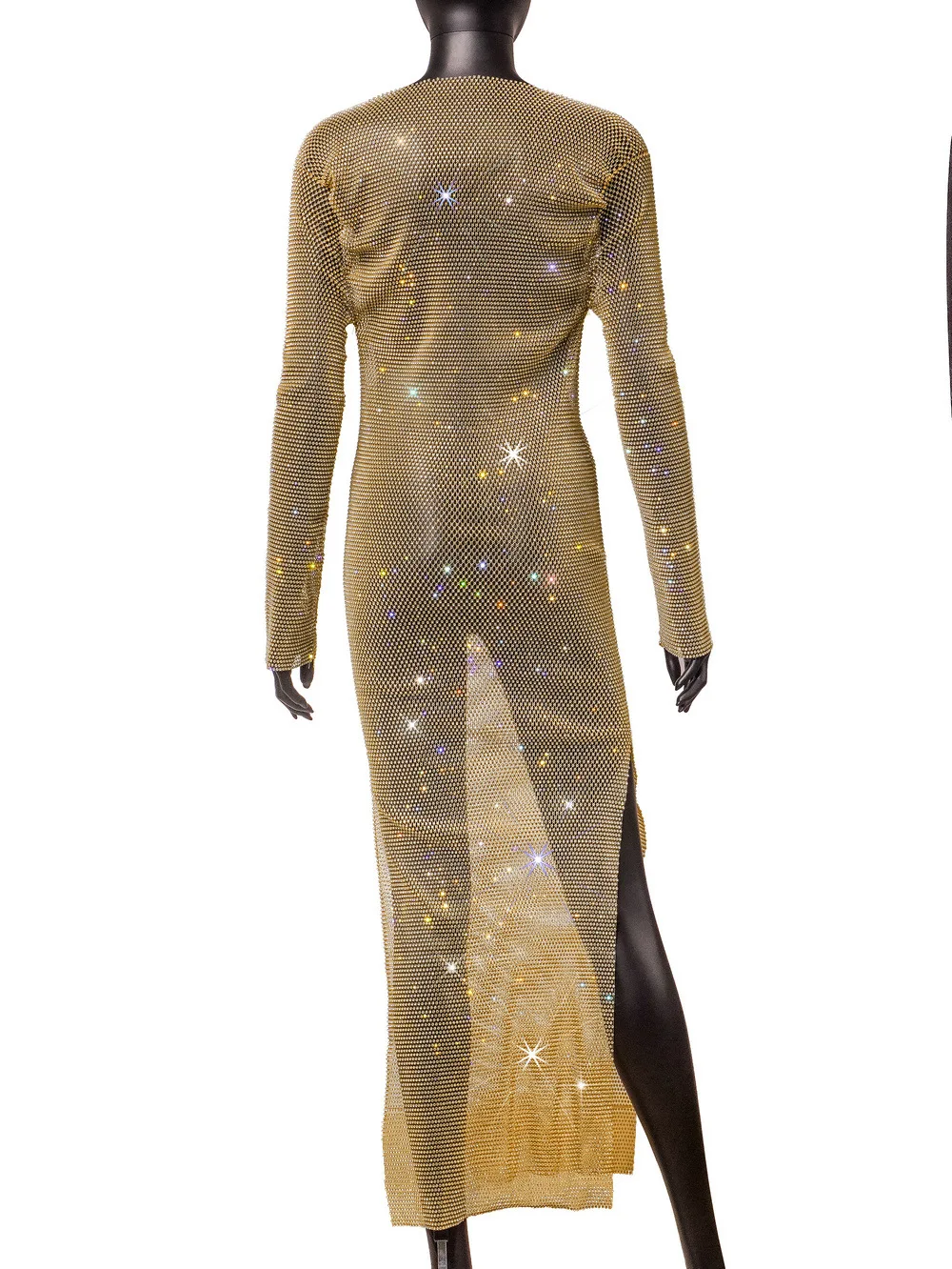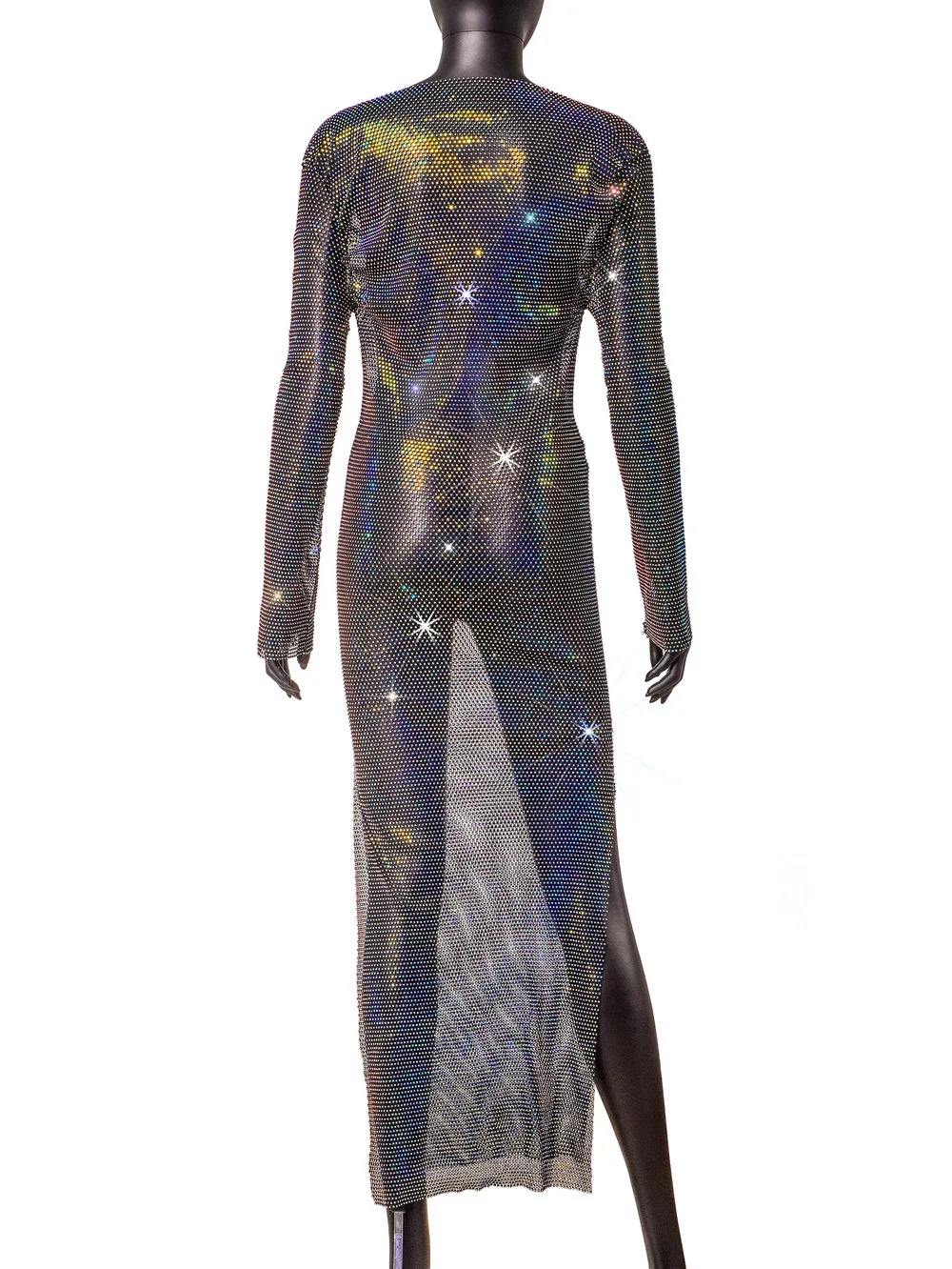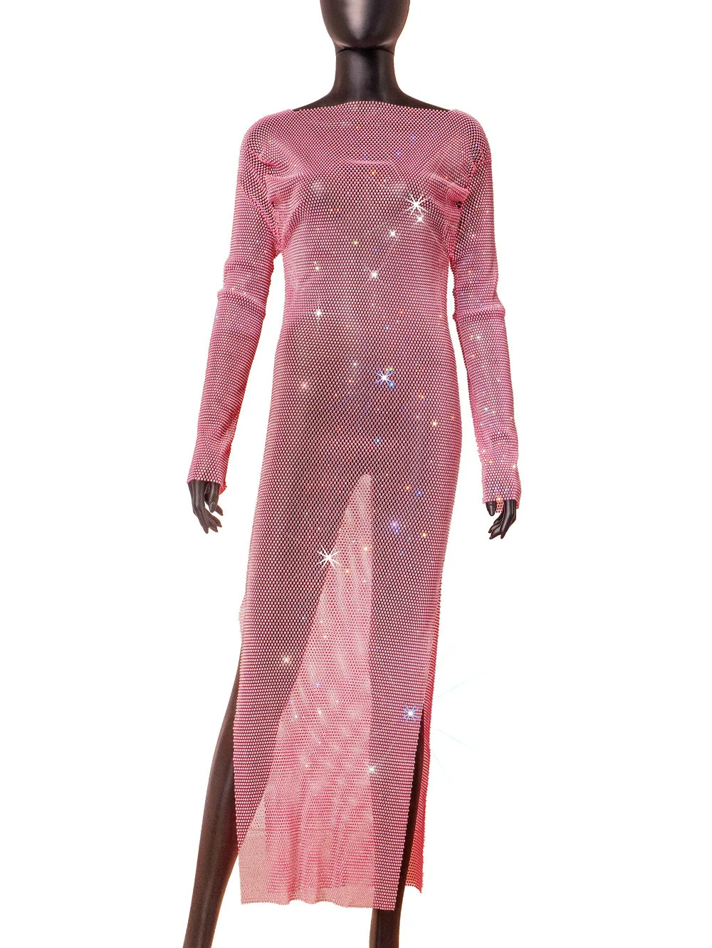 Shiny Rhinestone See Through Mesh Dress Women Sexy O Neck Split Long Sleeve Party Dresses Nightclub Cocktail Ladies Dress